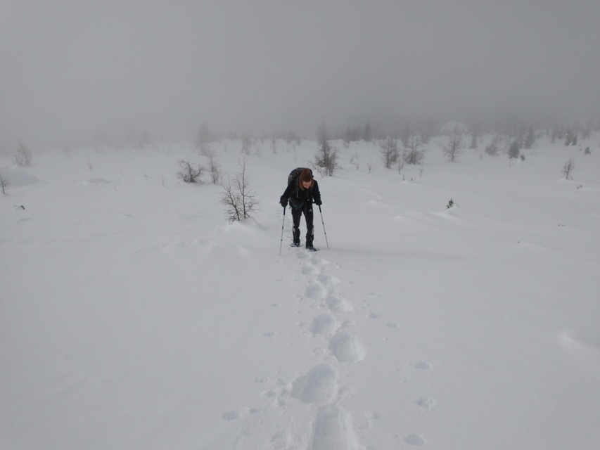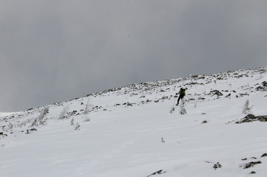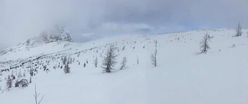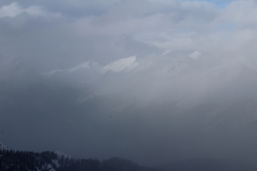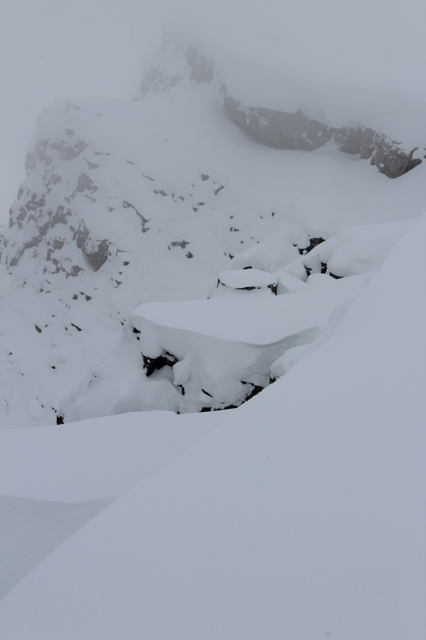 The bottom section of Mystic Peak is the last mountain we'd see, on the edge of the whiteout that blocked out all views to the south.