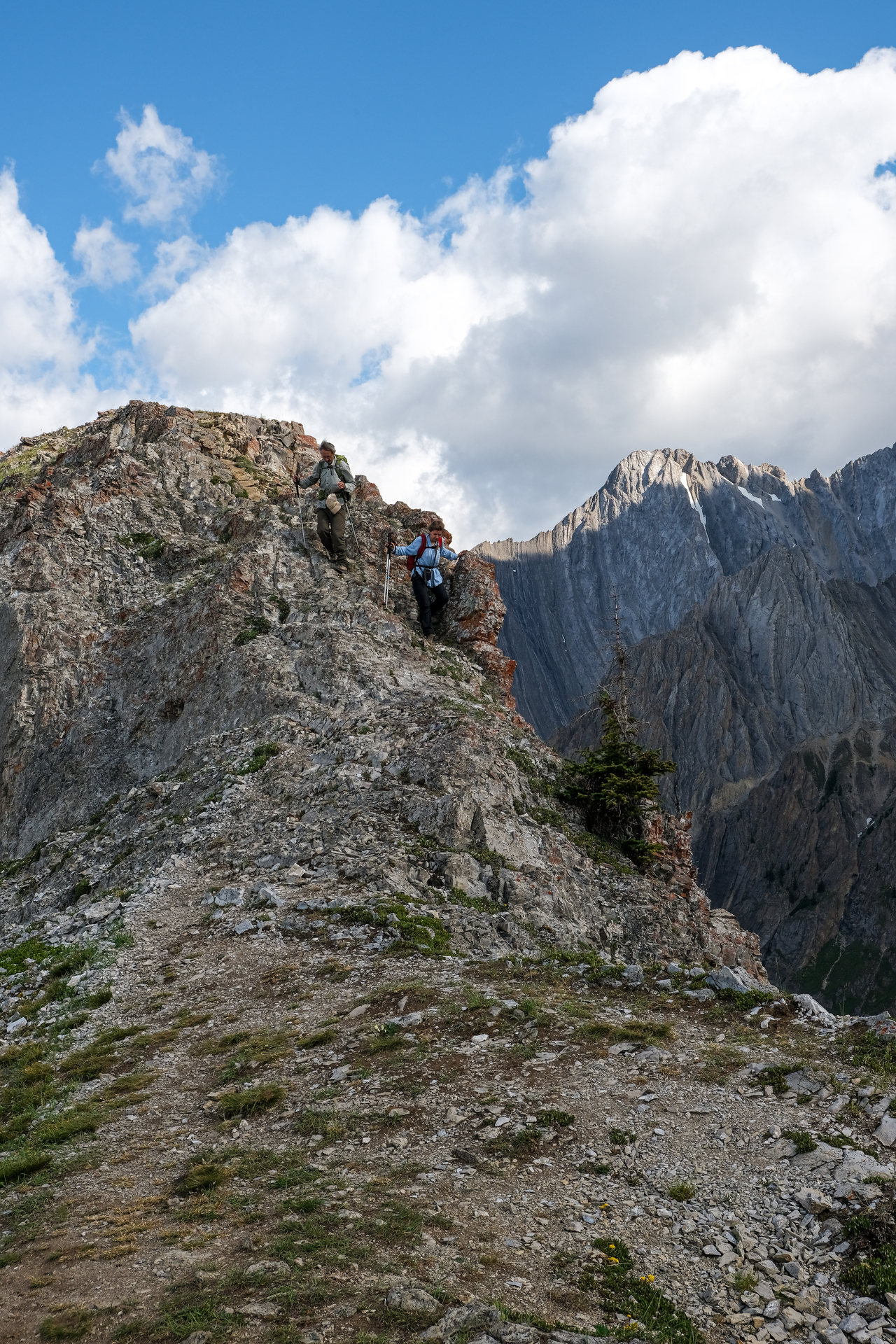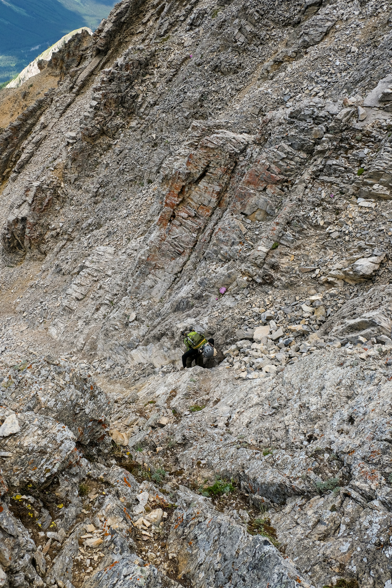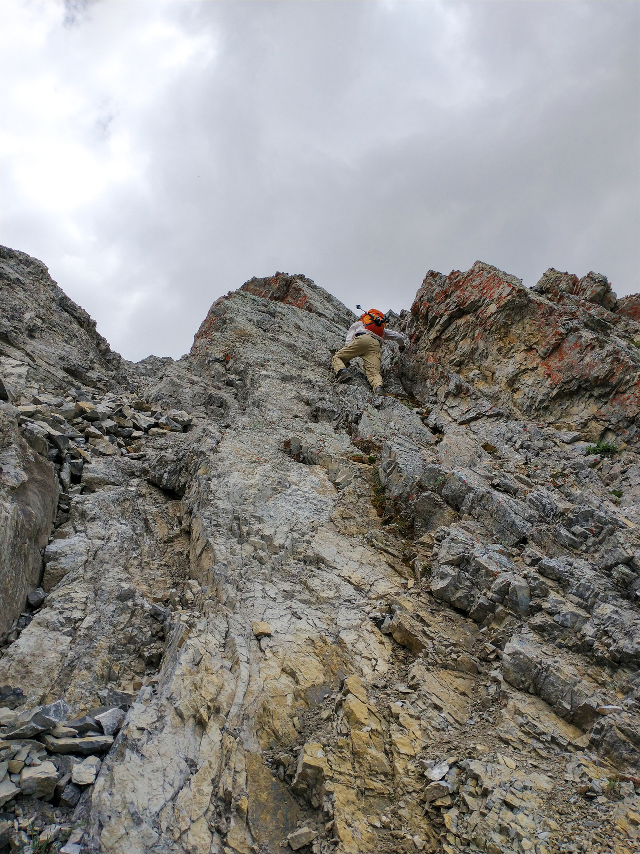 Finally getting our hands dirty as we ascend solid rock ribs. Photo credit: Dad