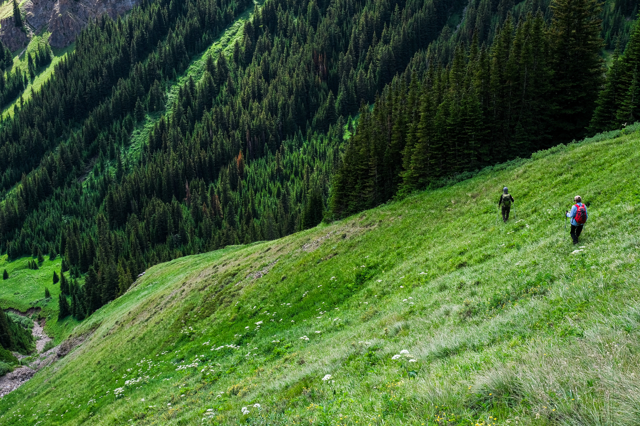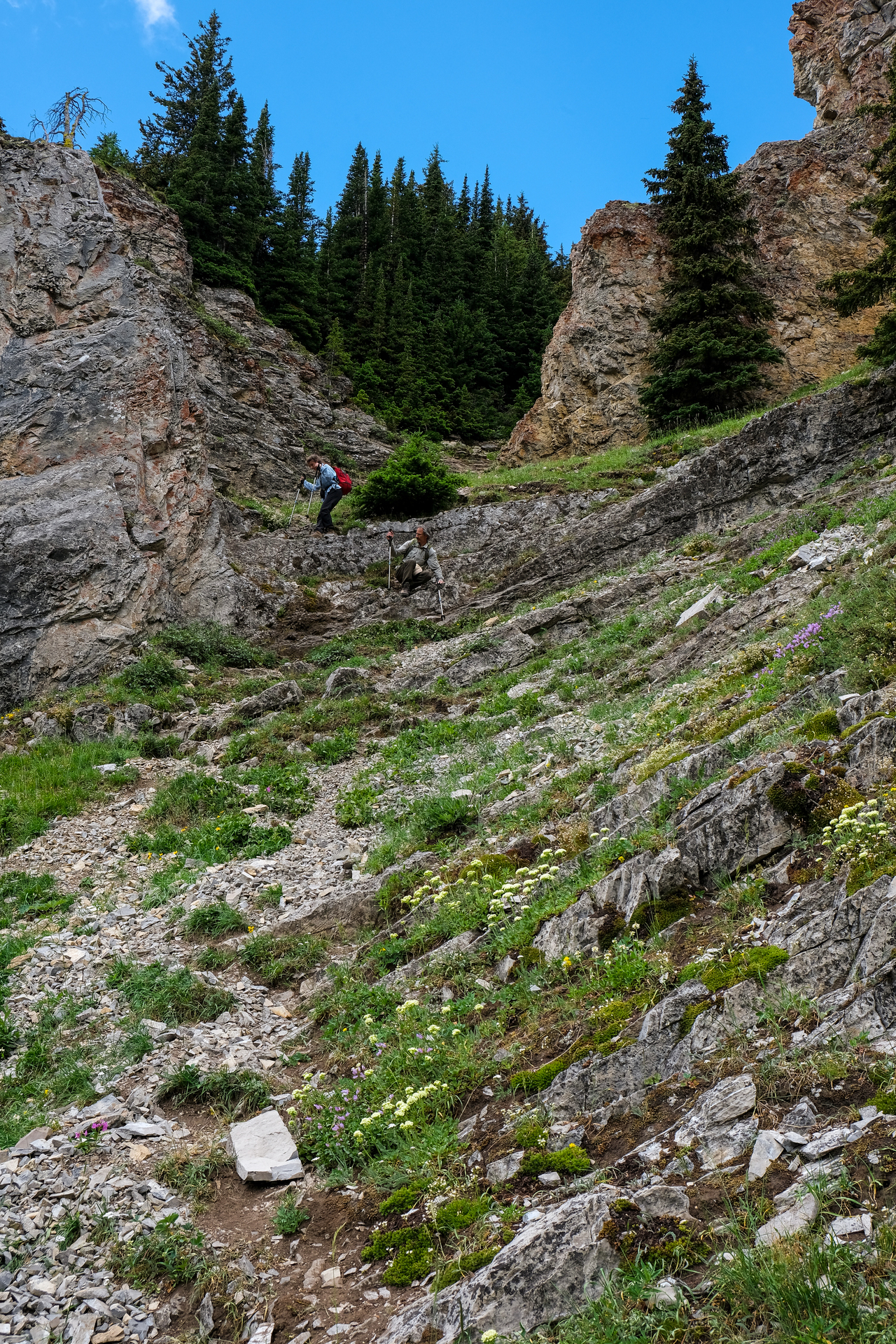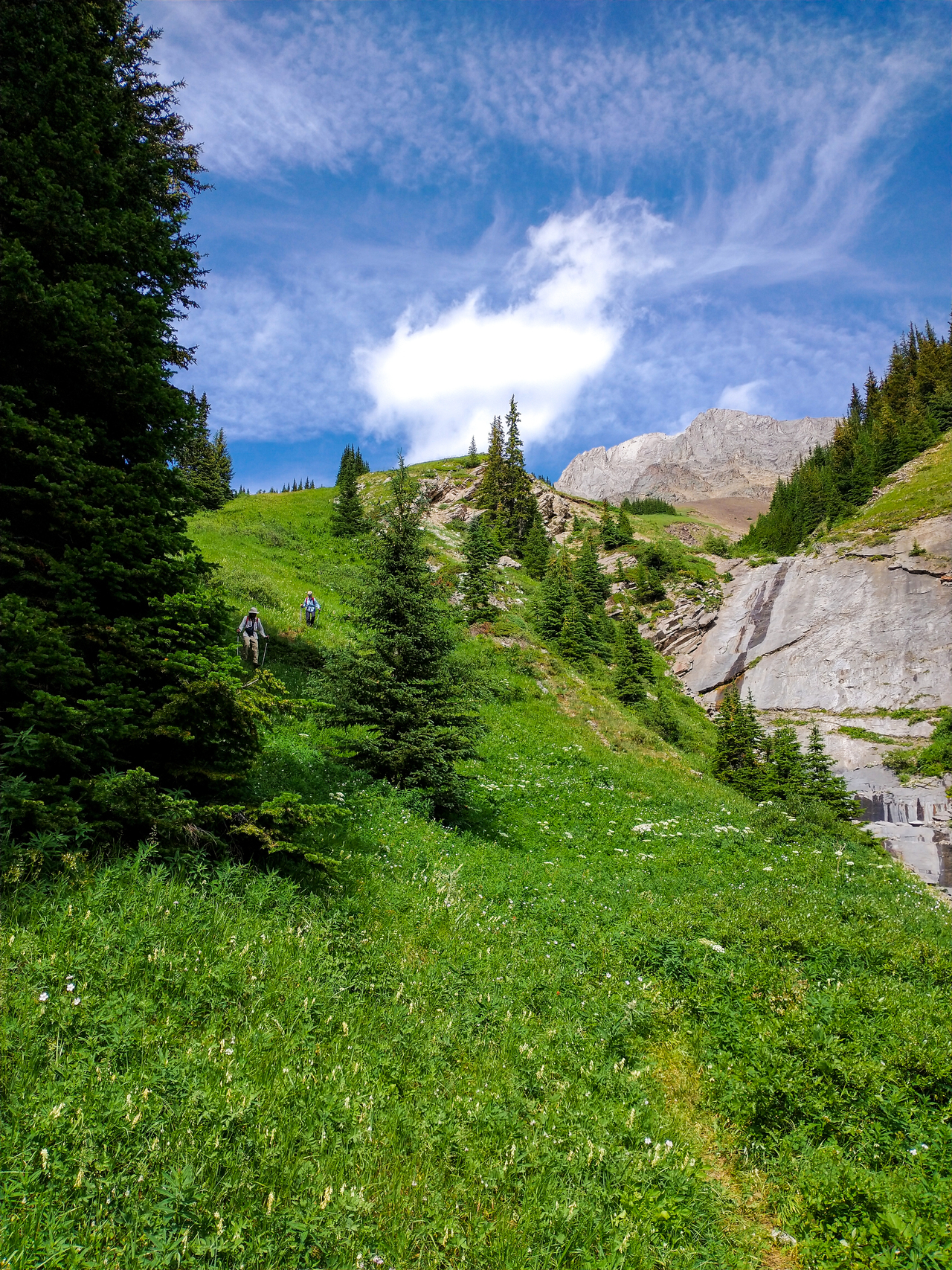 At the base of the second gully, a short series of rocky ledges took us down to the beautiful, meadowy slopes below the cliffs.