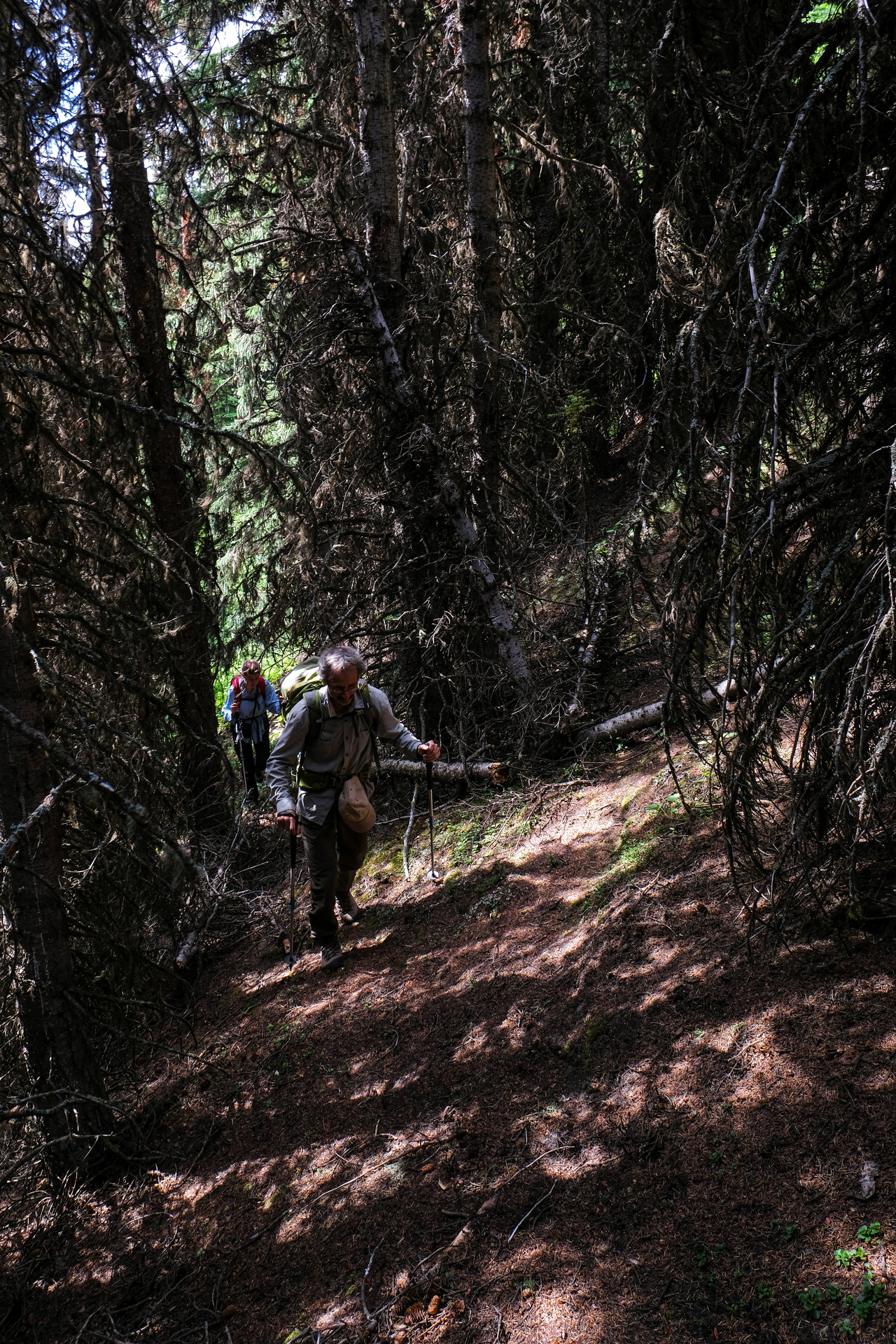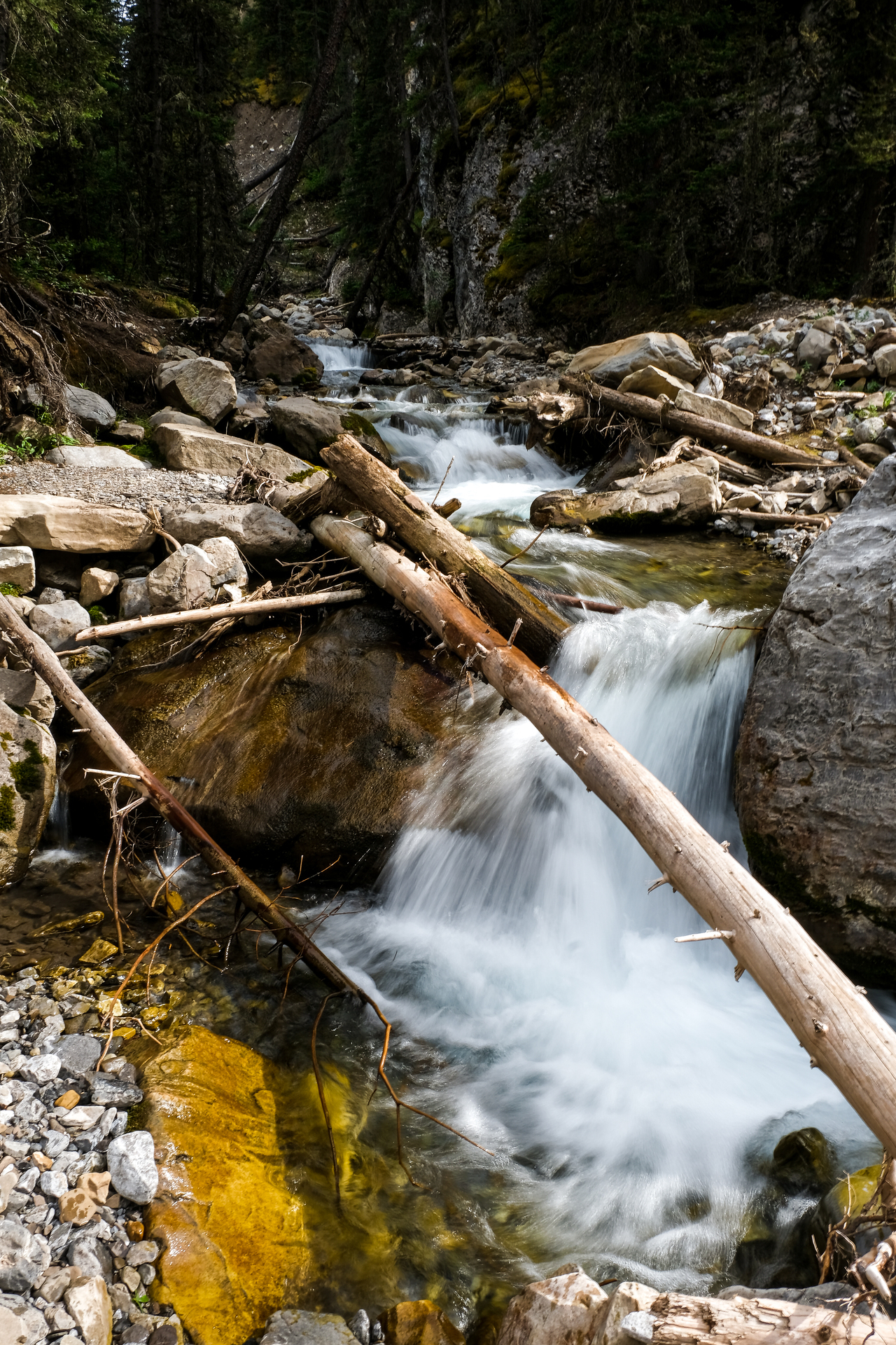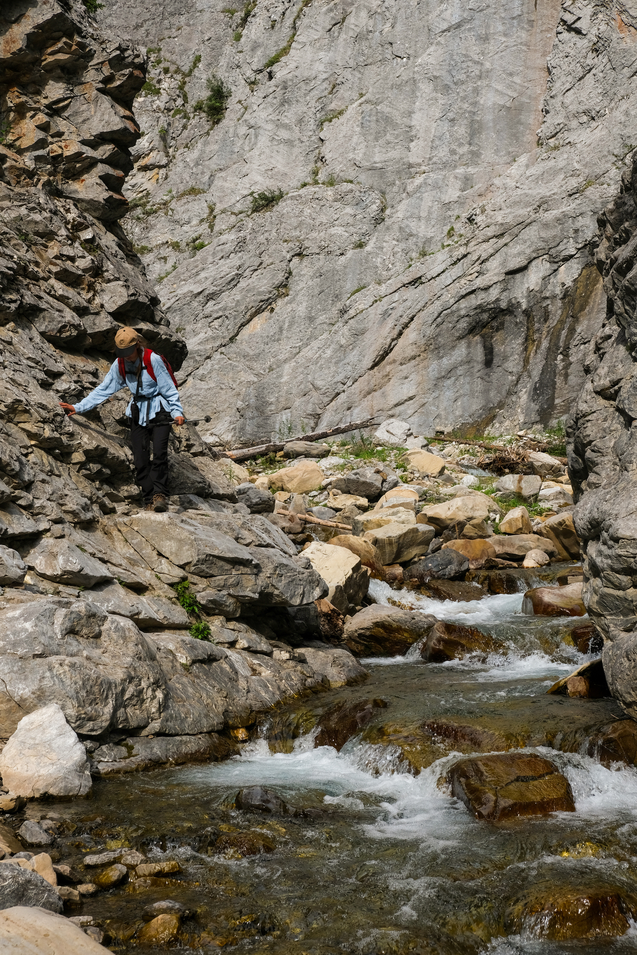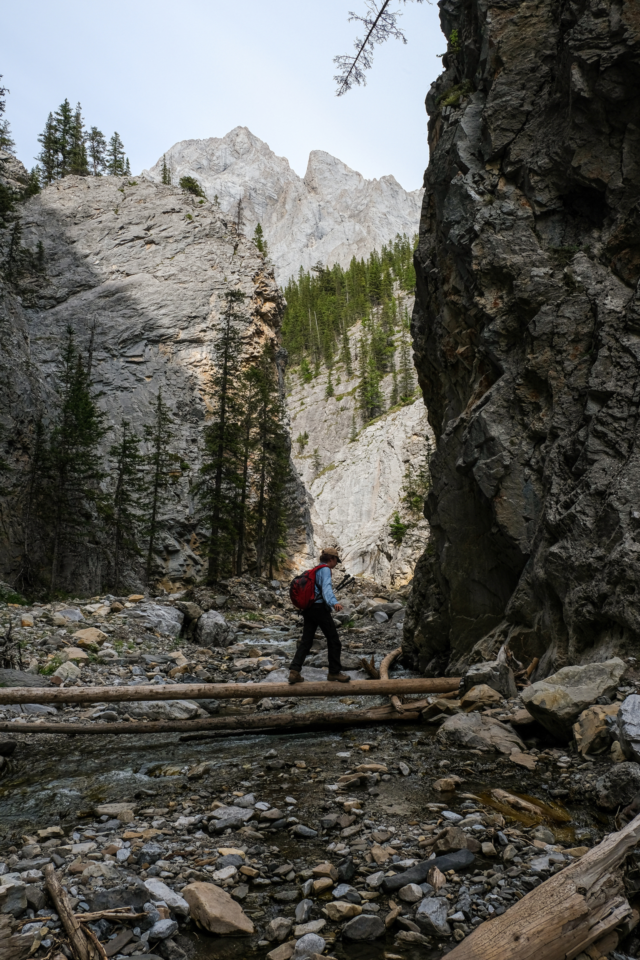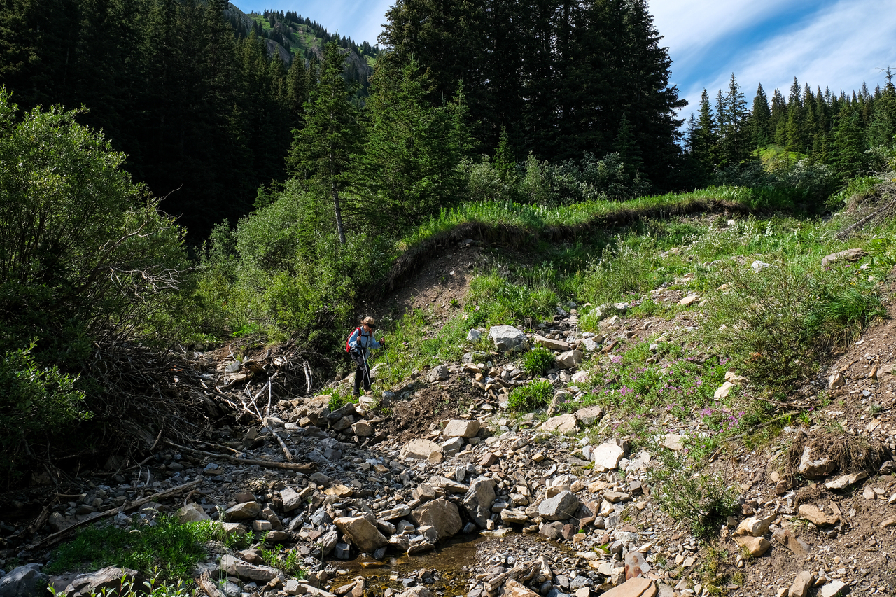 Eventually we reached a major junction, where we joined up with the west fork of King Creek, and followed it out for the final couple kilometers to the highway. We had a few "close calls" thinking the canyon-like drainage would force us to get our feet wet, but we got lucky time and time again, hugging the steep walls on narrow ledges, and balancing across countless fallen logs.