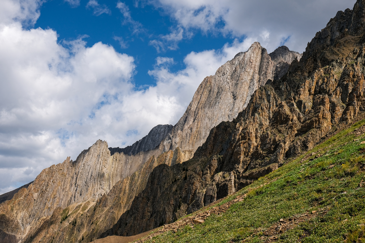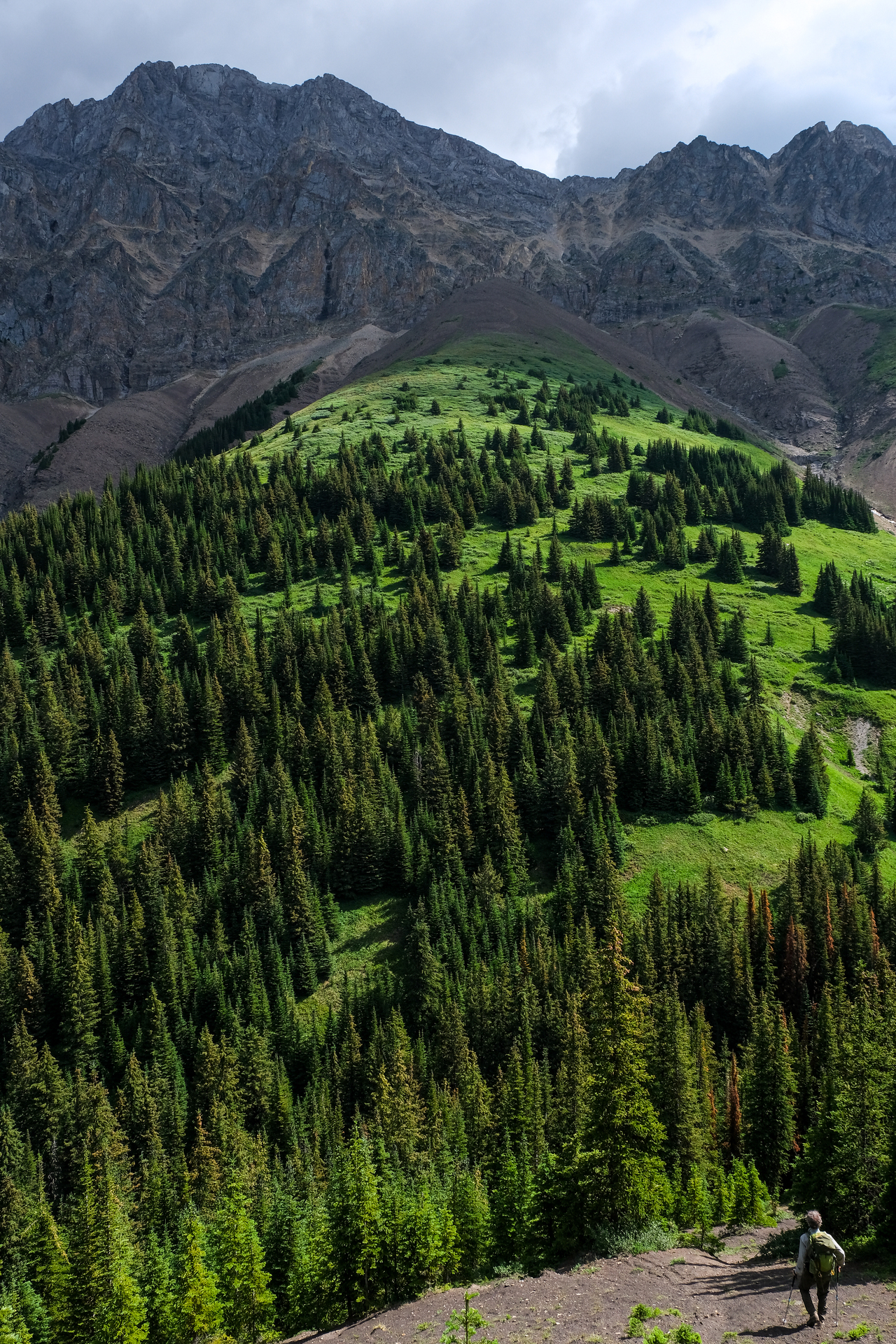 Having no need to reascend KCR, we decided to try and reverse Kane's alternate ascent route, and started down the meadowy slopes, aiming for the valley sandwiched between KCR and the impressive Opal Range Peaks.