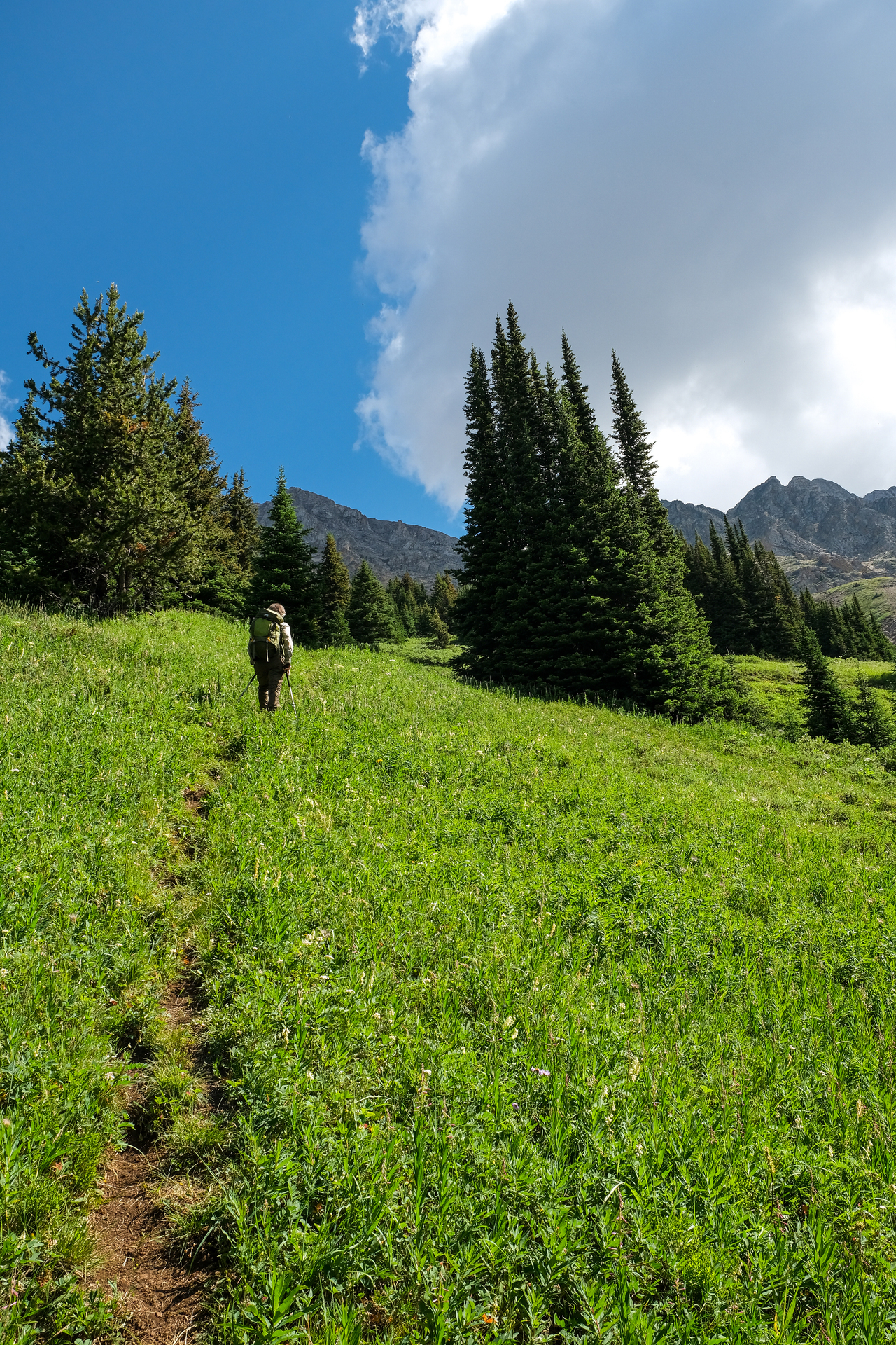 Having no need to reascend KCR, we decided to try and reverse Kane's alternate ascent route via King Creek, and started down the meadowy slopes, aiming for the valley sandwiched between KCR and the impressive Opal Range peaks. Grassy slopes to skier's right of a significant drainage easily lead us down to the valley bottom, where we discovered a faint trail leading through the beautiful meadow.