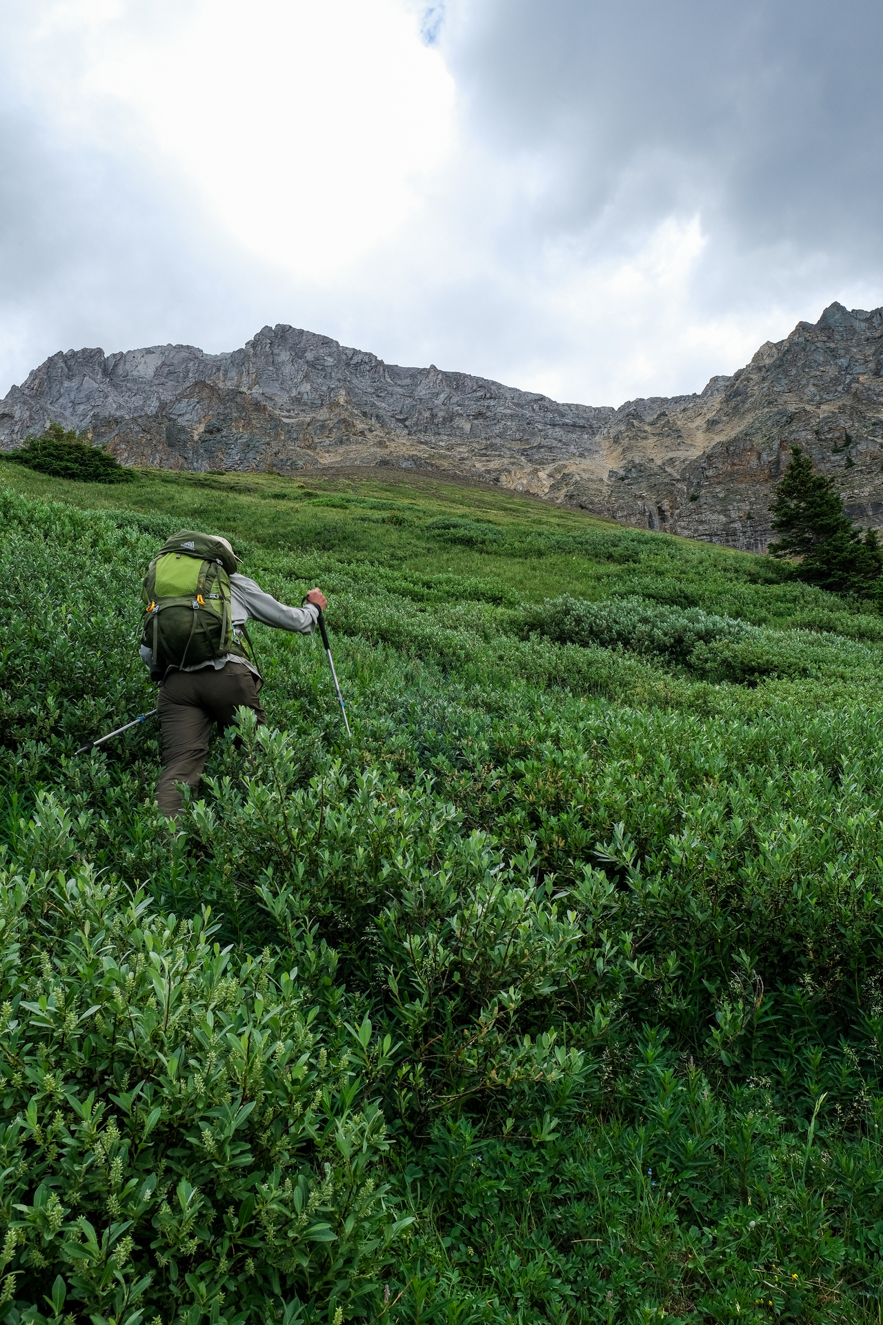 We continued angling through the cliff band, easily following another loose gully down, at which point a short series of rocky ledges then took us down to the beautiful, meadowy slopes below the cliffs. Since our gully route angled away from the saddle, we now had to traverse back to our left to reach it, and while we did encounter our share of bush, this traverse was generally open, and easy to navigate and it wasn't long before we exited the bush and found ourselves directly above the grassy saddle.
