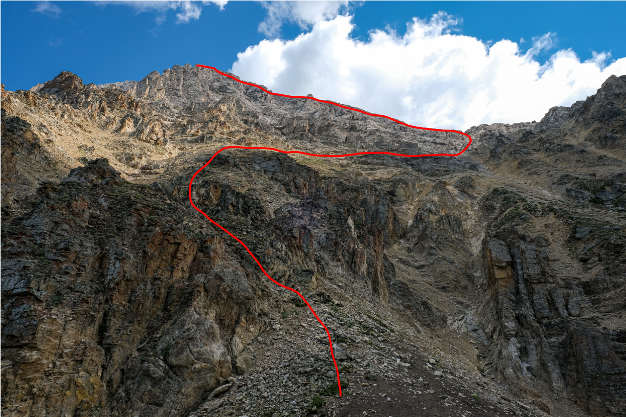 Looking back across the saddle, to KCR's seemingly impassible summit cliffs. But don't worry, it's not as bad as it looks! (Approximate route shown.)