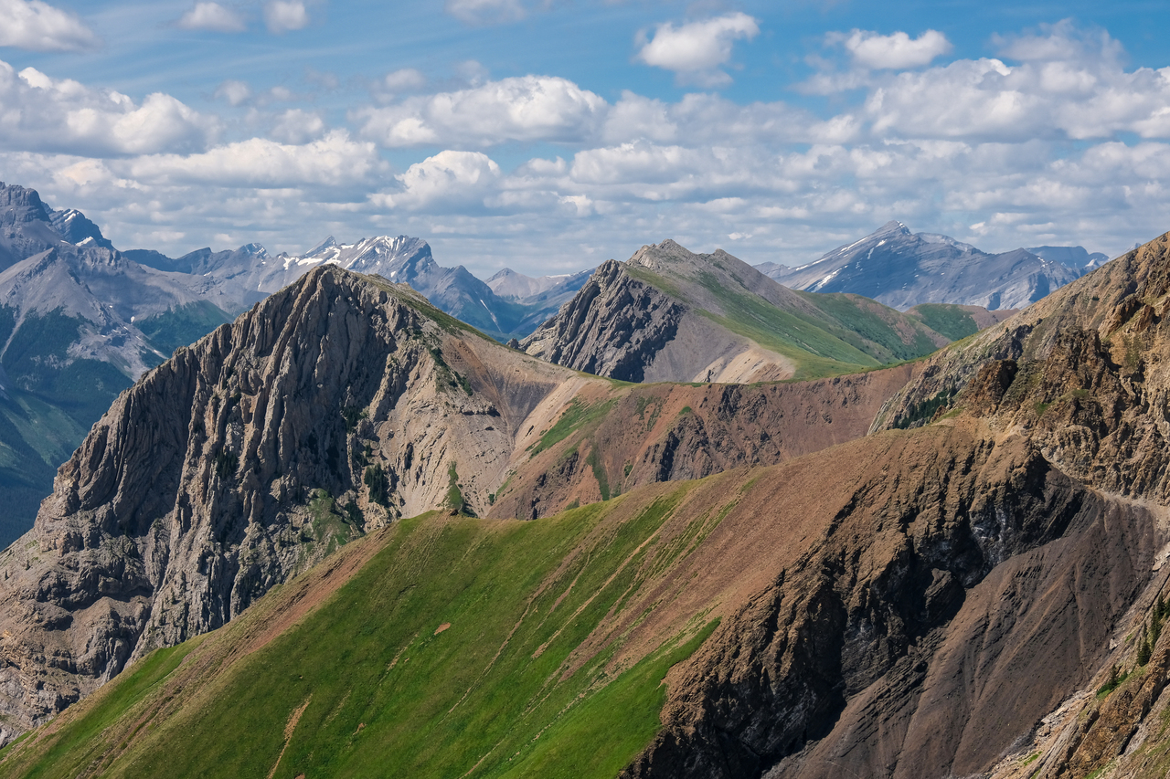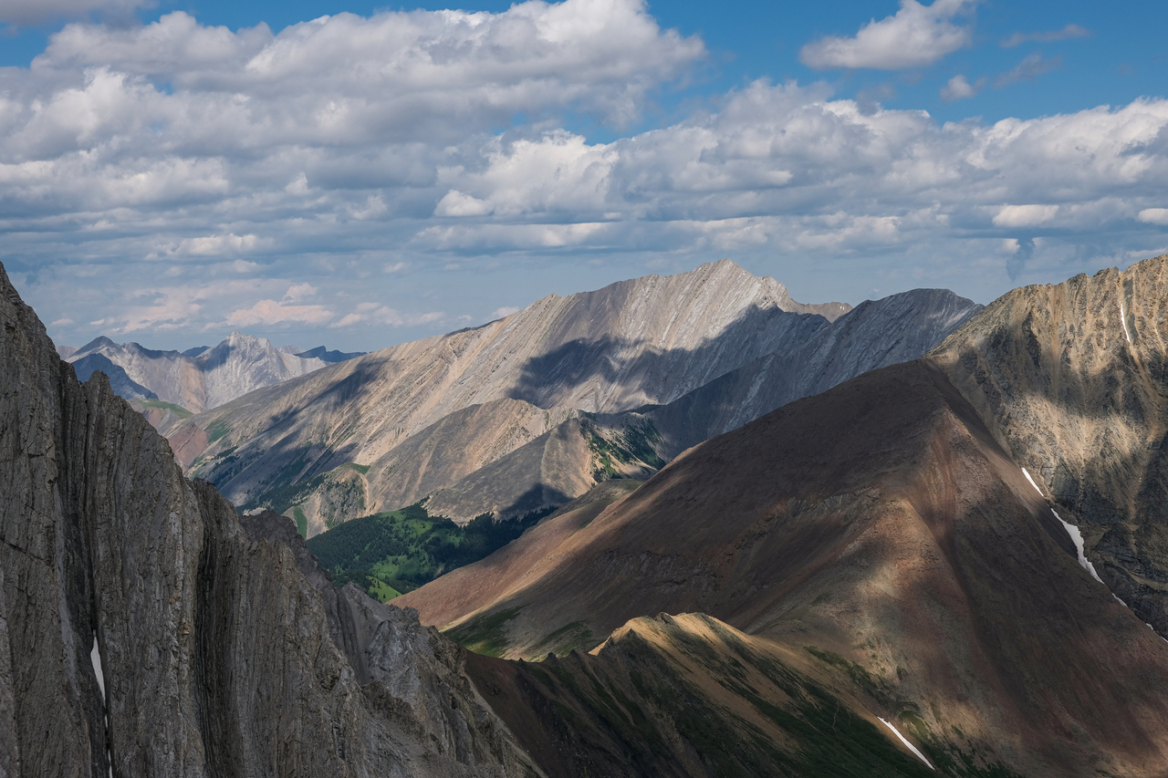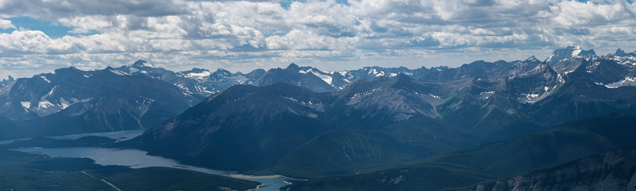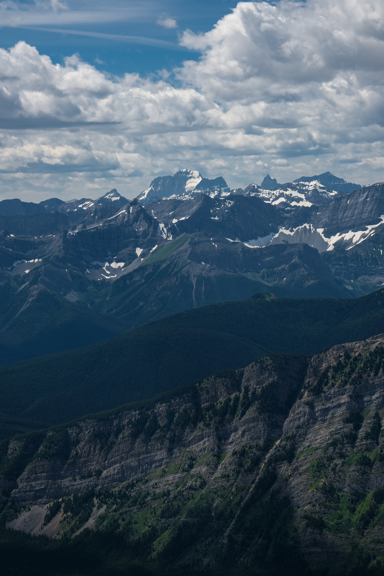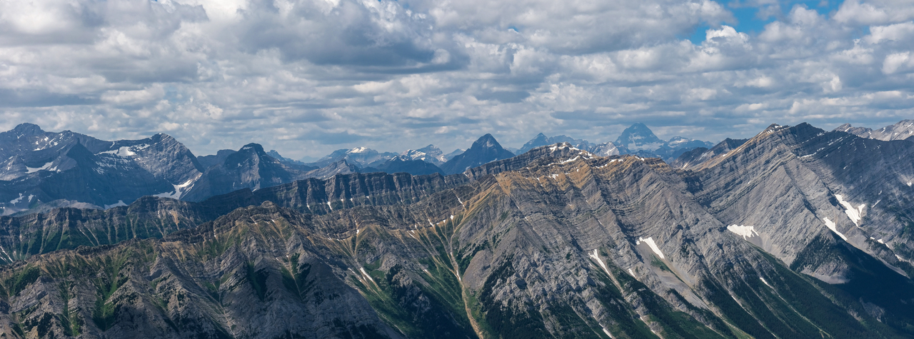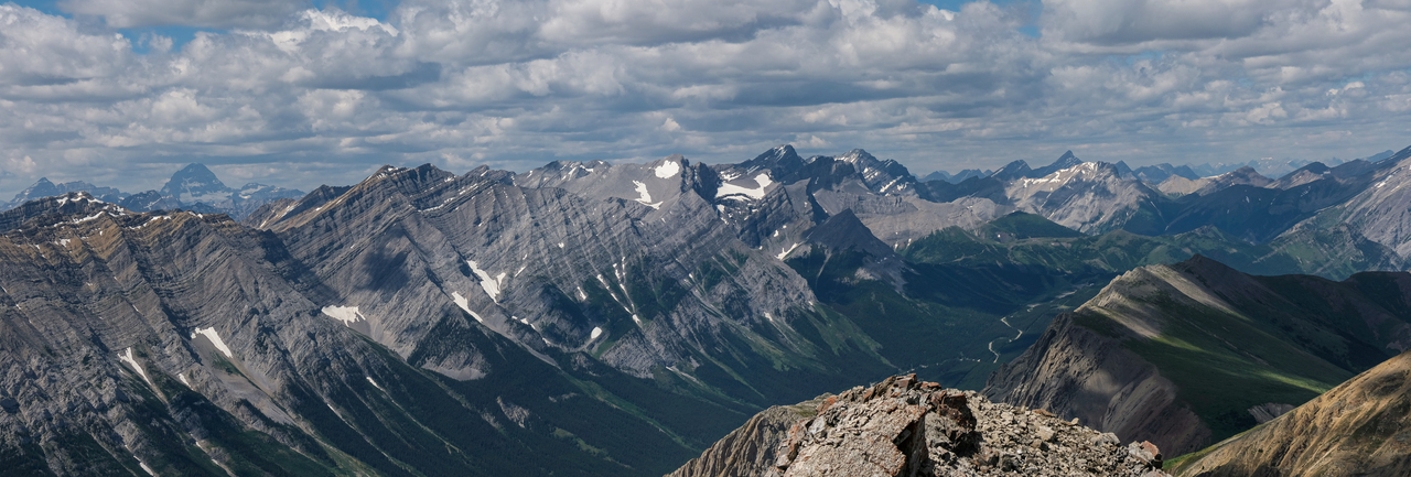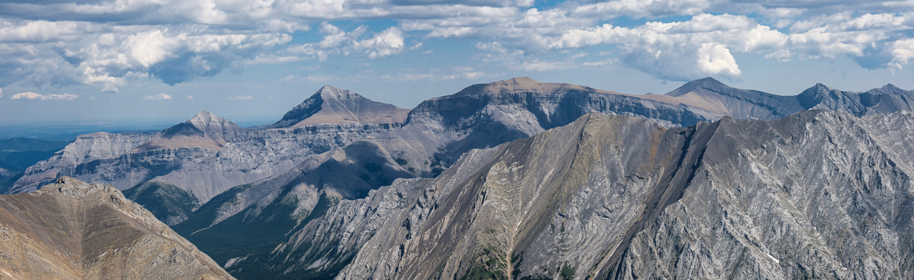 Incredible view, looking south, along the Opal Range! Tombstone, Rae (distant), Brock and Blane (stacked up), Pocaterra (distant), Wintour, and the unmistakable Mount Joffre towering over the Kananaskis Lakes (L to R).