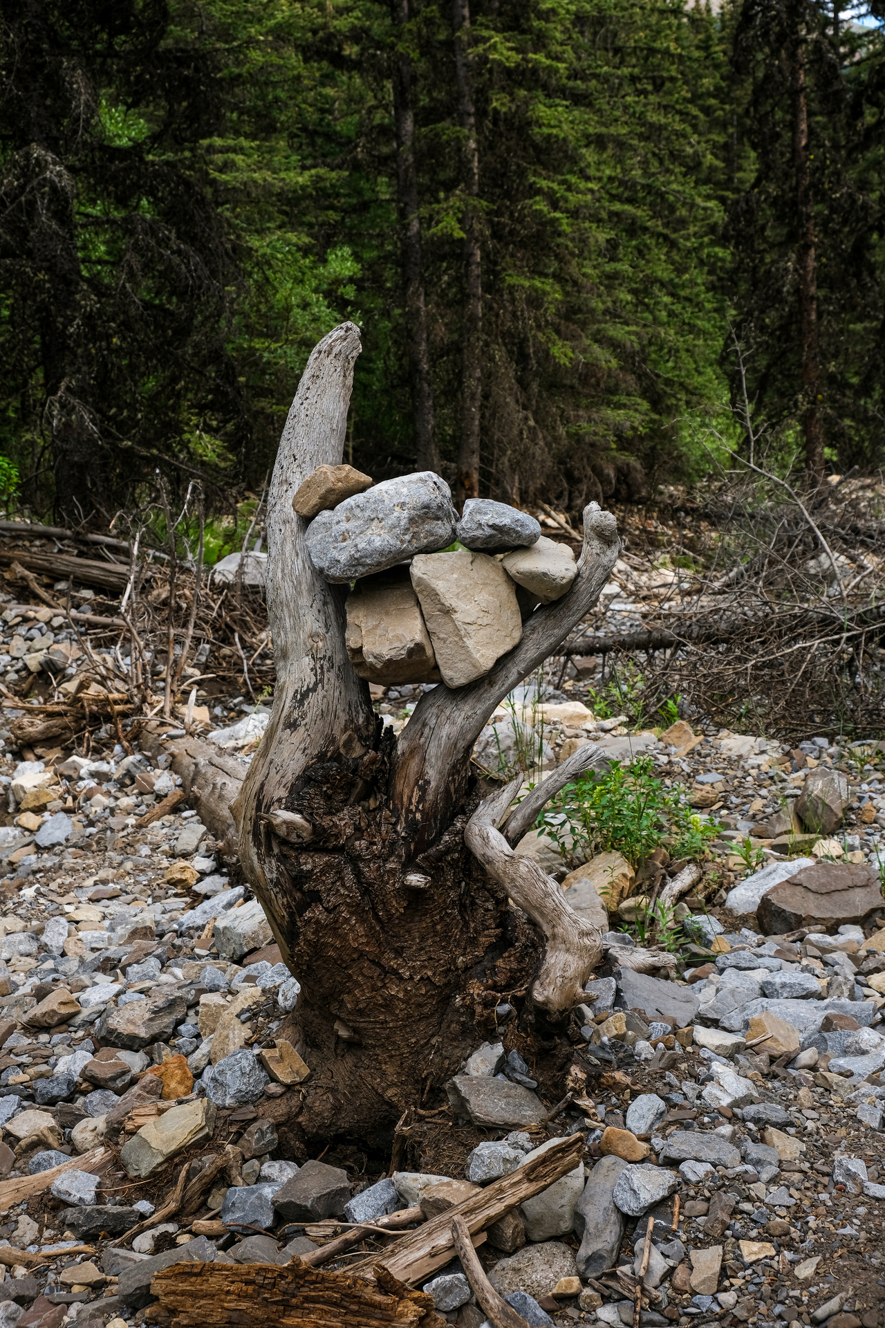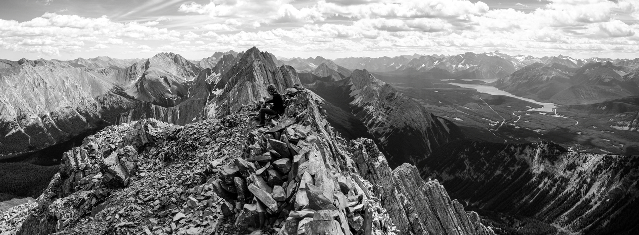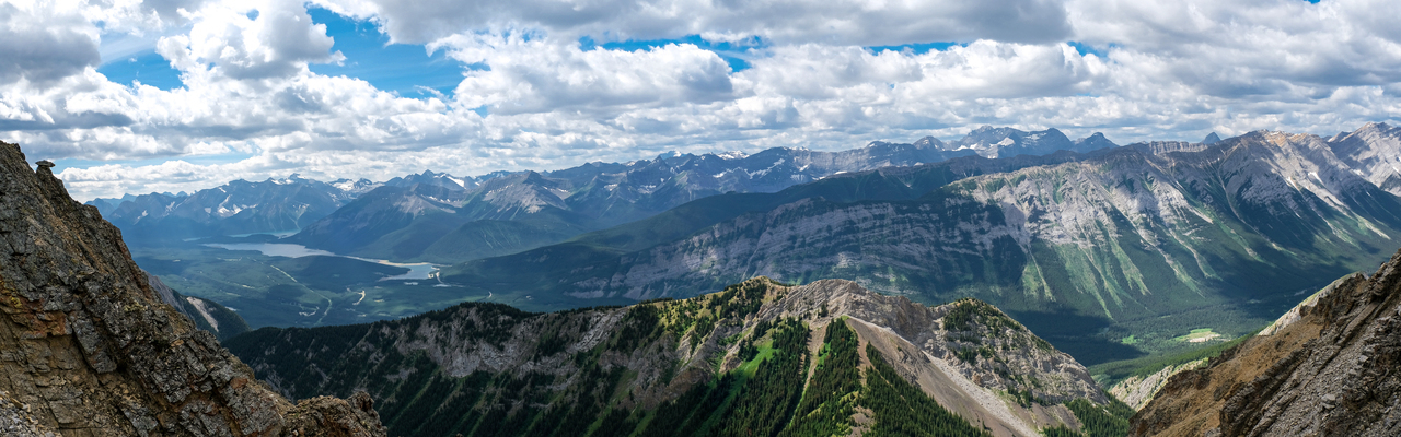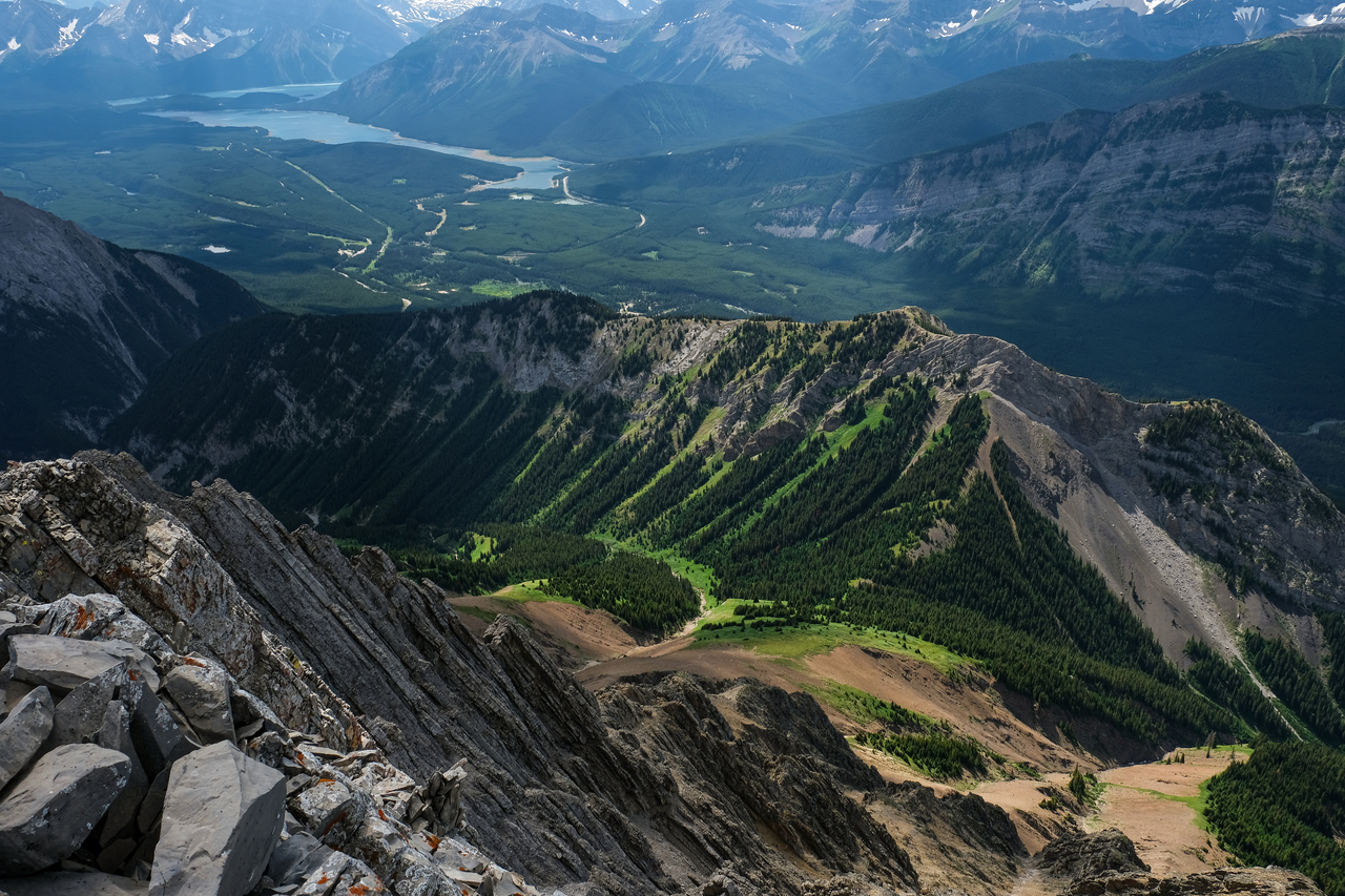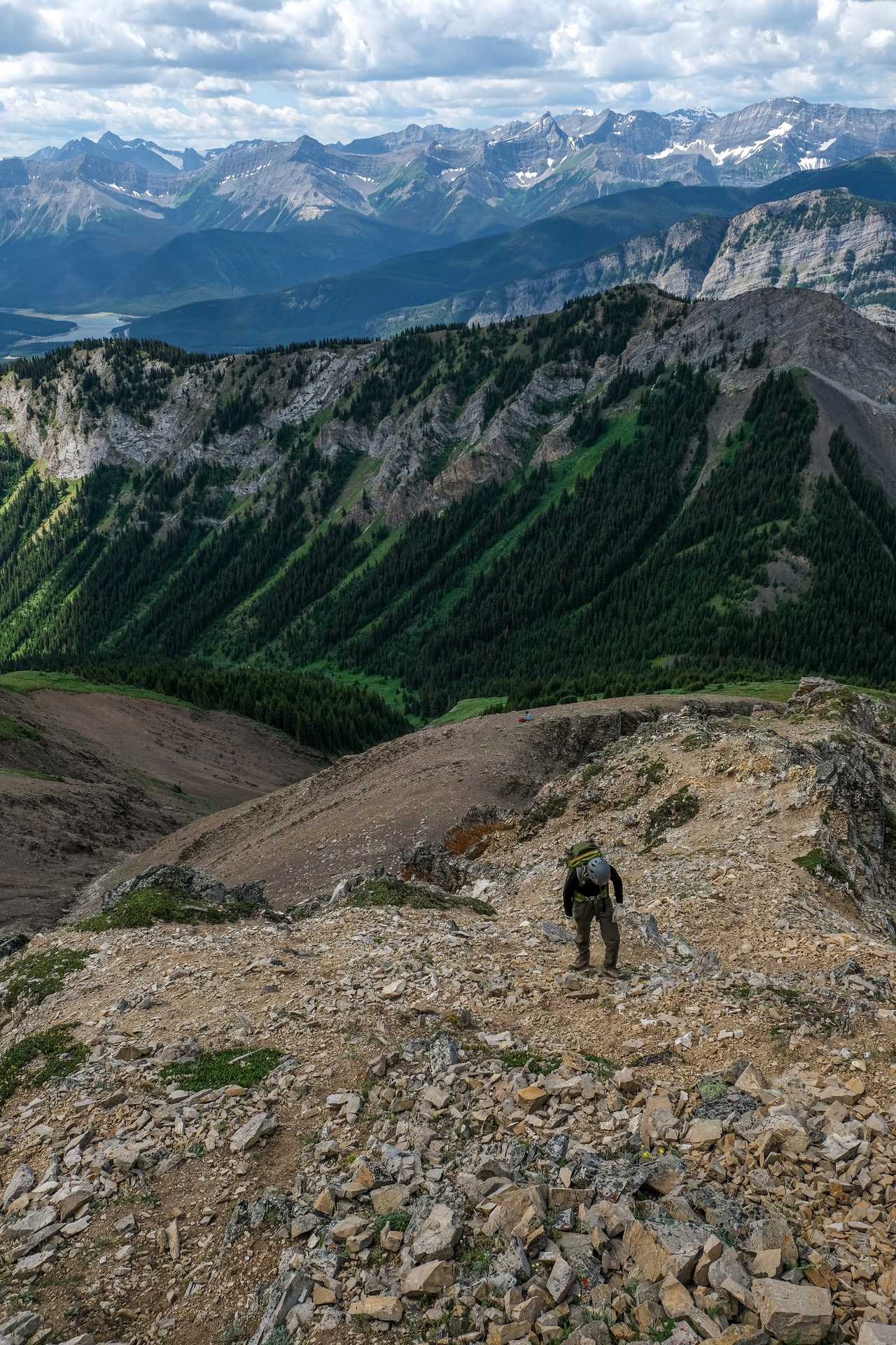 Beautiful views back to the west, with Kananaskis Lakes on one end and Lawson's lengthy ridge stretching out on the other! Also, check out the precariously stacked rock, balancing on the left side of the frame!
