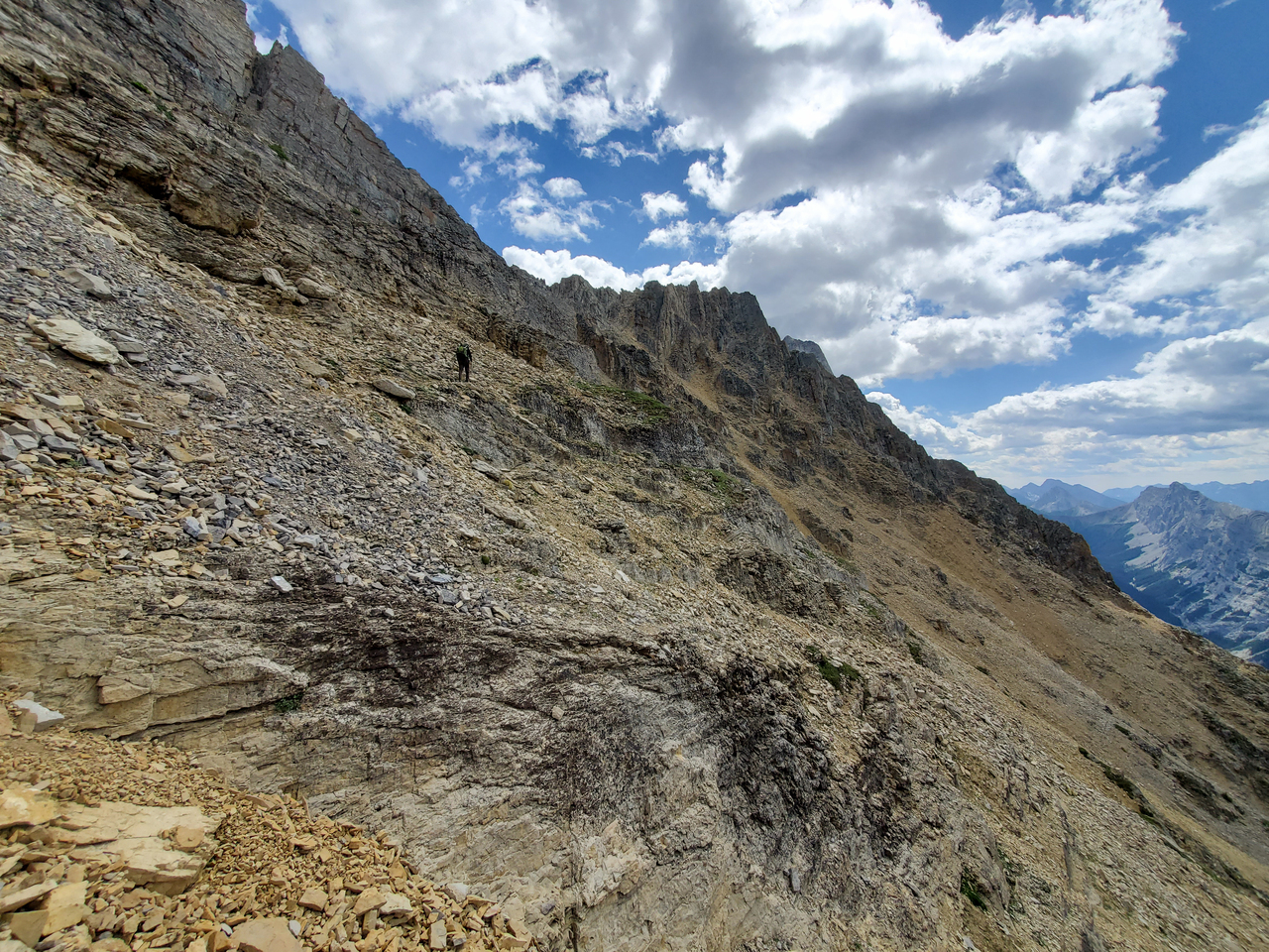 Looking ahead to the summit. An easy scree ledge by-passes a very gnarly, exposed ridge.