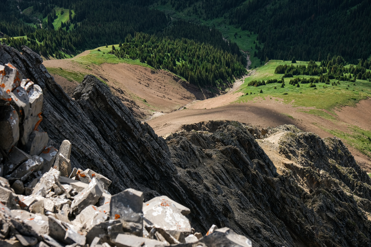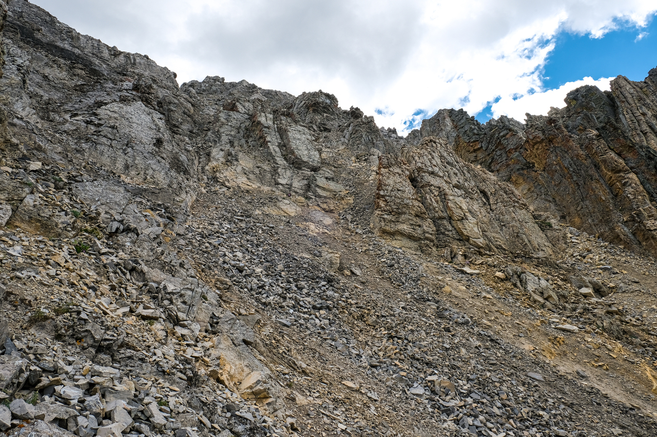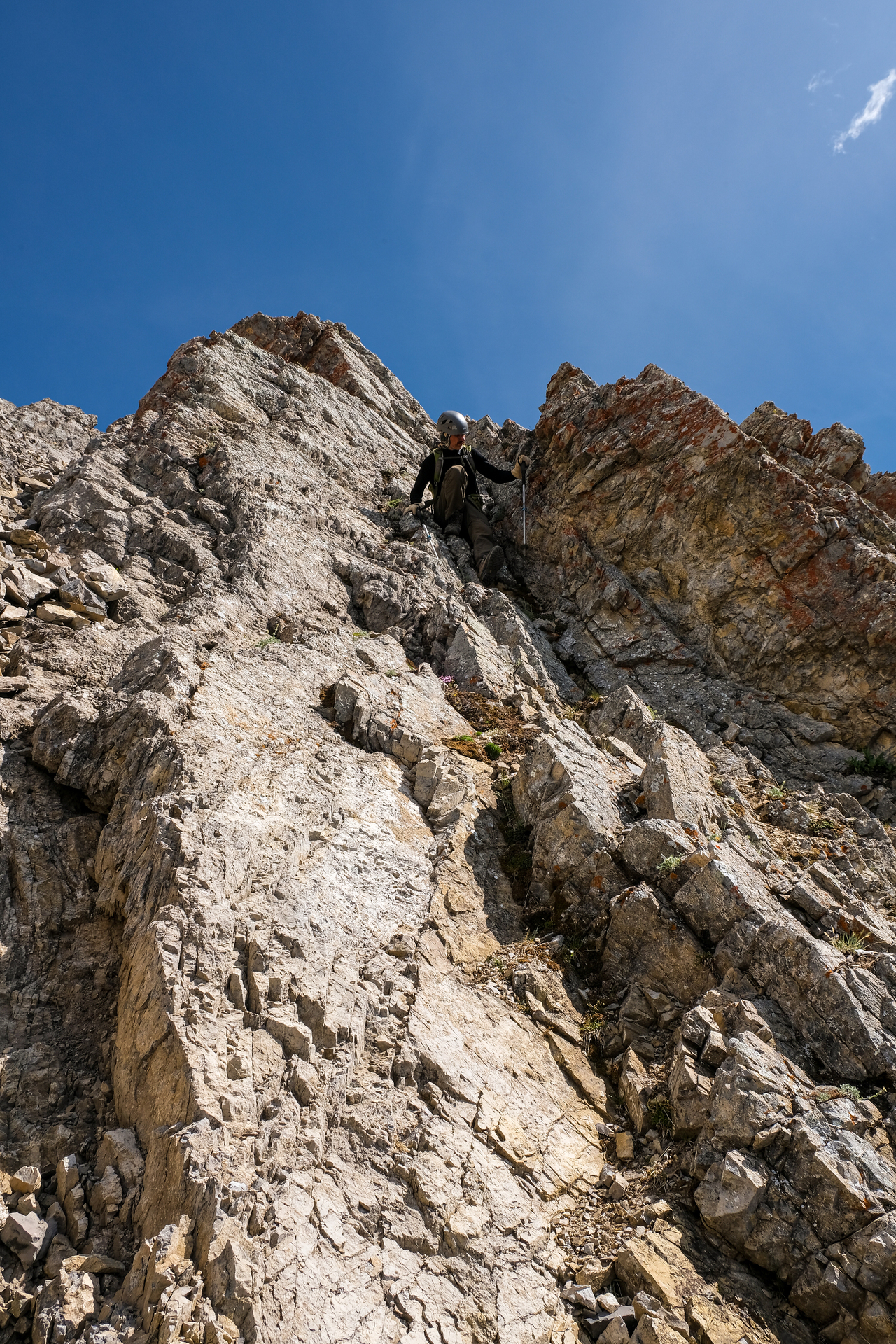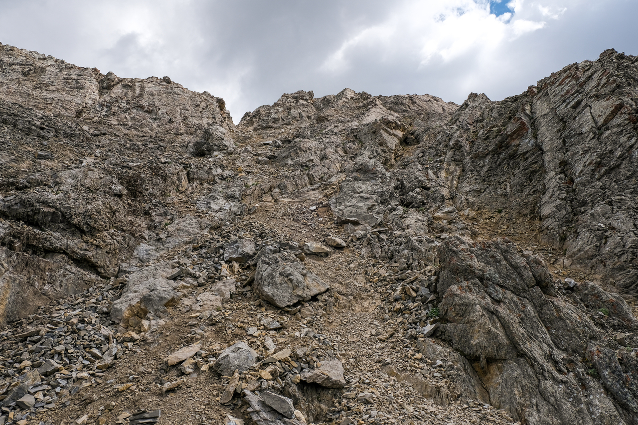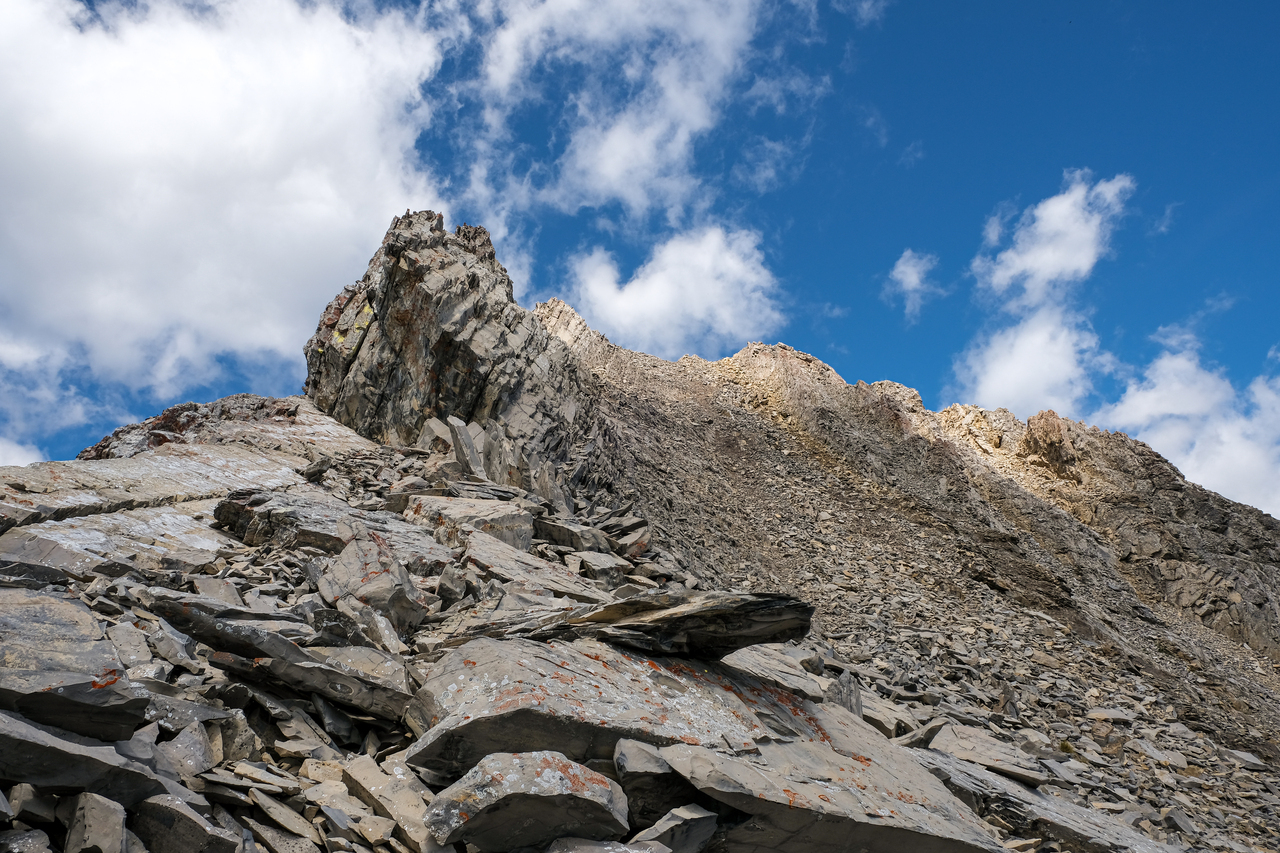 A scree trail, on the right side of the ridge, easily leads the way, avoiding the jagged and exposed crest.