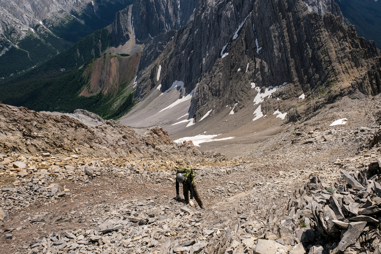 After retracing our steps along the scree-ledge traverse, we made quick work of the final easy slopes.