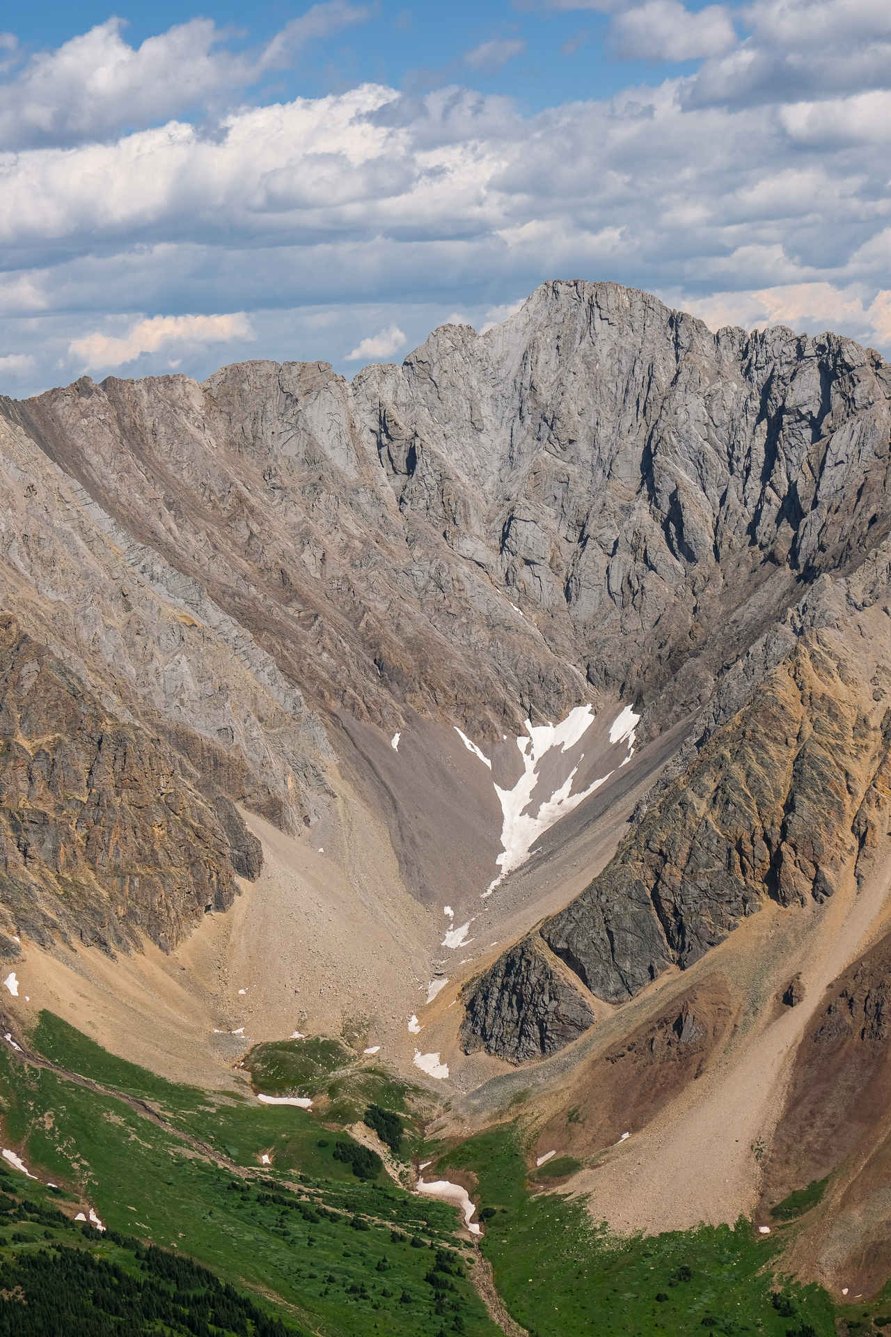 Stunning, "in your face" view of Mount Packenham's vertical strata, contrasted by a vibrant, green valley below!