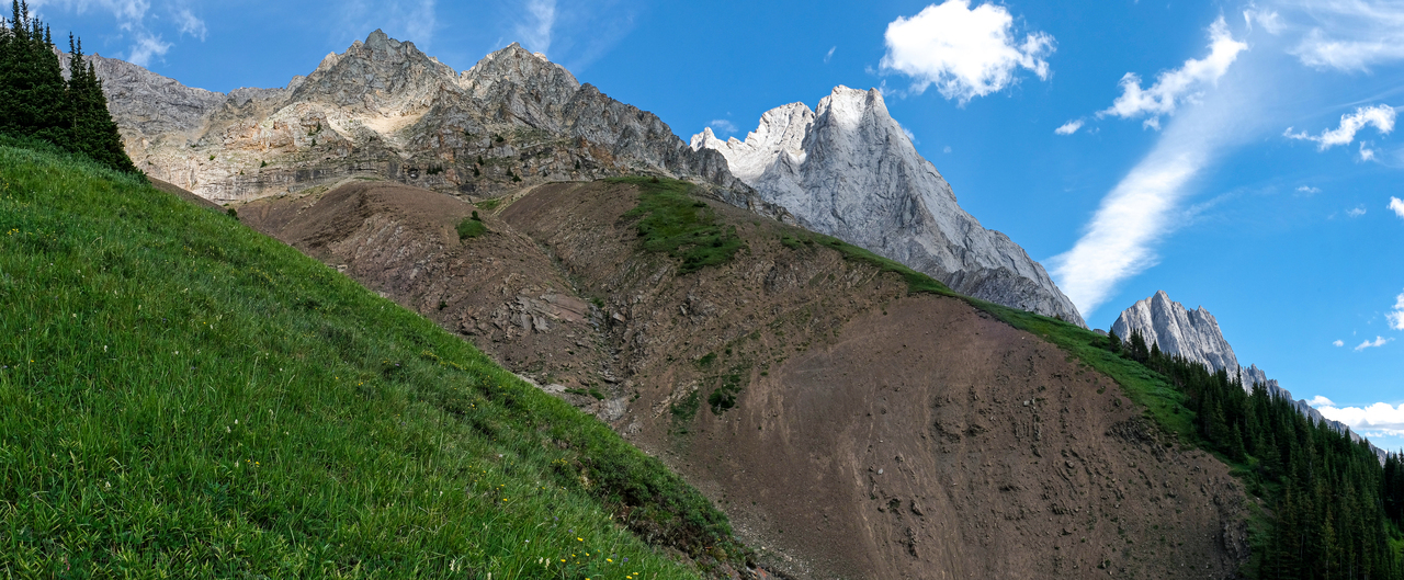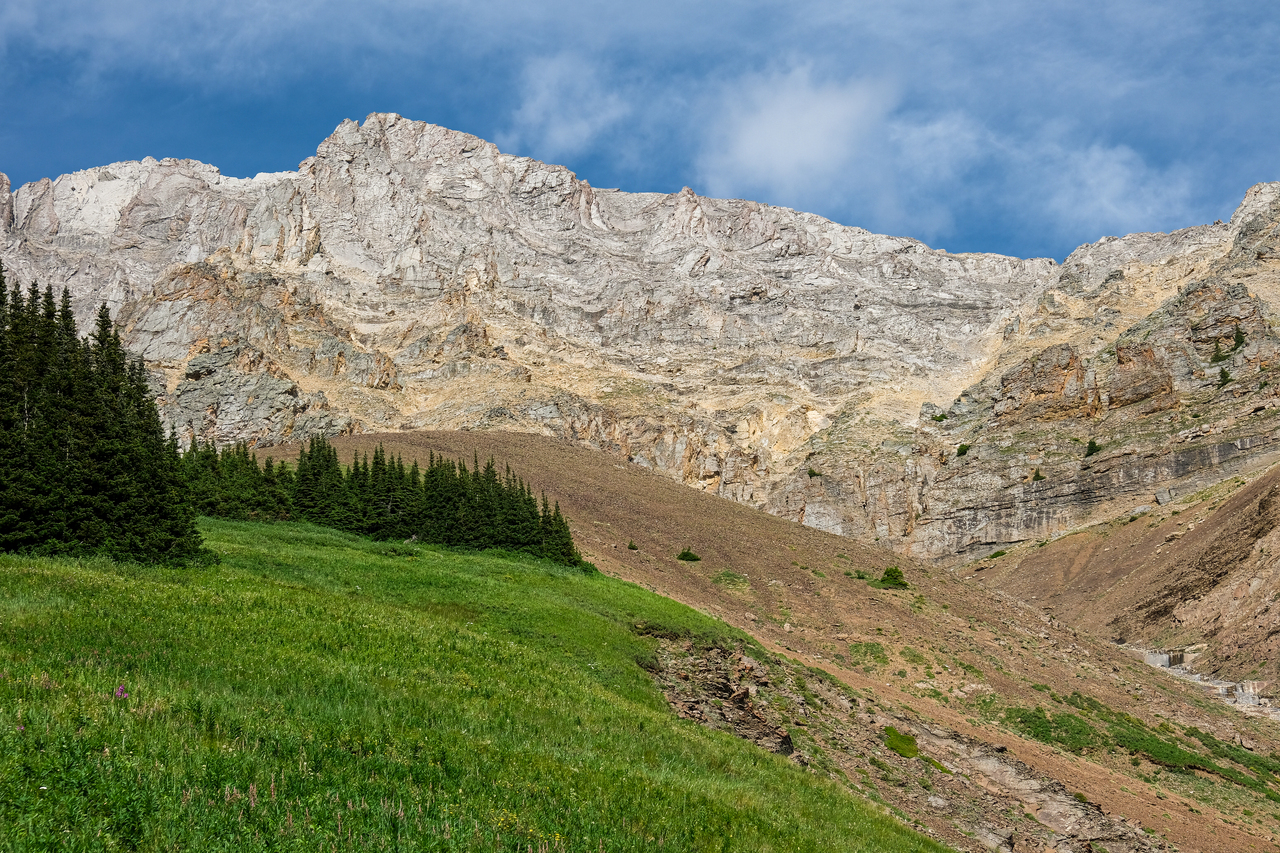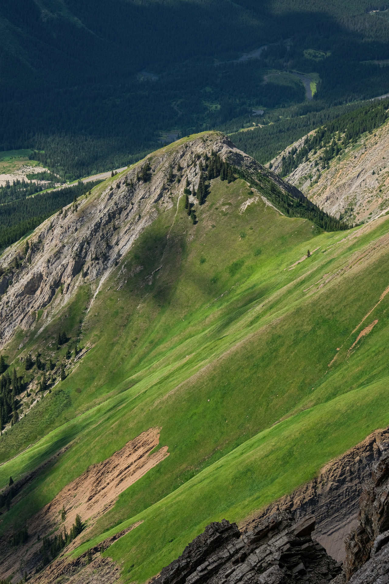 Looking across to the unique, grassy backsides of Grizzly Peak and Opal Ridge. You'd never guess it from their sheer cliff faces rising above the highway!