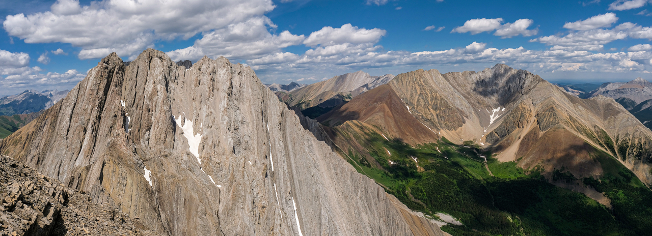 Looking east towards the front range and the distant prairies. Ripsaw, "Garriochmill", Glasgow, Cornwall, Outlaw, "Janelea", and Tombstone (L to R).