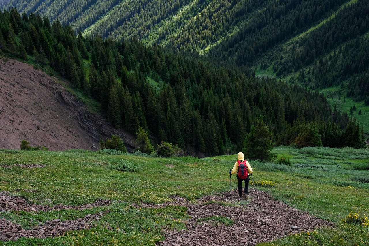 A faint trail leads the way up the grassy slopes on the opposite side of the valley.