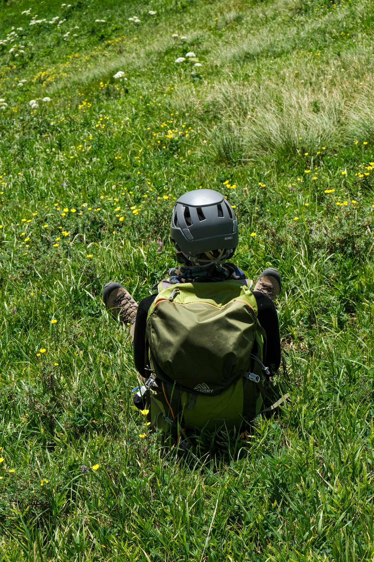 Grassy slopes easily lead down on skier's right of the drainage. Photo credit: Dad