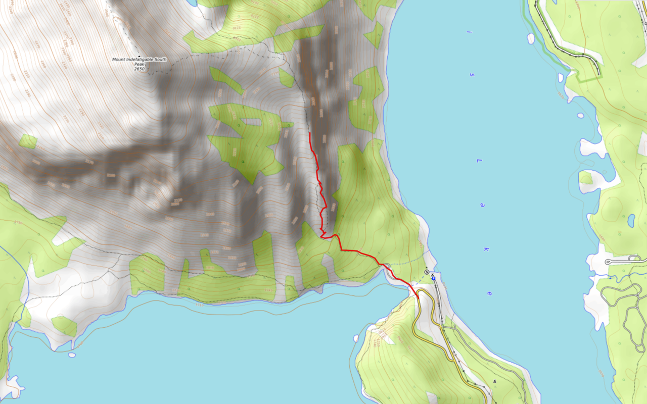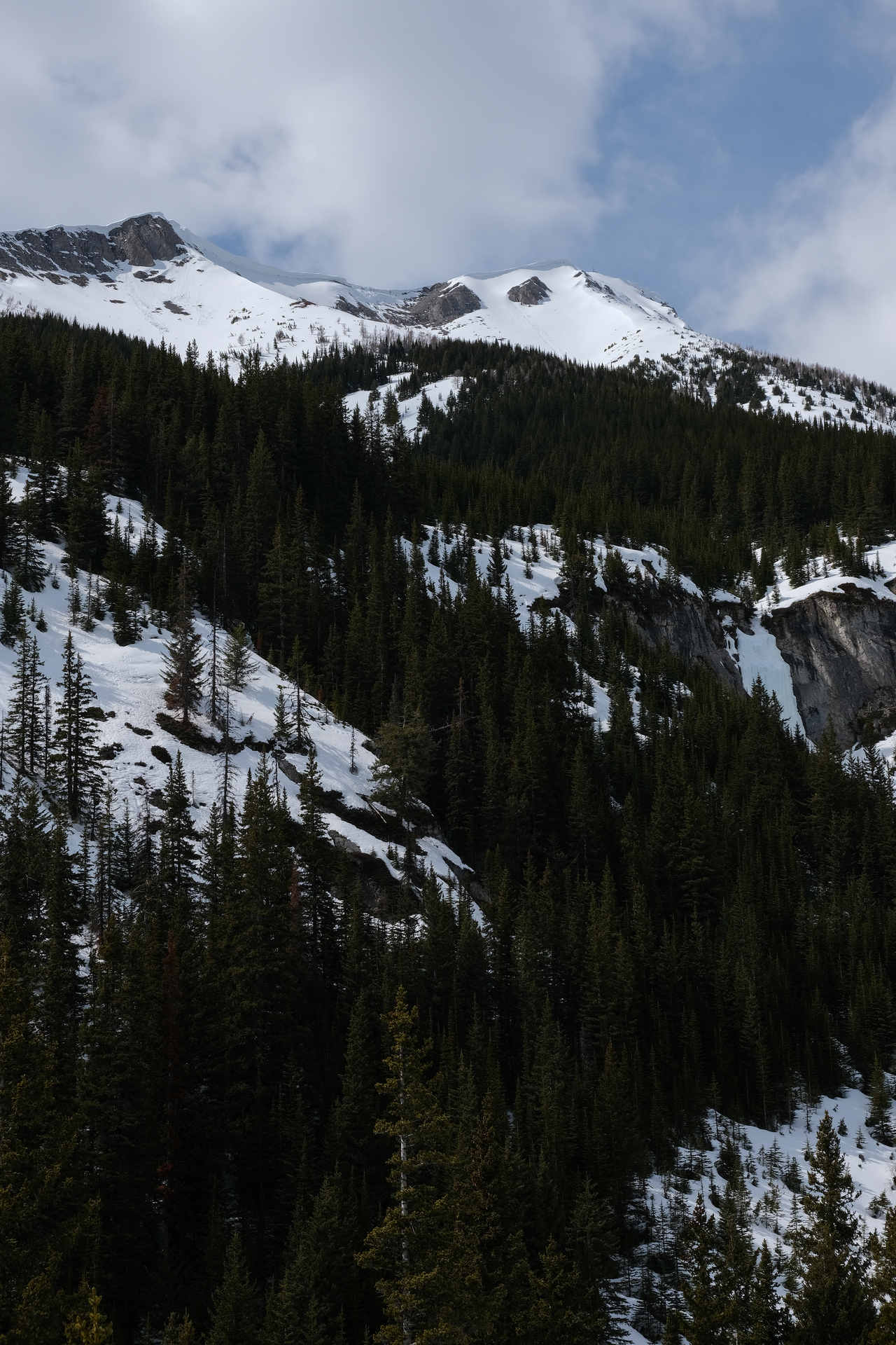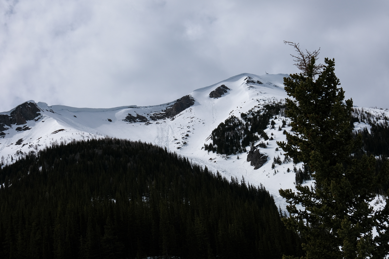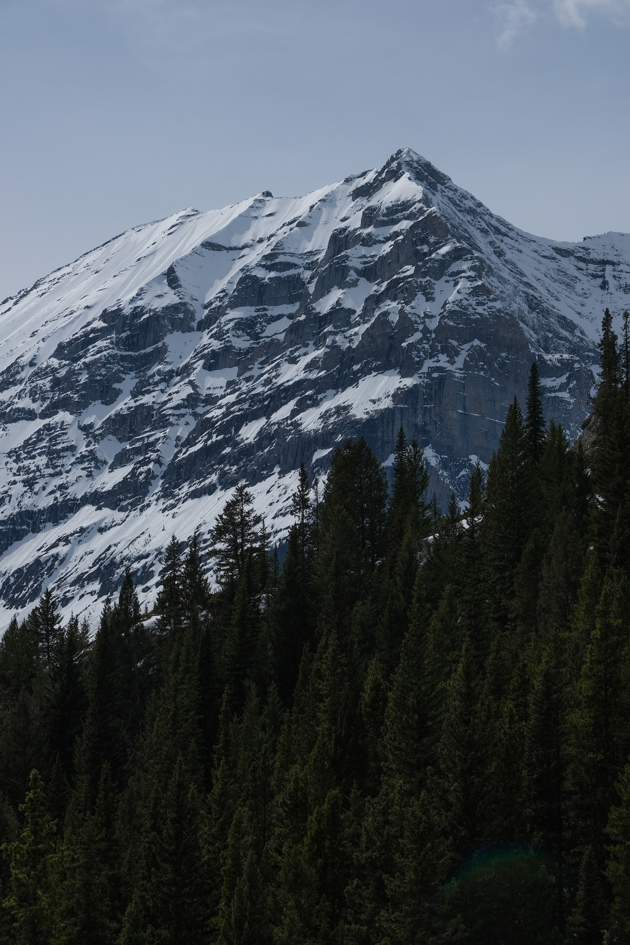 Mount Indefatigable as seen from the Interlakes parking lot, at the end of Kananaskis Lakes Trail. The route enters the forest, and ascends the obvious ridge angling right across the middle of the frame.