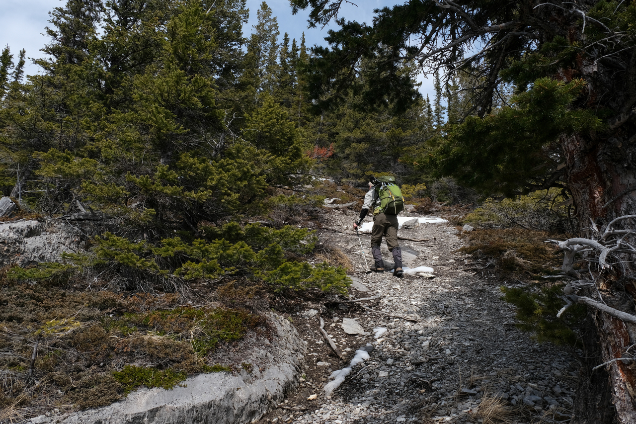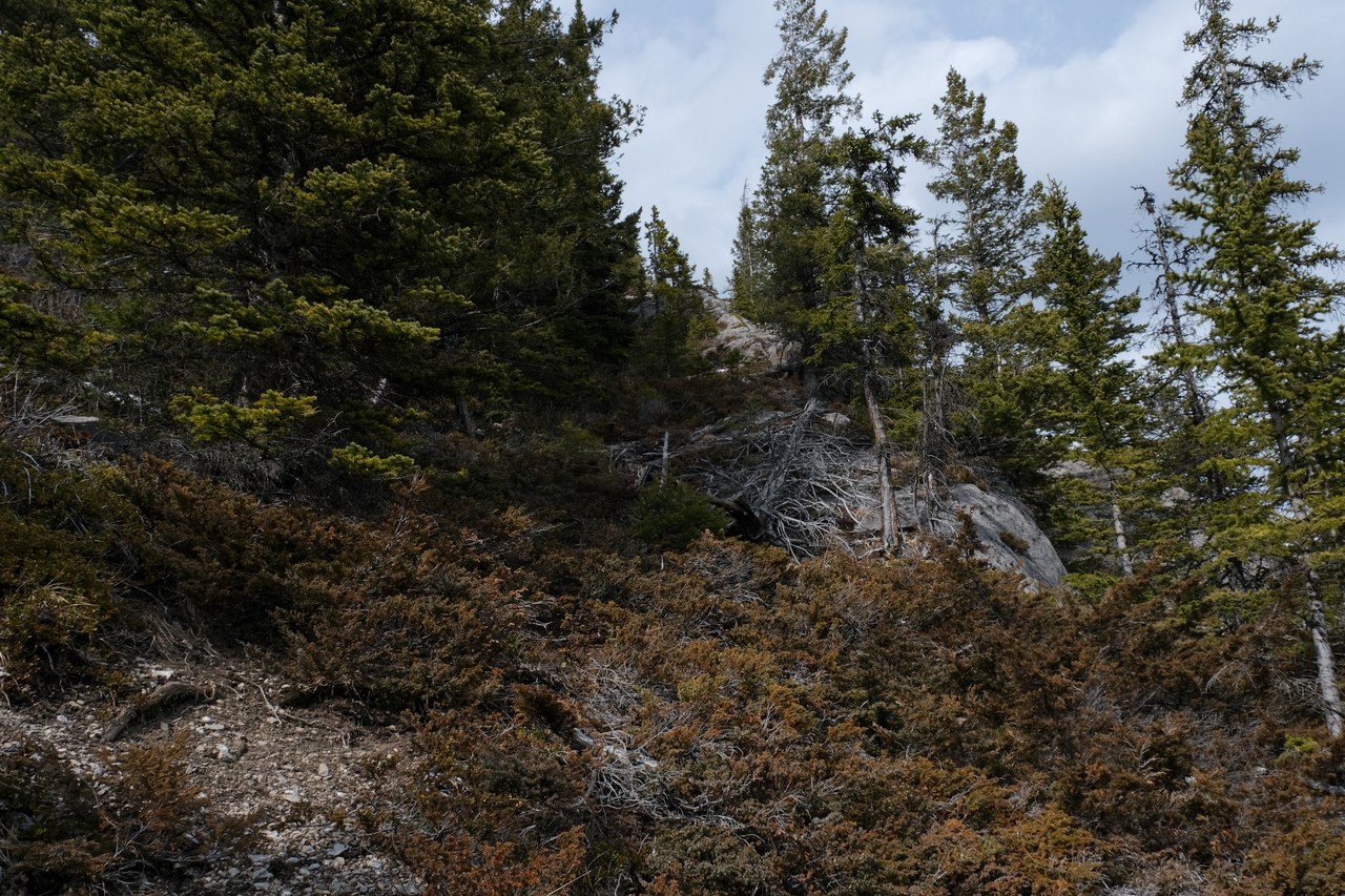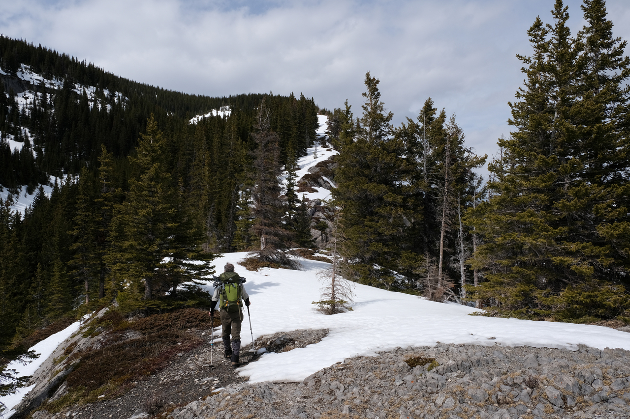 As we gained elevation, we encountered more snow in the sheltered terrain, and after losing sight of the trail, simply angled towards the ridge crest (climber's right).