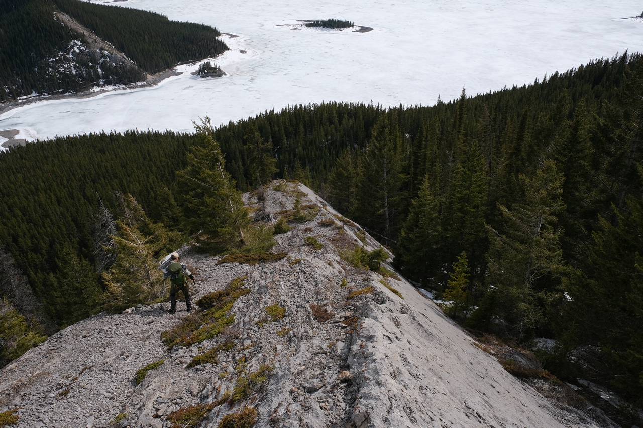 Following the rocky ridge down. Although we ascended in the trees to the right, the views were much better up here, so we decided to take the risk (note the steep slab on the right) and hoped the slab tapered off lower down.