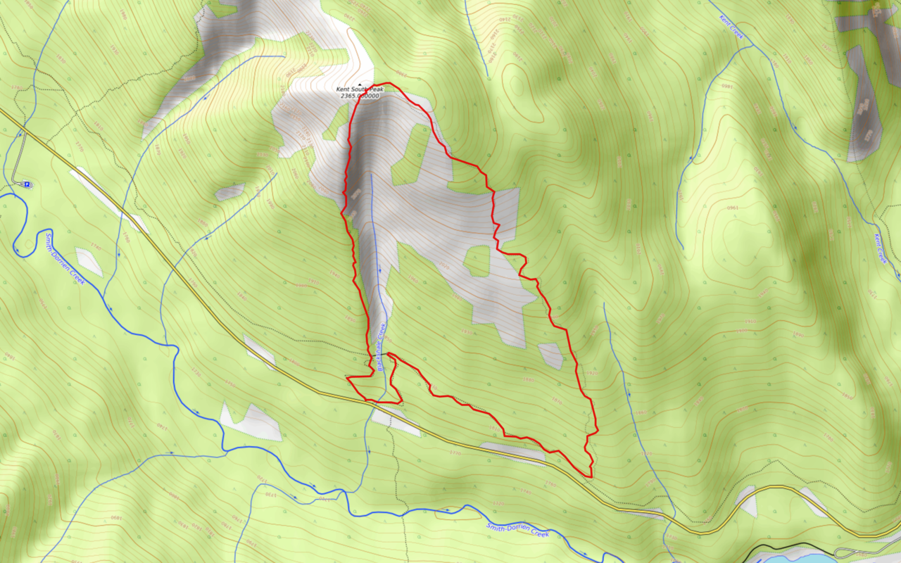 Luckily (since the bridge is closed in winter), there is a detour route on the east side of the creek, which led us back down to our car. Although this trip may have turned a bit sour, the views were spectacular on this little peak, and are more than worth the effort! Just make sure to use the right tool for the job (unlike us) and use caution on the open, upper slopes of the south ridge. Or stear clear of hazards altogether by using the southeast ridge as your ascent route. Whatever choice you make, you're bound to be impressed by the incredible winter scenery (especially that view of Warspite!) as long as the weather cooperates!