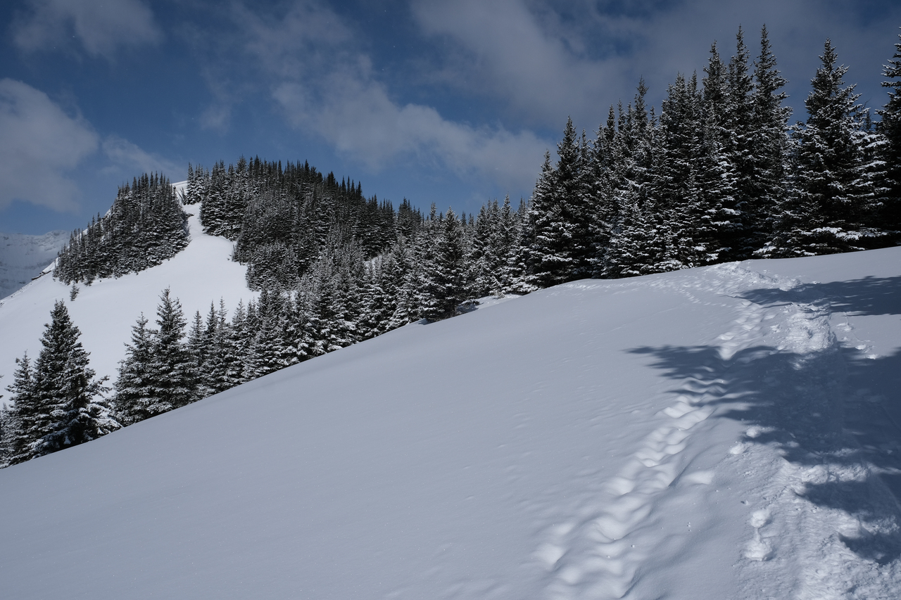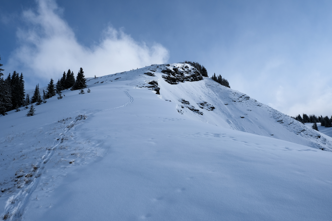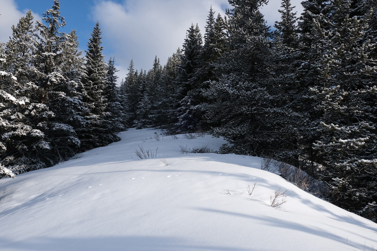 Looking back to the summit as we continue down the gentle, treed ridge. It was obvious that this is the most popular route, as even with the fresh layer of snow, we were still able to follow a significant "indent" the whole way down.