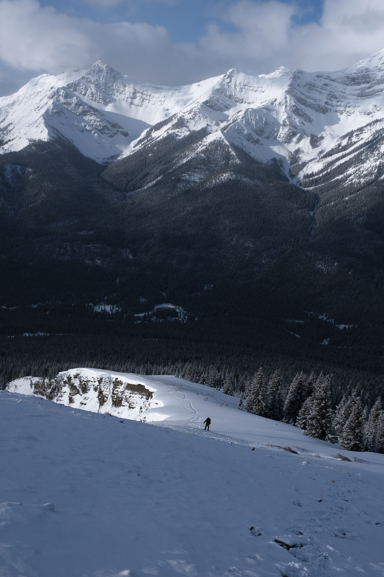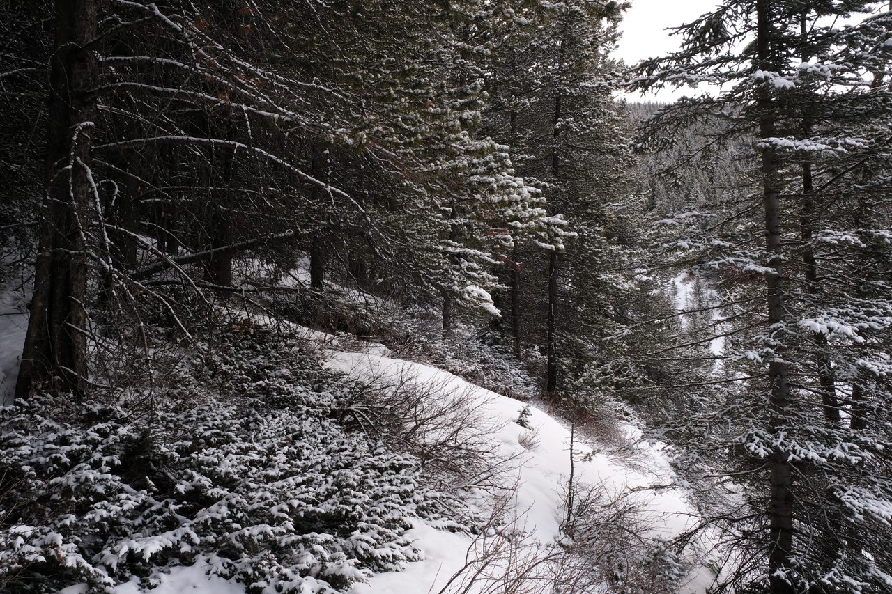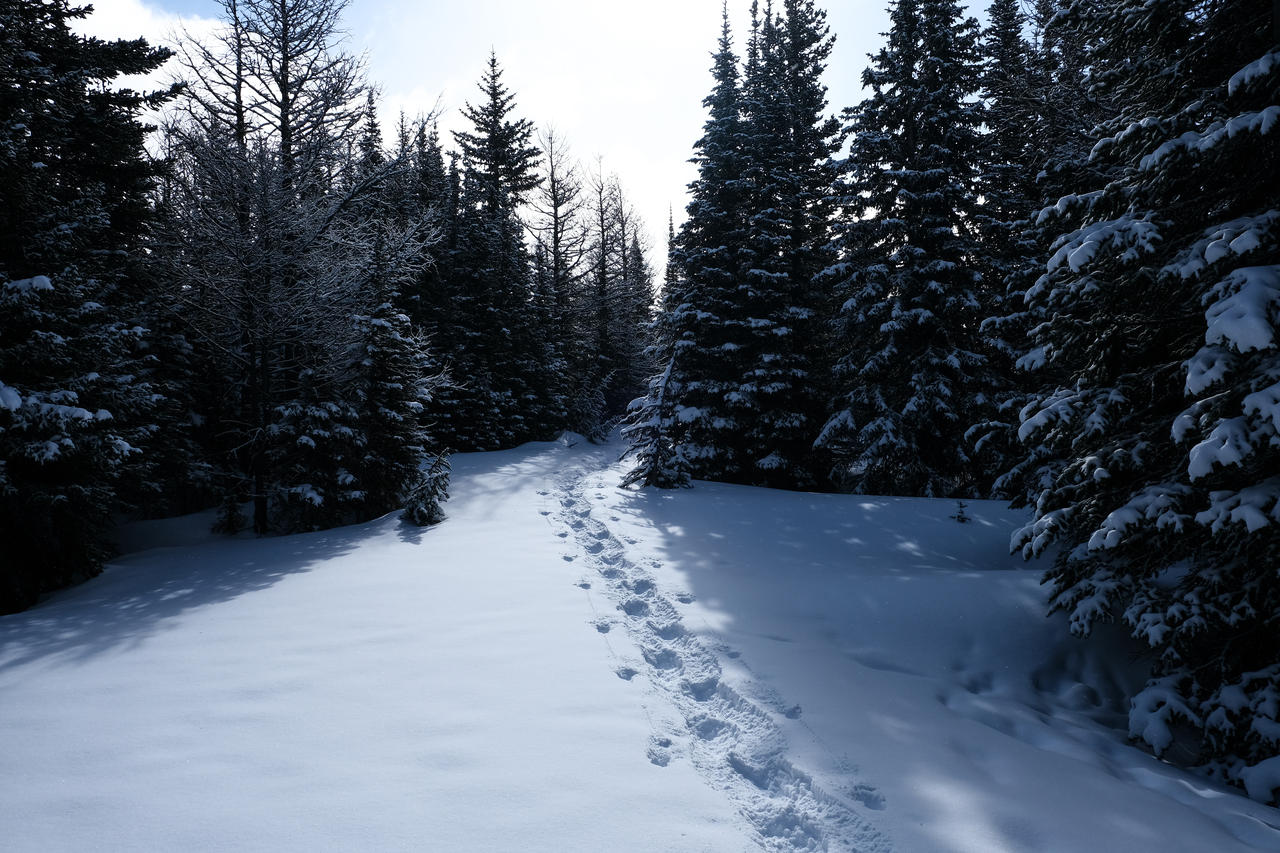 Looking back to the summit as we continue down the gentle, treed ridge. It was obvious that this is the most popular route, as even with the fresh layer of snow, we were still able to follow a significant "indent" the whole way down.