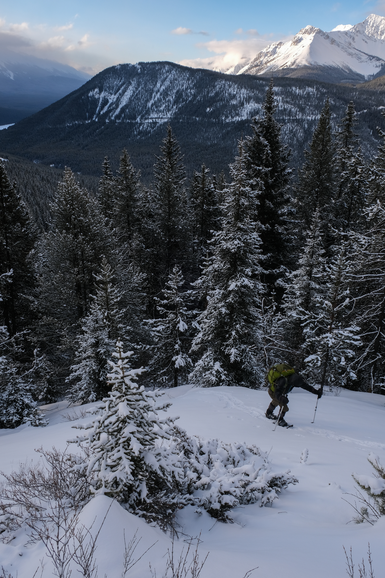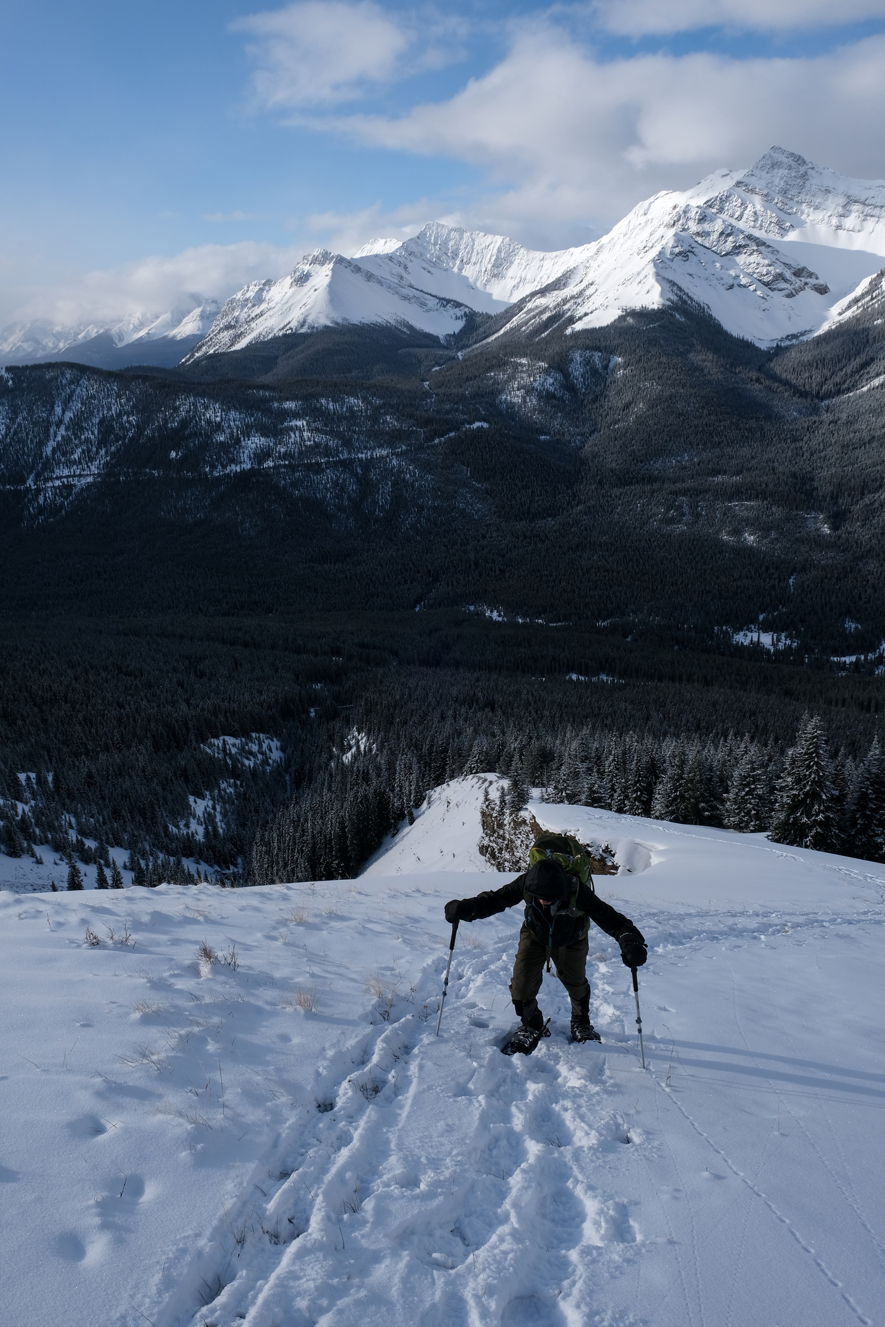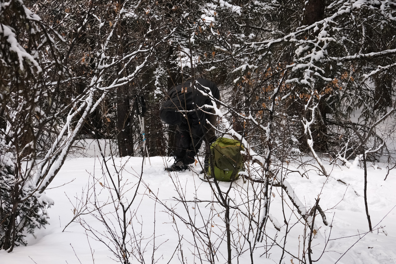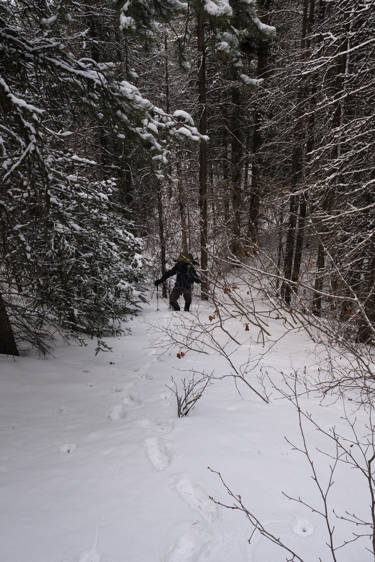 Trail-breaking through the crusty top layer wasn't the most pleasant, and this, combined with fighting through those annoying, low-lying, bush branches (the ones in this picture...), eventually resulted in us strapping on snowshoes. I mean, we're carrying them along, might as well use them!