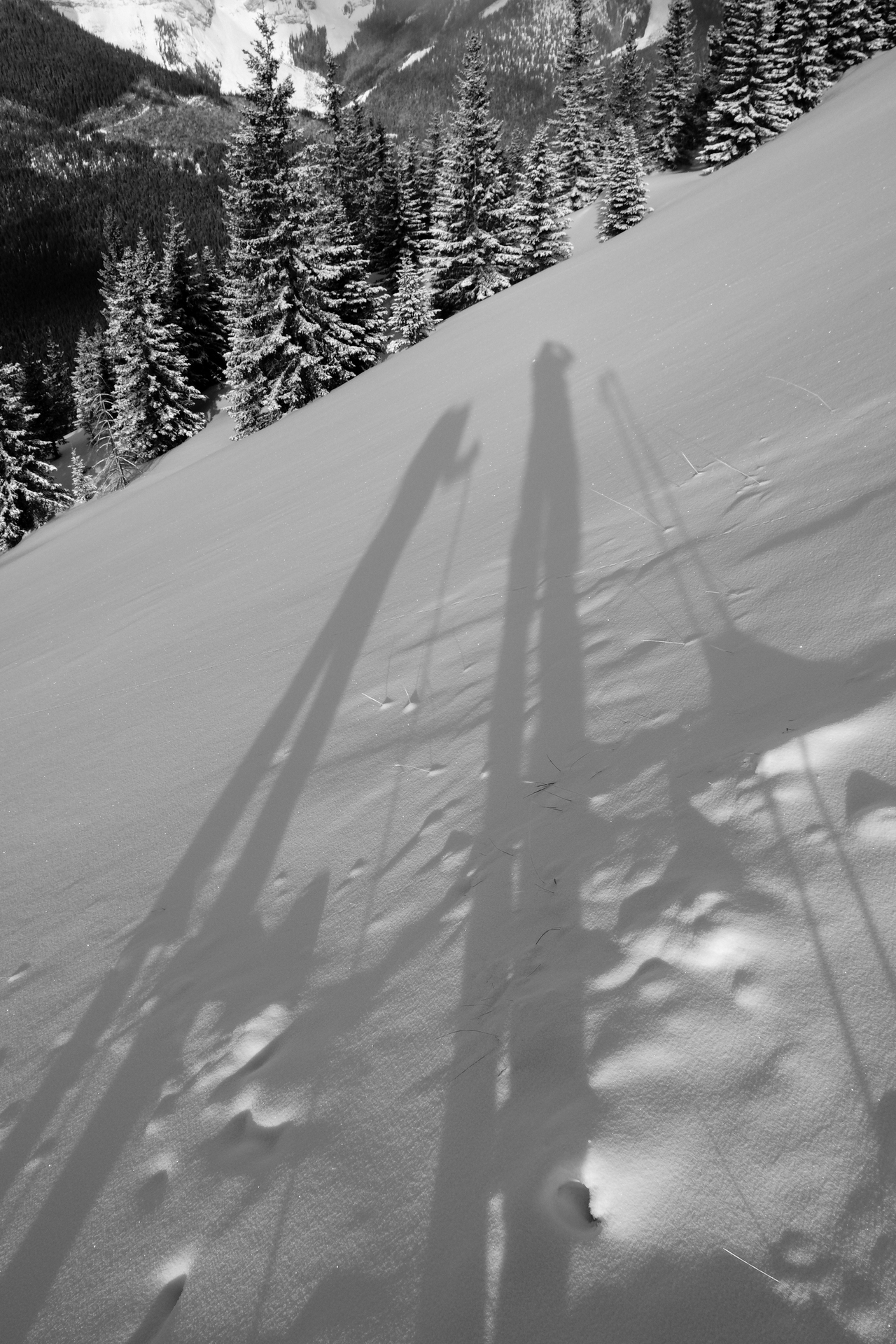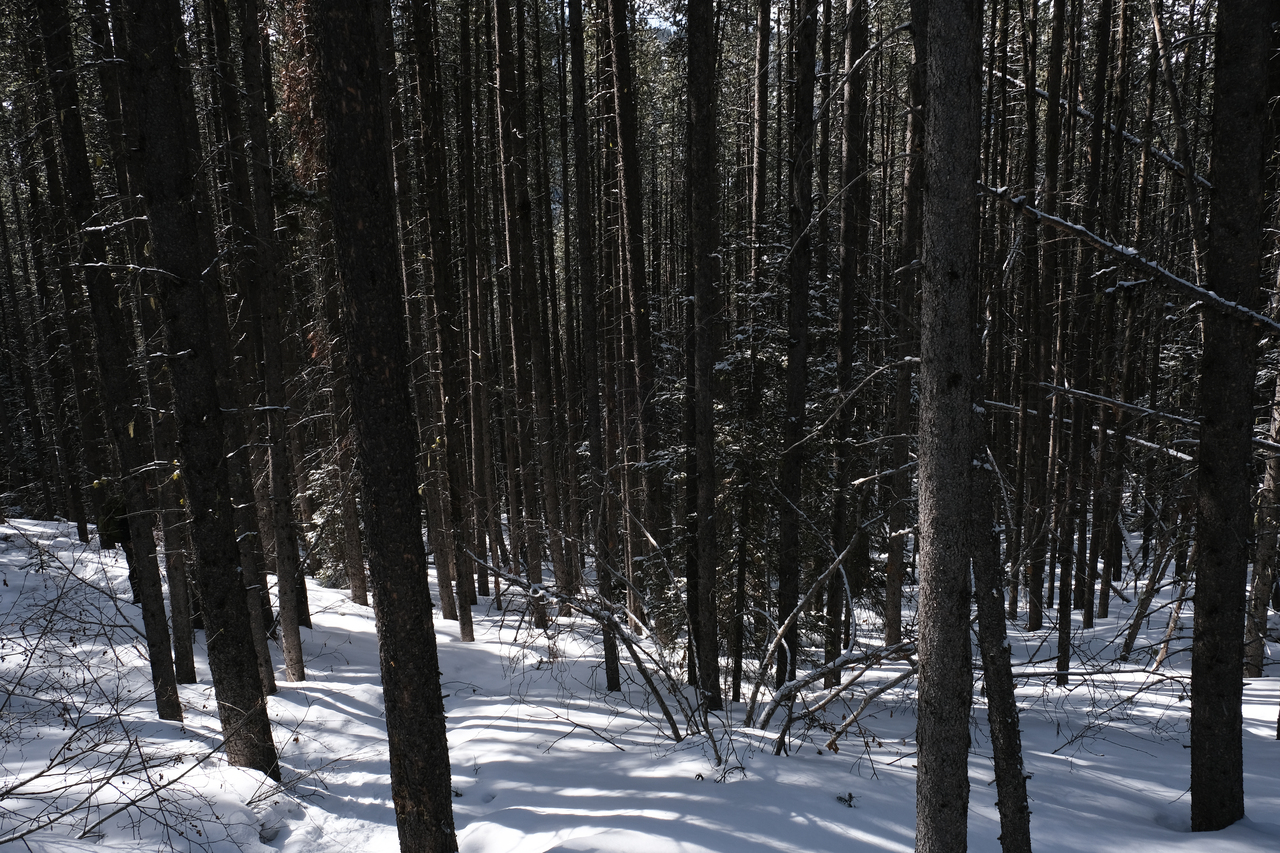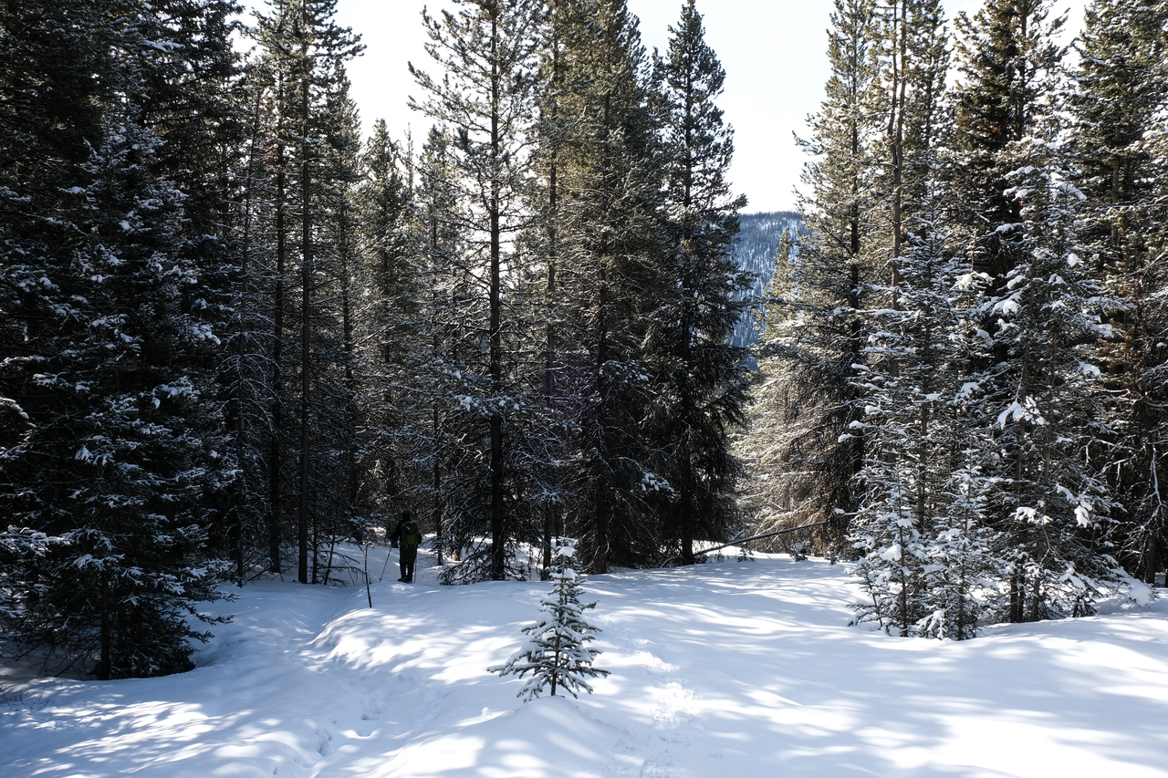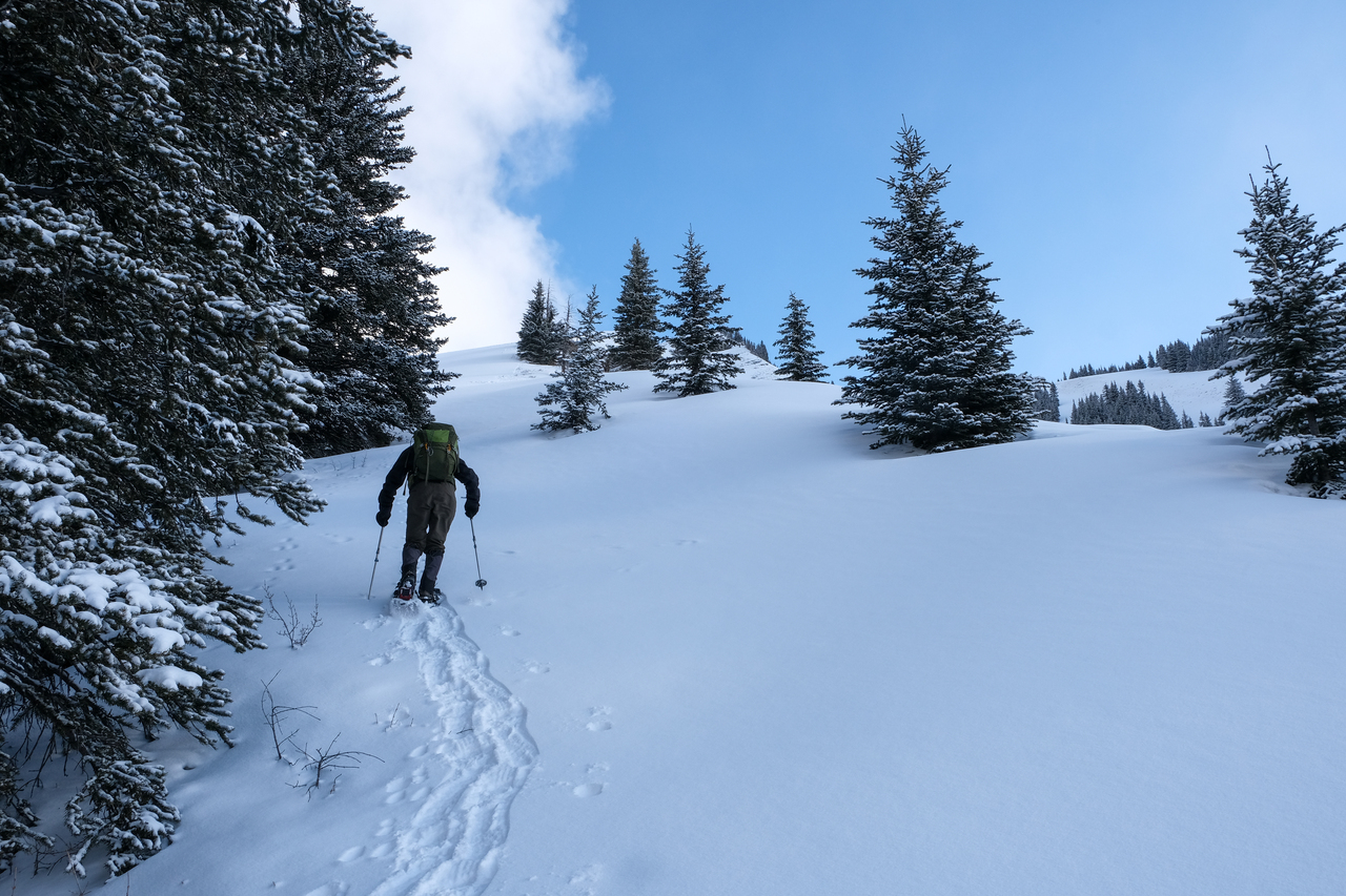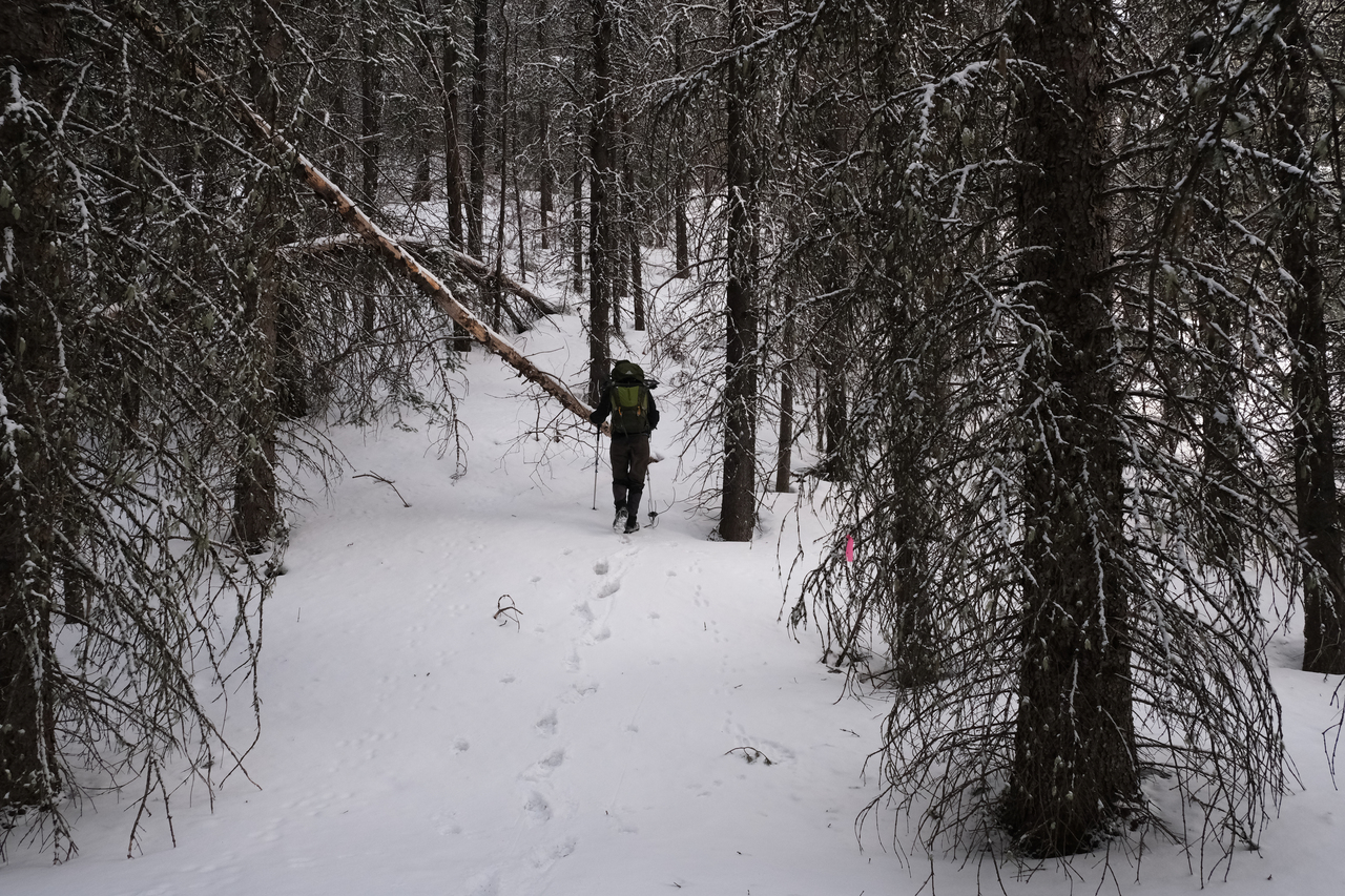 Trail-breaking through the crusty top layer wasn't the most pleasant, and this, combined with fighting through those annoying, low-lying, bush branches (the ones in this picture...), eventually resulted in us strapping on snowshoes. I mean, we're carrying them along, might as well use them!