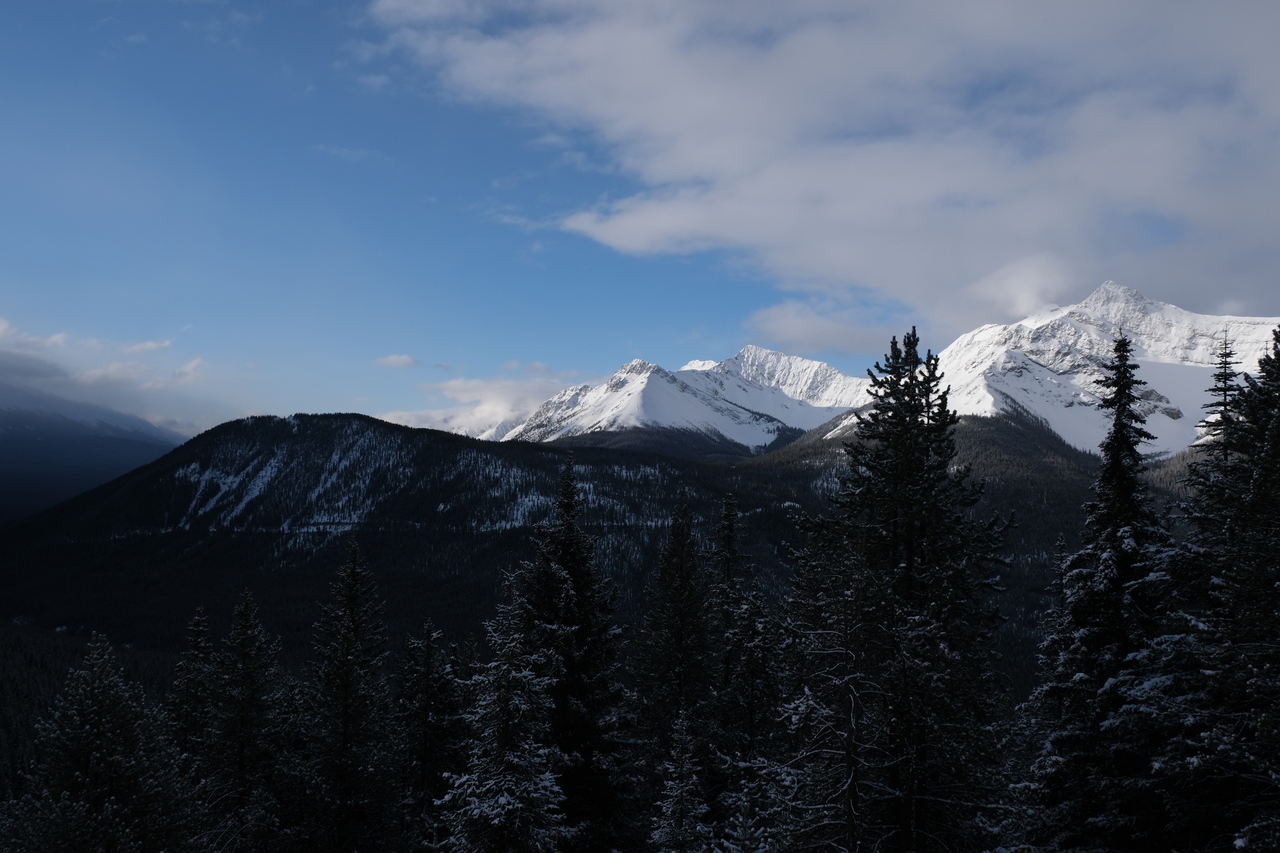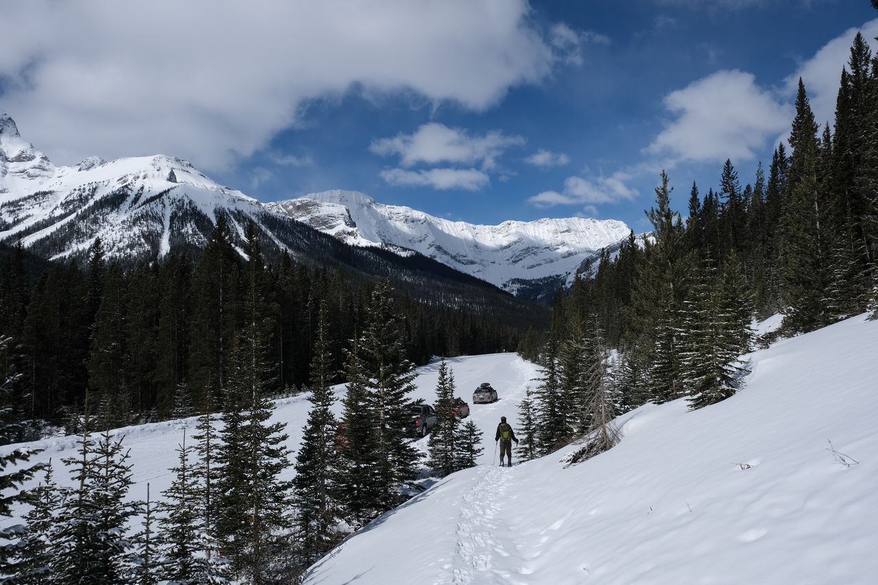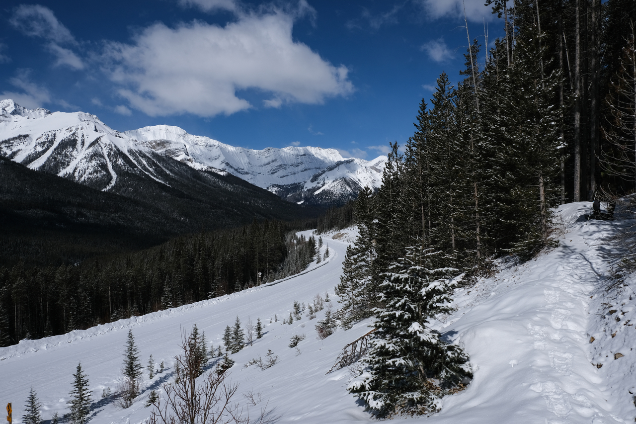 The lengthy Lower Kananaskis Lake comes into view, stretching out past another short snowshoe objective, Gypsum Ridge.