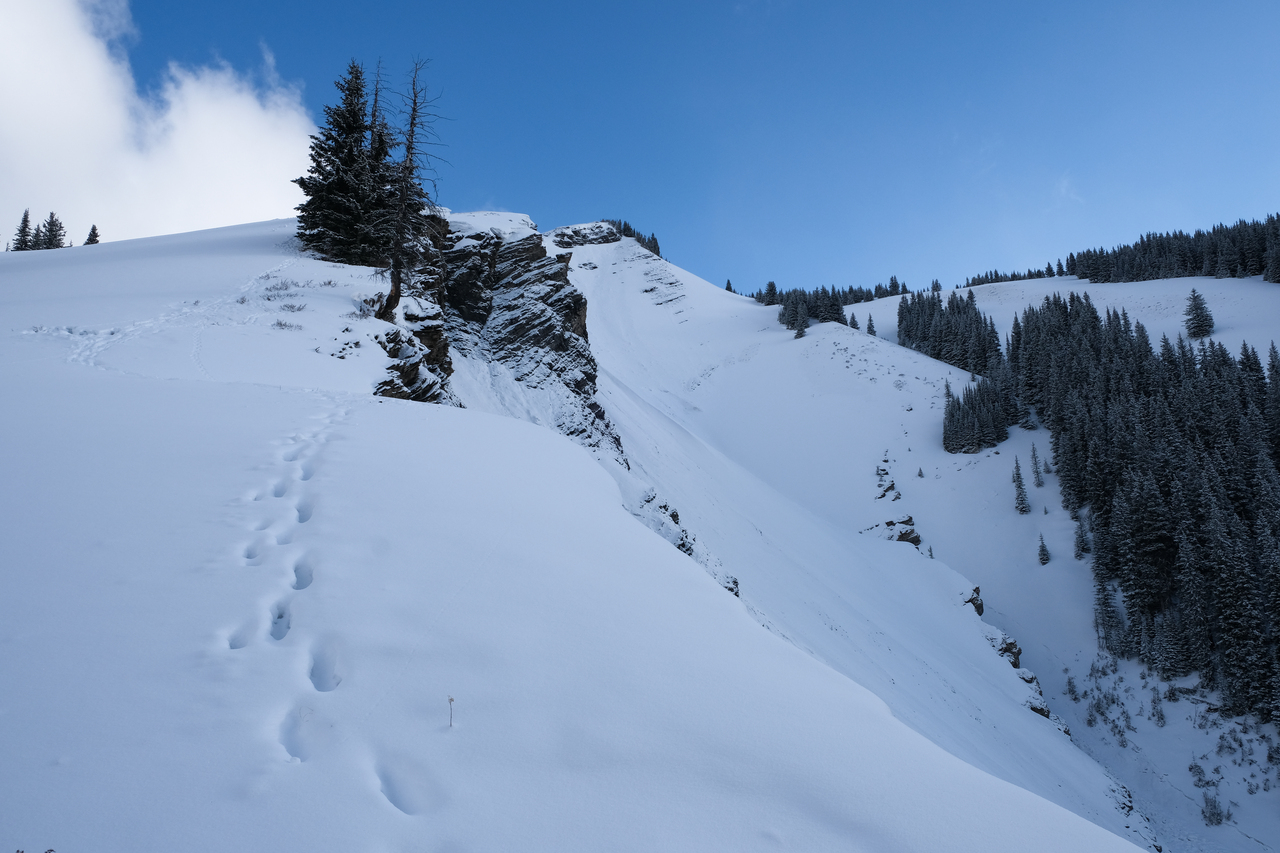 The ridge does get quite steep in places, but luckily there wasn't enough snow for a slide. (Note the grass sticking out.) Even so, cornices overhang the steep walls down to the creek below, and should be treated with respect!