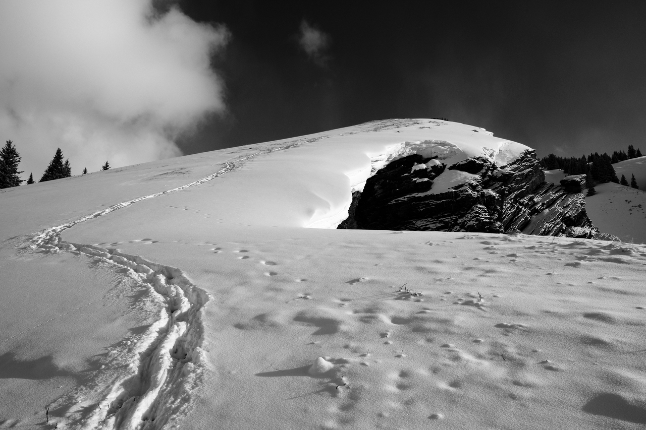 Looking back down to my dad, as he approaches the final steep slope leading to the summit. The summit is just a few meters further (from where I took this picture), and since this slope was largely windblown, with just a light dusting of snow on top of some shale, I knew there wasn't a risk of an avalanche. I therefore took the final few steps to the summit, to snap some pictures, losing sight of my dad...