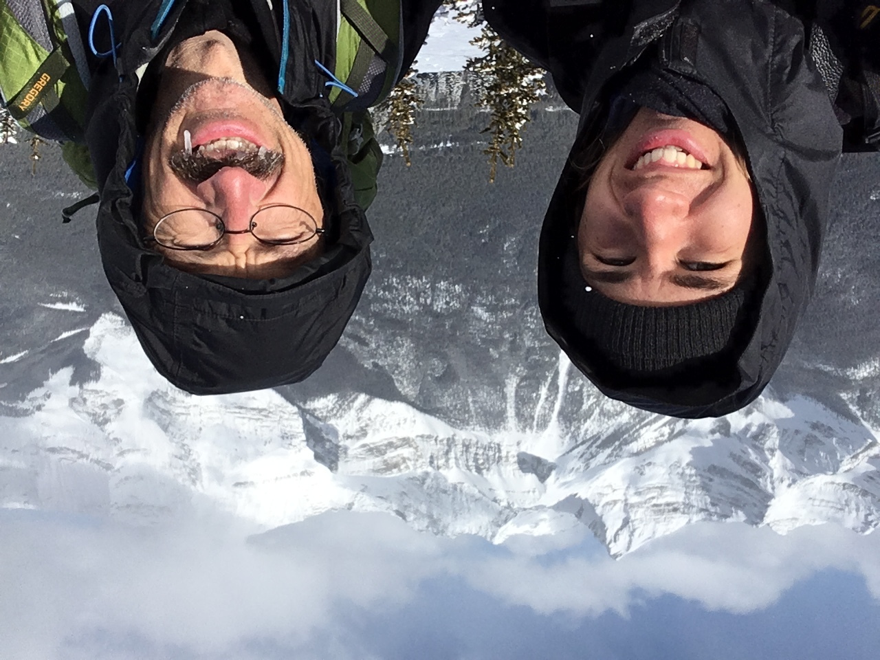 ...and to the east (beyond Lower Kananaskis Lake) were completely walled off!...With there still not being any sign of my dad, I started to worry, and started back down to look for him...Just a few steps down from the summit, I was able to see over the roll, and spotted him nearing the top. He looked extremely shaken up...It turns out that he had slipped on that final slope, wasn't able to stop himself, and was lucky he didn't slide right off the cliffs to the creek below! I feel really bad for leaving him behind, but I don't think there would have been anything I could have done. Looking back, we probably should've ditched the snowshoes for that slope, because you make one wrong step on that dinner plate shale, and there's not much you can do with big pieces of plastic strapped to your feet! Luckily he seemed to be okay physically, but definitely not mentally! I was barely able to take a picture with him on the summit before he disappeared down the longer (but safer) southeast ridge route.