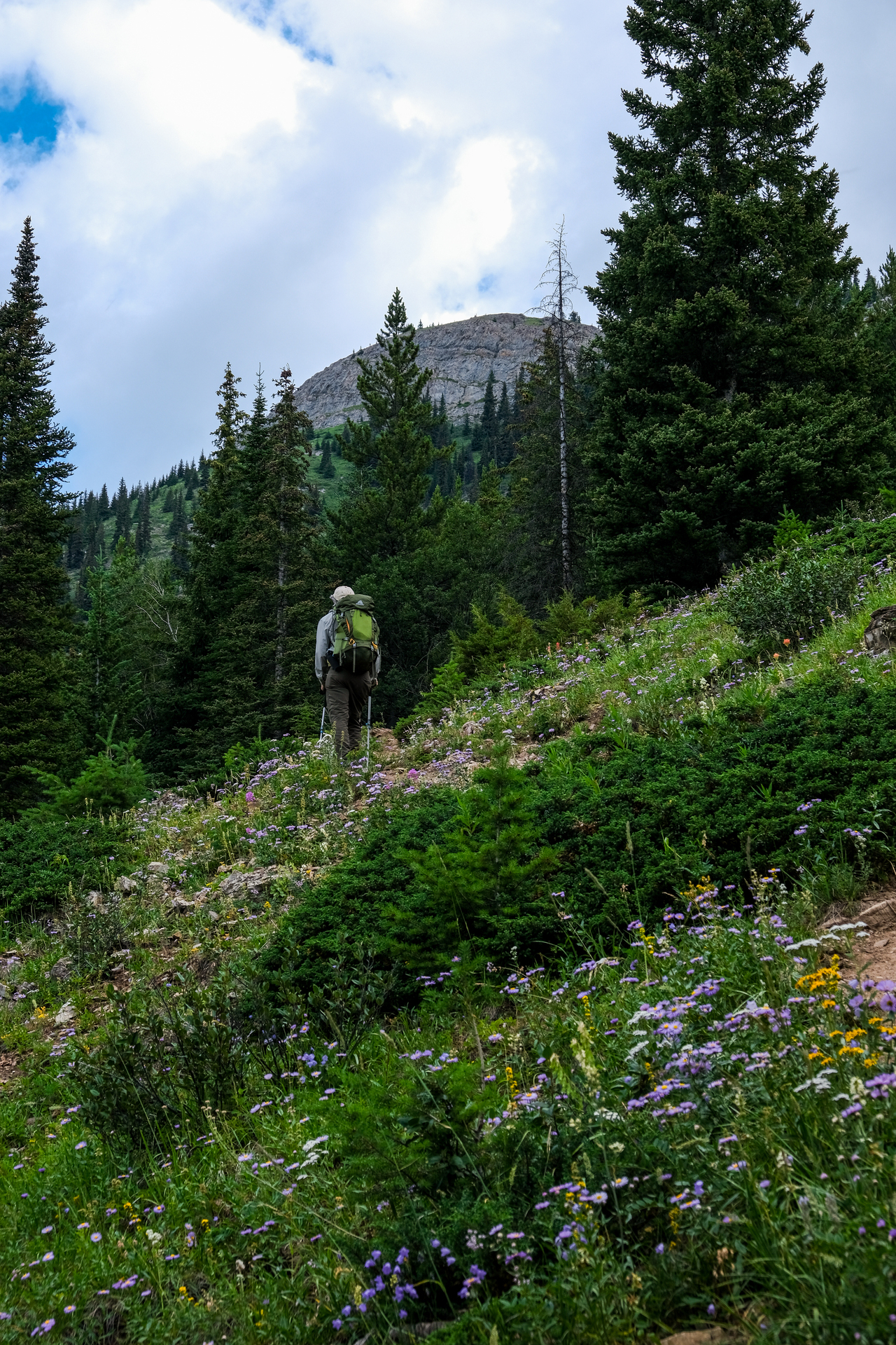We quickly gained elevation up the trail, weaving our way through the pretty wildflower-covered slopes, and soon reached the ridge, at which point the slope eased off significantly and we started the traverse to the summit, still a couple kilometers away.