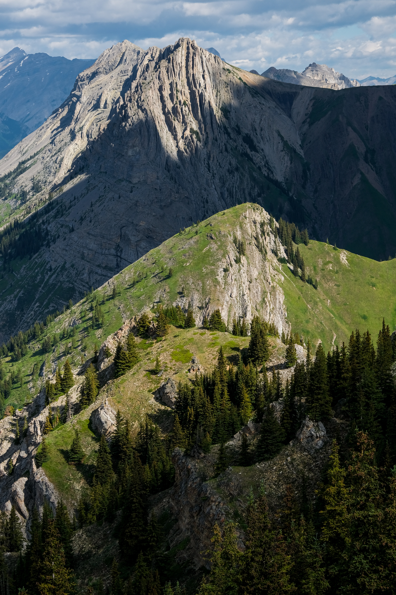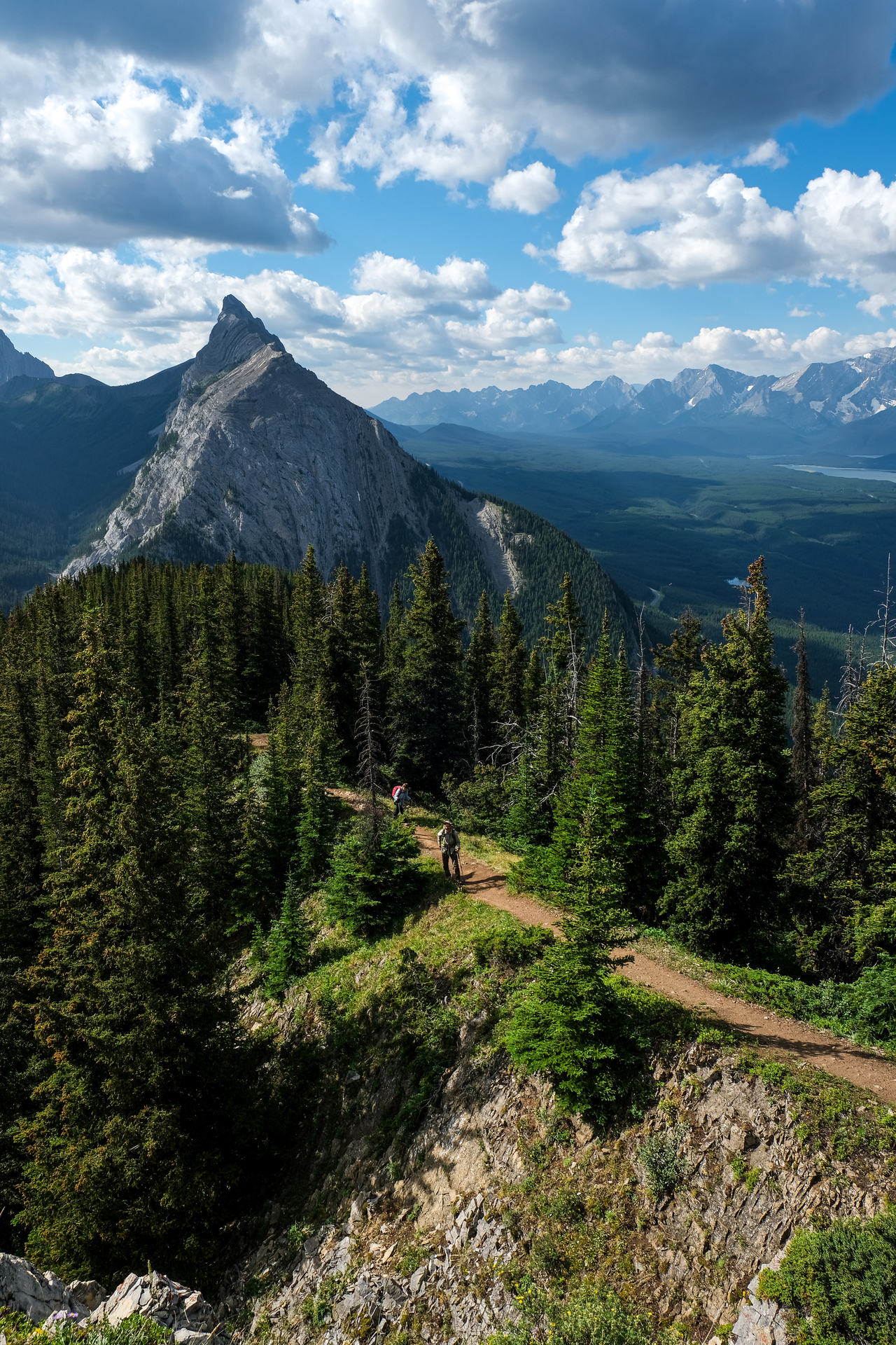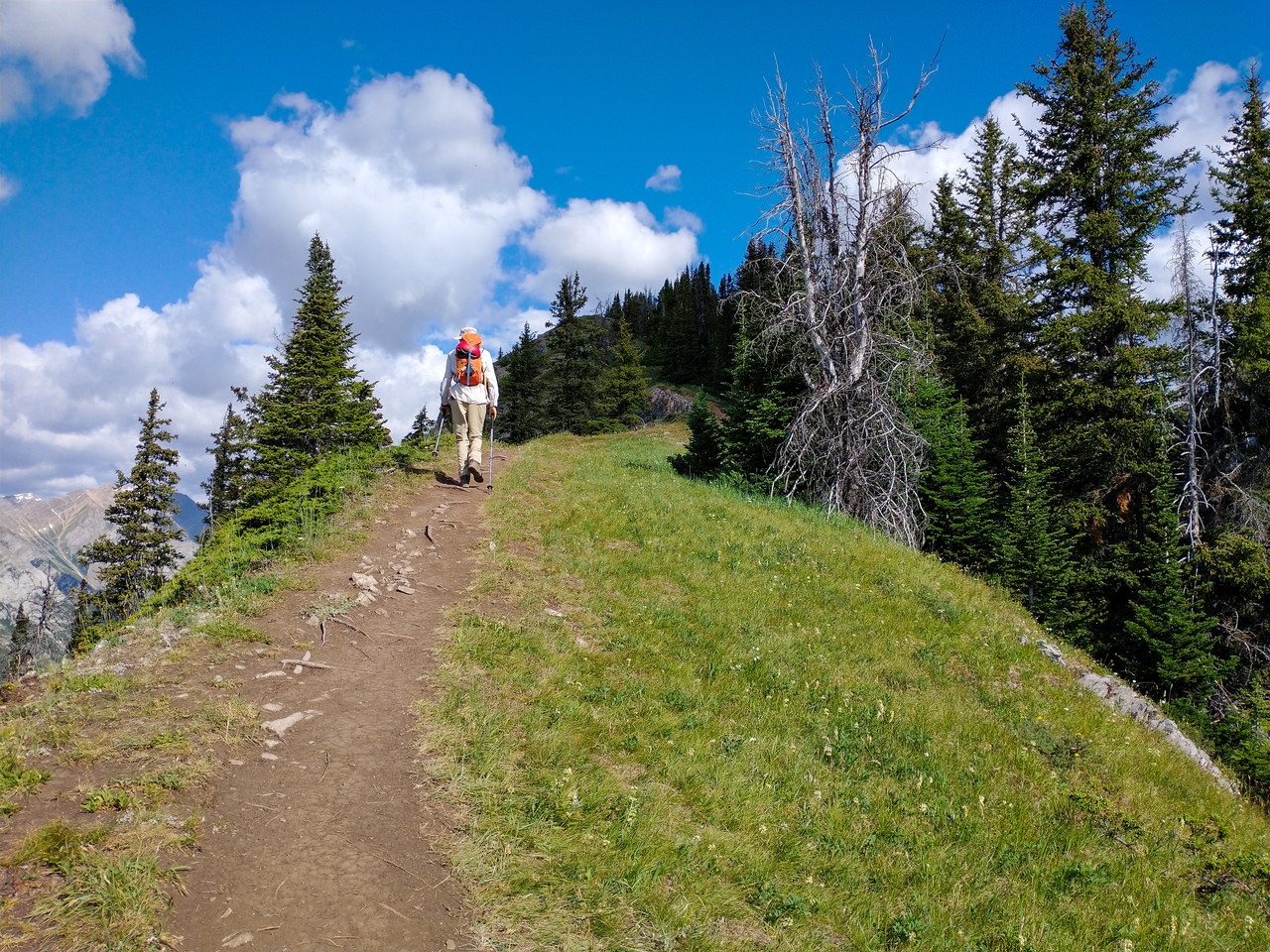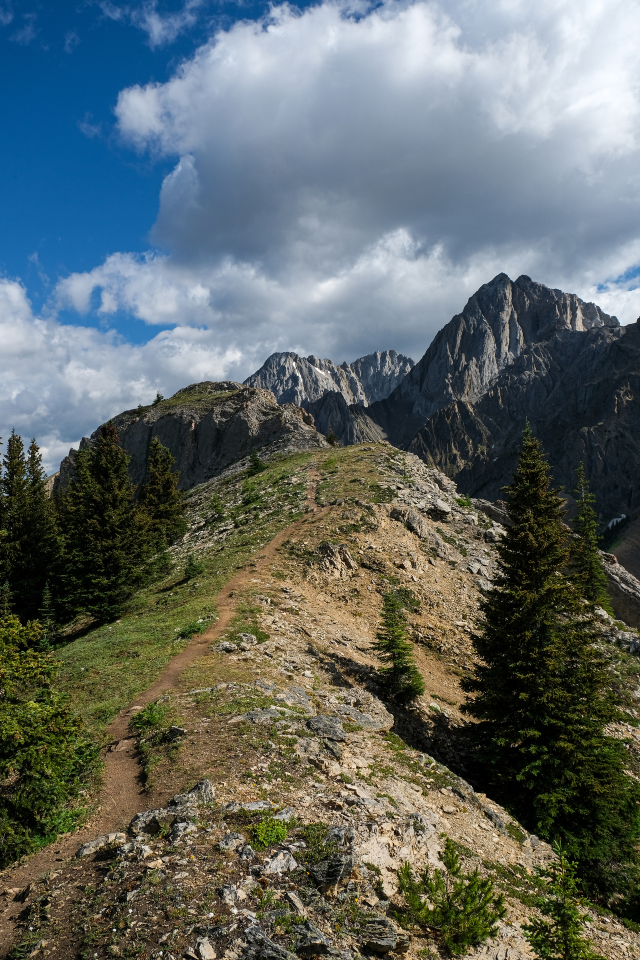 After immediately crossing over King Creek, the trail leaves the highway and quickly gains elevation up to KCR's southern end. There were lots of crisscrossing and interweaving trails, all of which should eventually lead to the same place. Thanks to the steepness of the trail, it wasn't long before we were already enjoying beautiful morning views across to Mount Lawson to the north and the Kananaskis Lakes to the south.