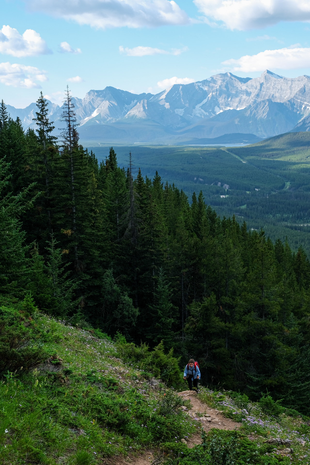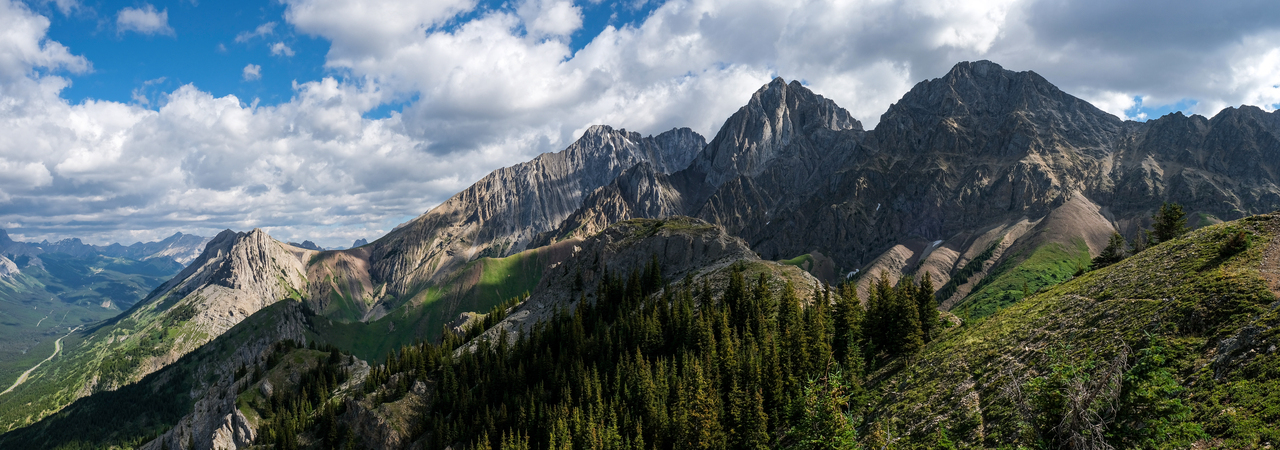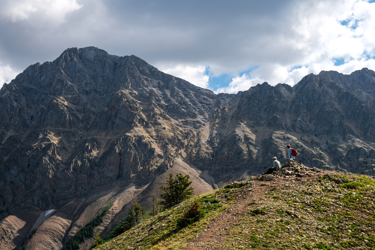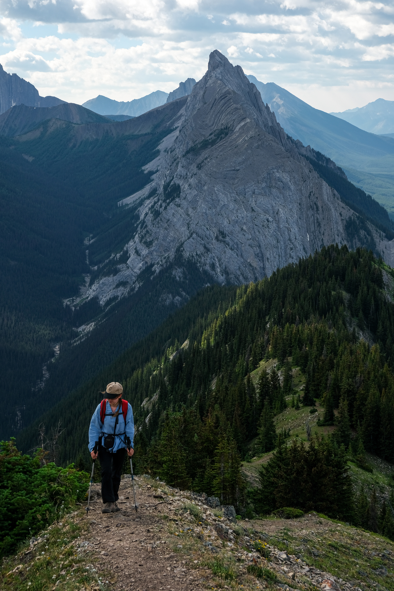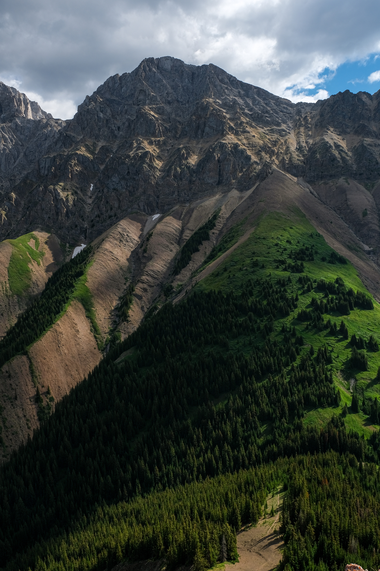 After immediately crossing over King Creek, the trail leaves the highway and quickly gains elevation up to KCR's southern end. There were lots of crisscrossing and interweaving trails, all of which should eventually lead to the same place. Thanks to the steepness of the trail, it wasn't long before we were already enjoying beautiful morning views across to Mount Lawson to the north and the Kananaskis Lakes to the south.