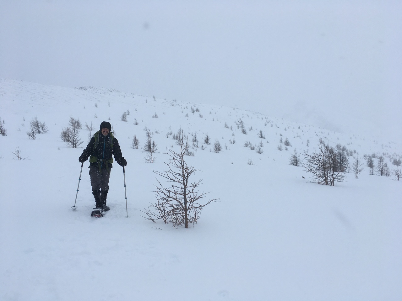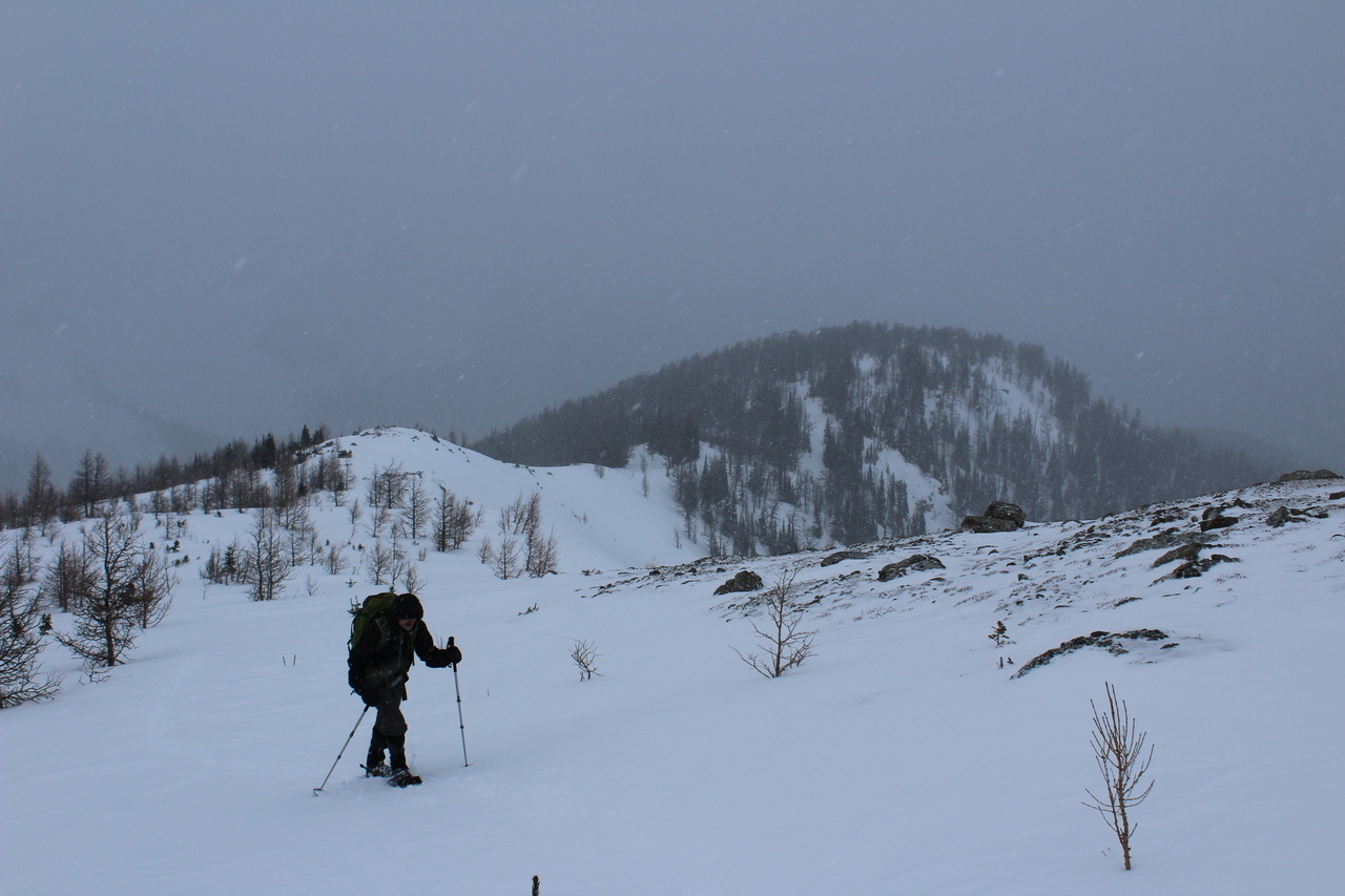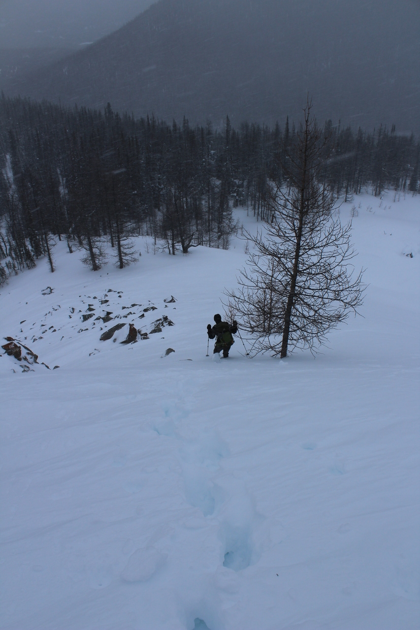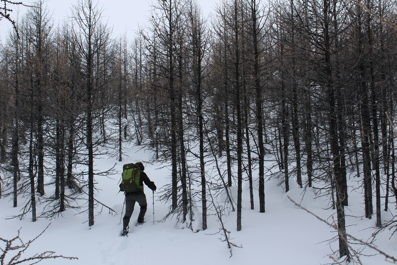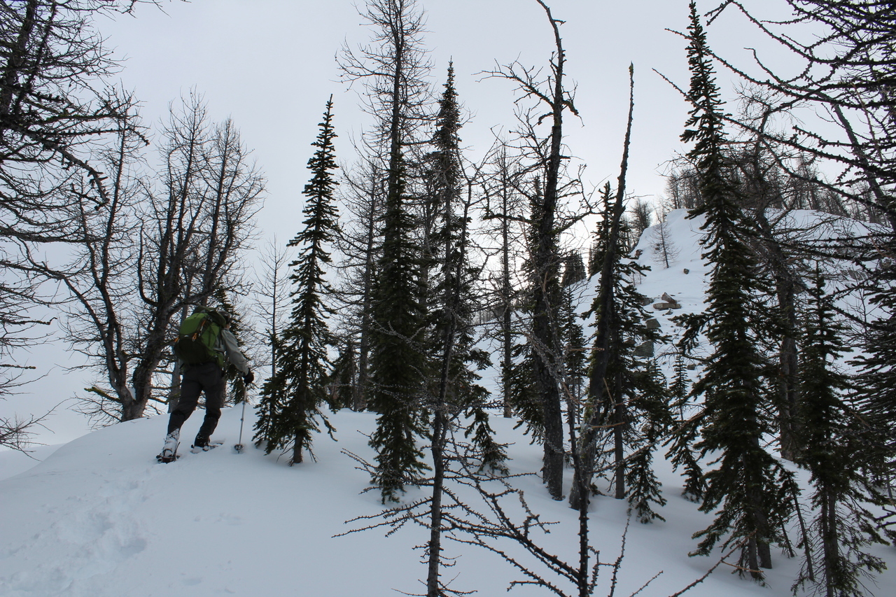 Starting up through larches (back on snowshoes) once past the steeper slope.