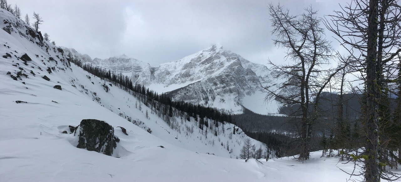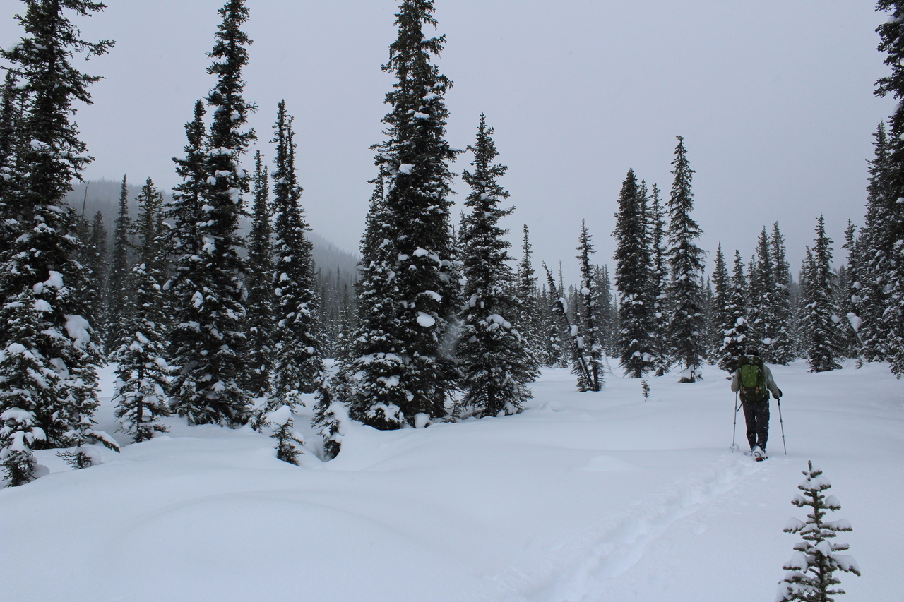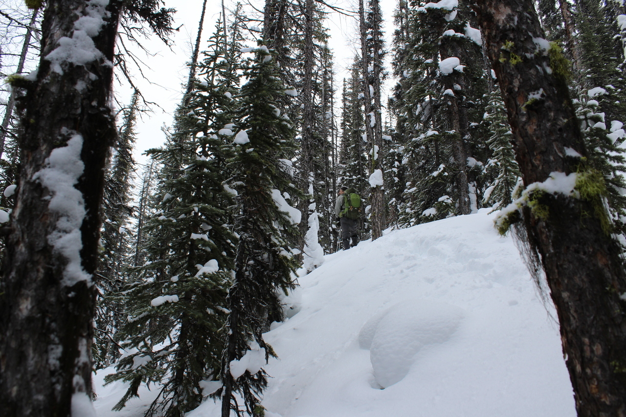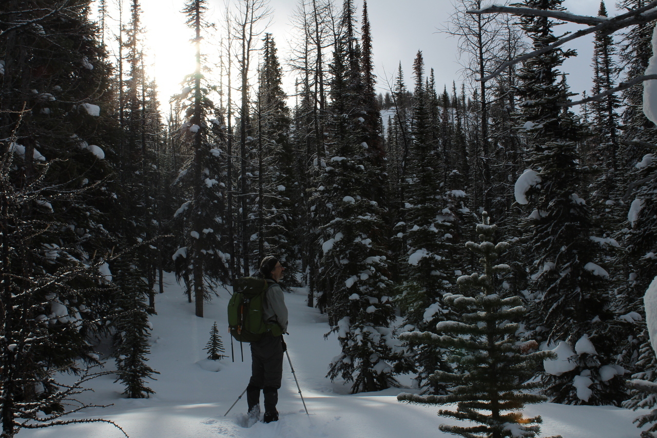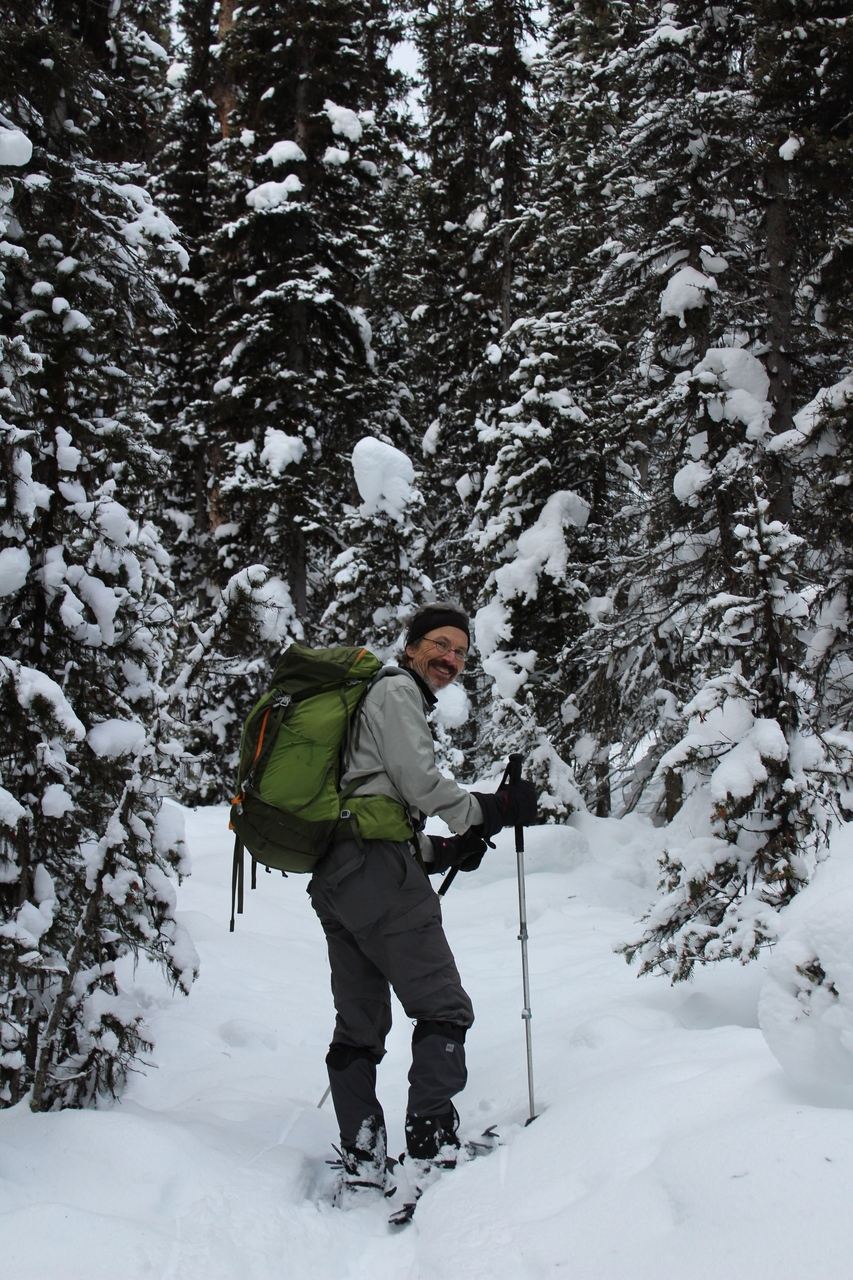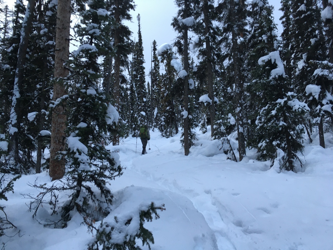 Starting up through larches (back on snowshoes) once past the steeper slope.