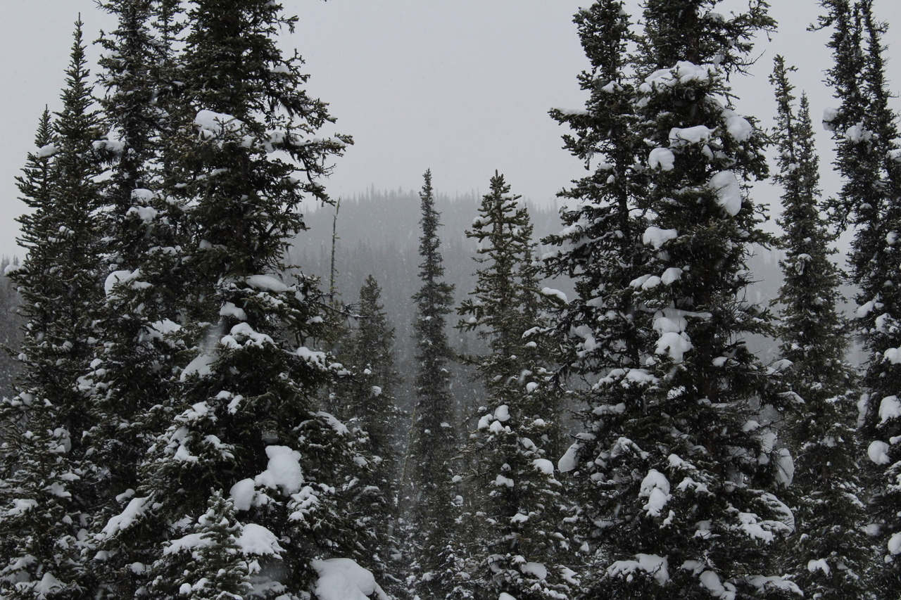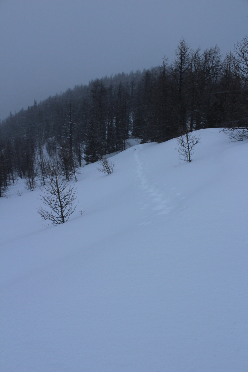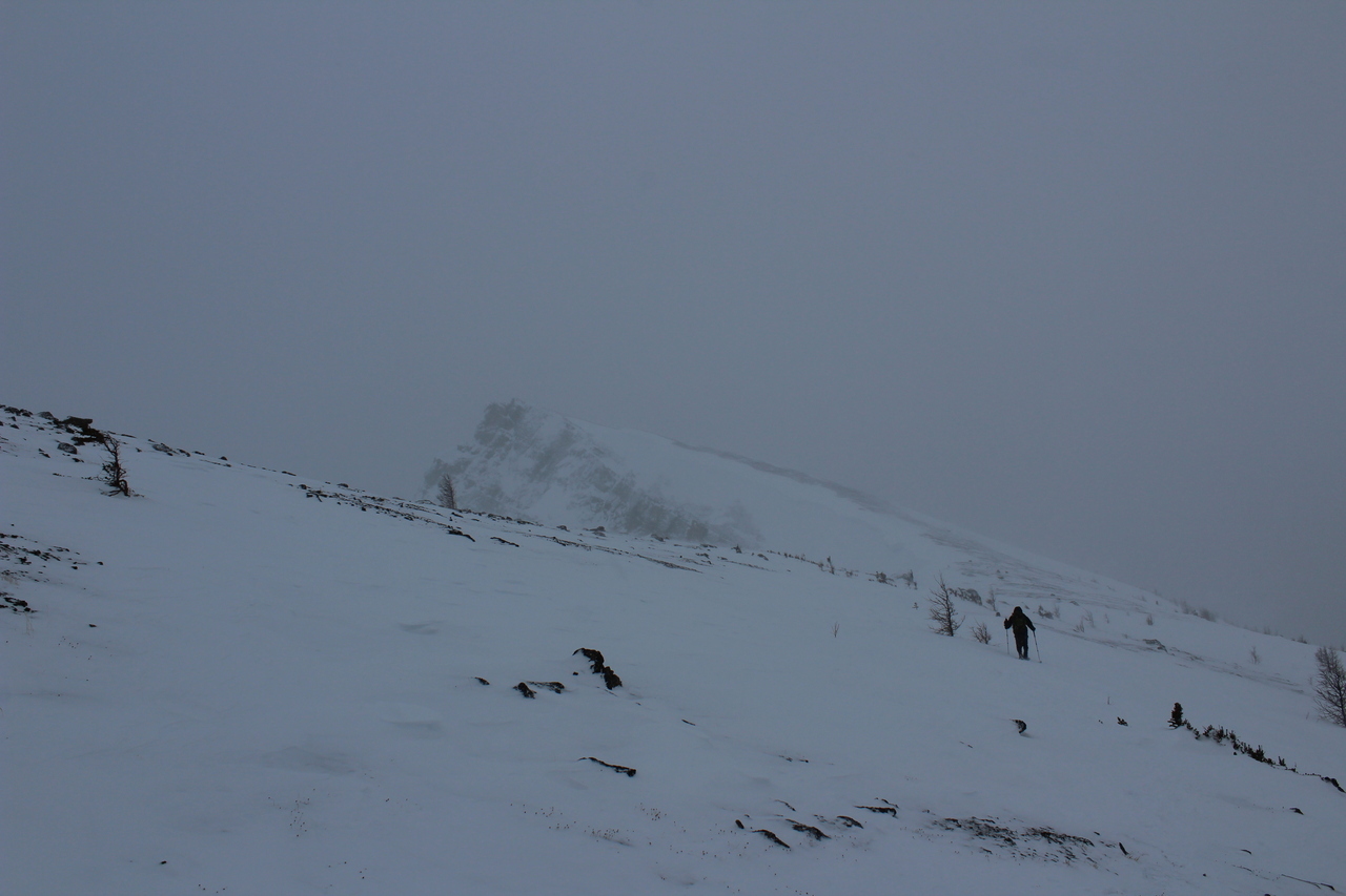 Looking up to the treed ridge we would aim for. Unfortunately the snow seemed like it was coming down harder and harder, and it was pretty disheartening, with still such a long ways to go in a complete whiteout :(
