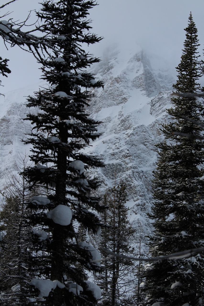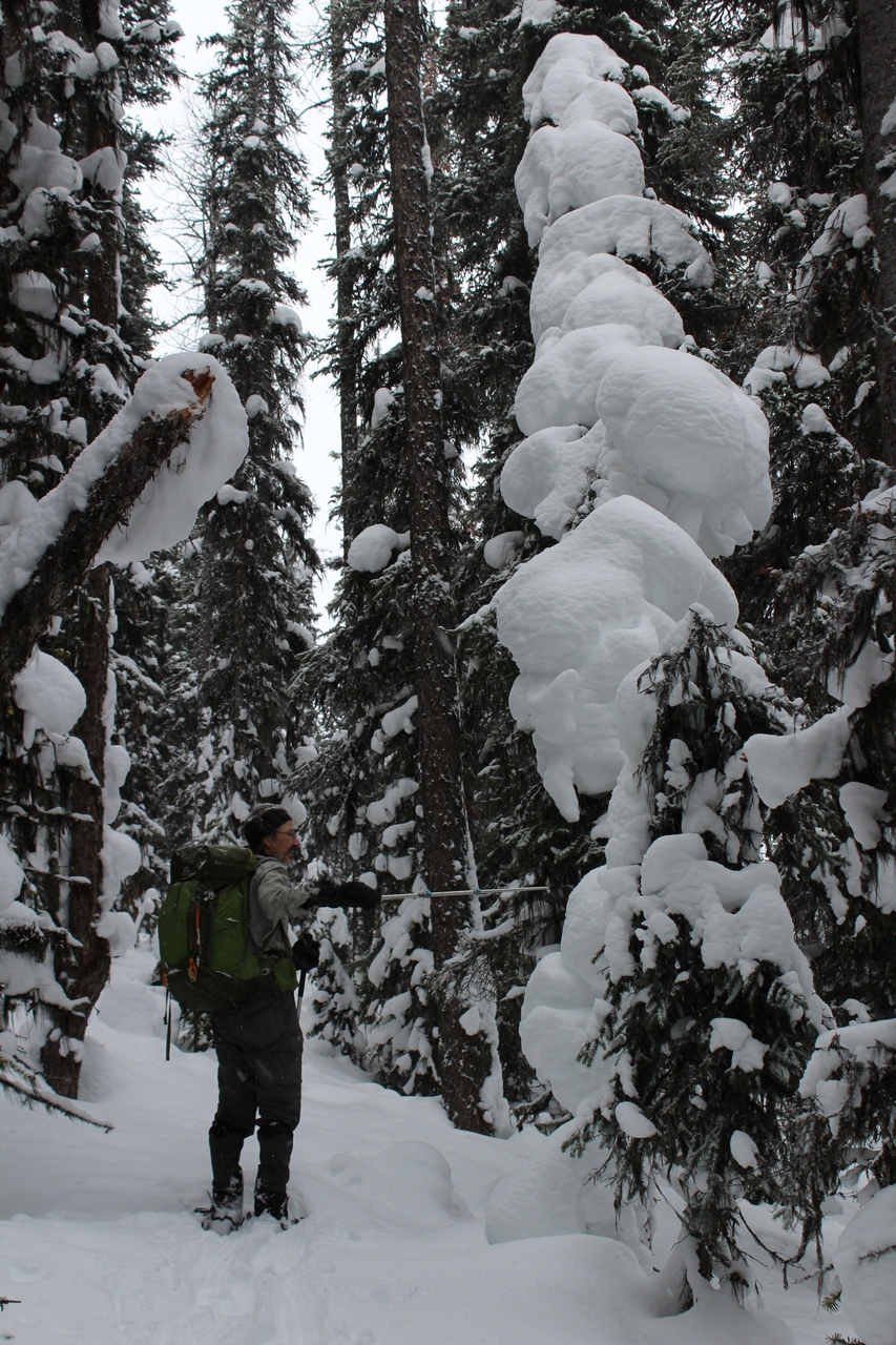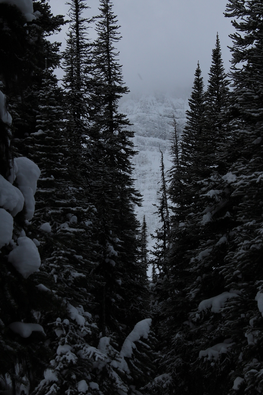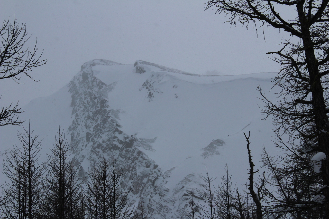 Looking up to the treed ridge we would aim for. Unfortunately the snow seemed like it was coming down harder and harder, and it was pretty disheartening, with still such a long ways to go in a complete whiteout :(