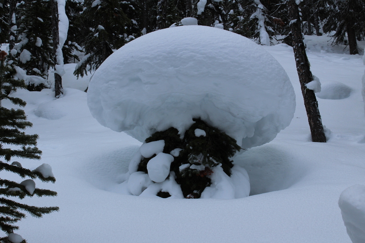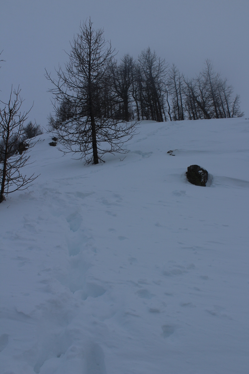 We started out, up the trail towards the Twin Lakes, around 7:30am. Unfortunately for us, this well broken trail soon branched off to Smith Lake (wrong way people!!), and we were left semi-breaking trail over older, "fading" tracks.