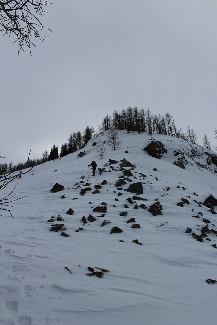 My dad starts up the rocky slope. Although this slope starts tame, it steepens significantly near the tree in the center. We started up with snowshoes, but switched to microspikes near the tree. The slope was extremely wind blown, and we wanted the security of digging our feet in, as there was no sense in risking a slip!