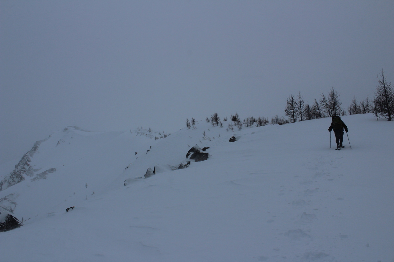 A long while later, we finally reached this clearing! We left the old ski tracks we were previously following at this point, and ascended to the ridge upper-left.