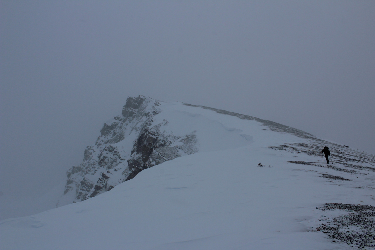 The summit completely vanishes from view as we traverse back around the false summit! Our tracks had already completely vanished!