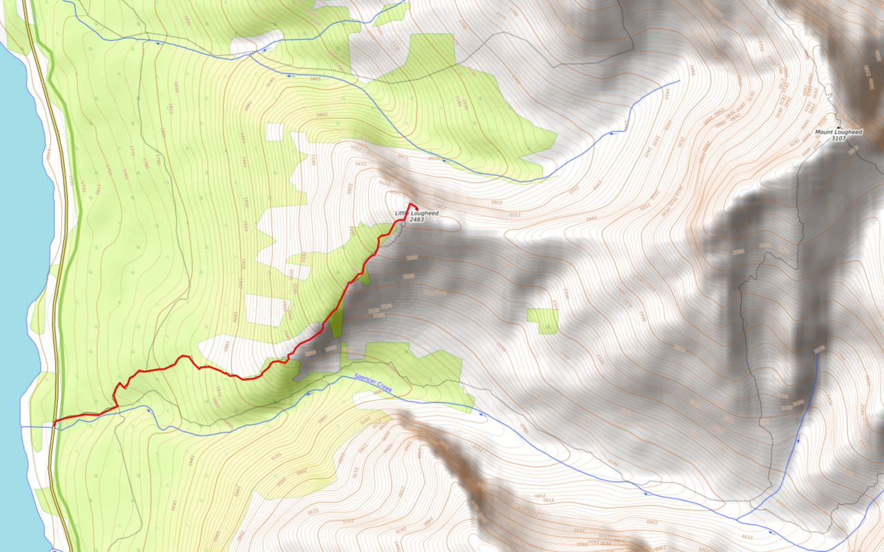 We soon reached a the junction in the trail (where going straight eventually leads to the ascent route up Mount Lougheed itself), and turned left, across a short bridge, and up the slopes to the north.