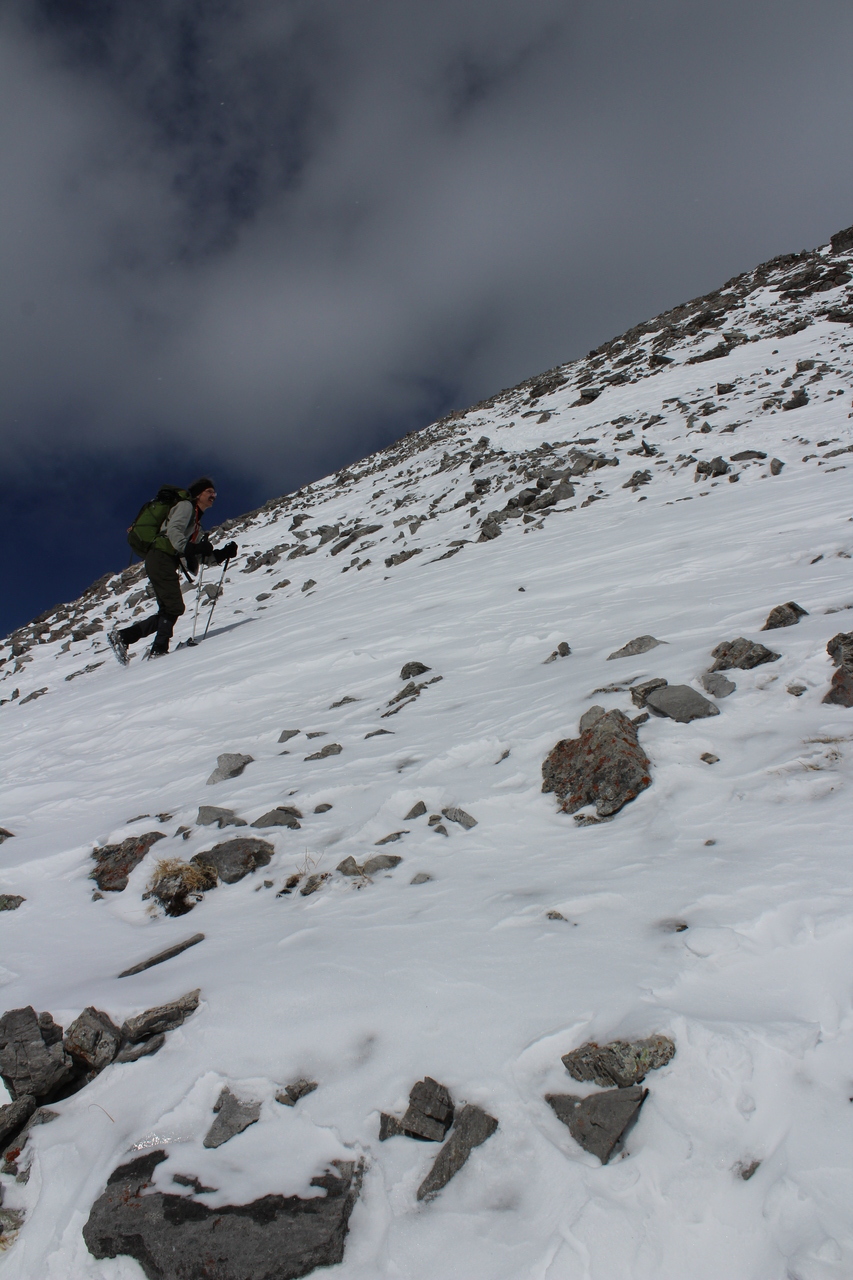 If snow-loaded, this final steep slope could pose serious avalanche concern! Lucky for us, the wind had helped us out, and it was just an easy, scree slog to the summit ridge. Remember to check the conditions from the highway, as being forced to turn around here would hurt big time!