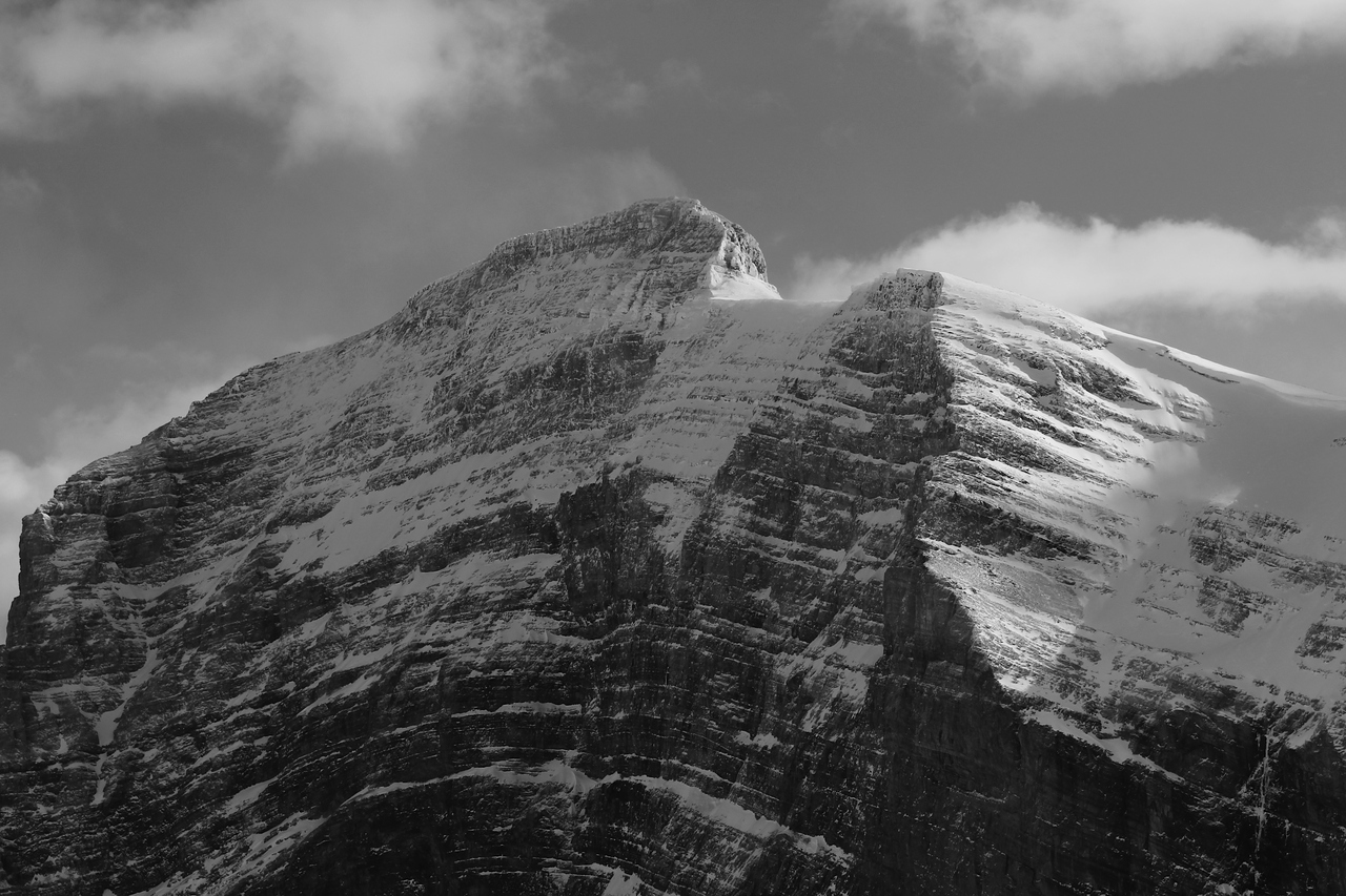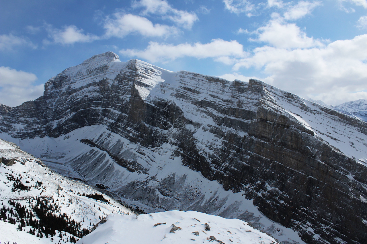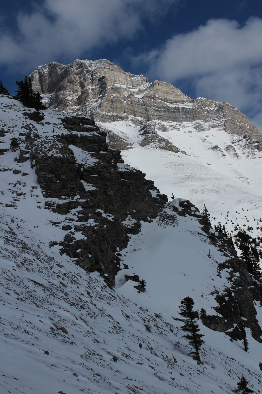 Close up of Lougheed's daunting cliffs! The summit sits at the end of the ridge, center.