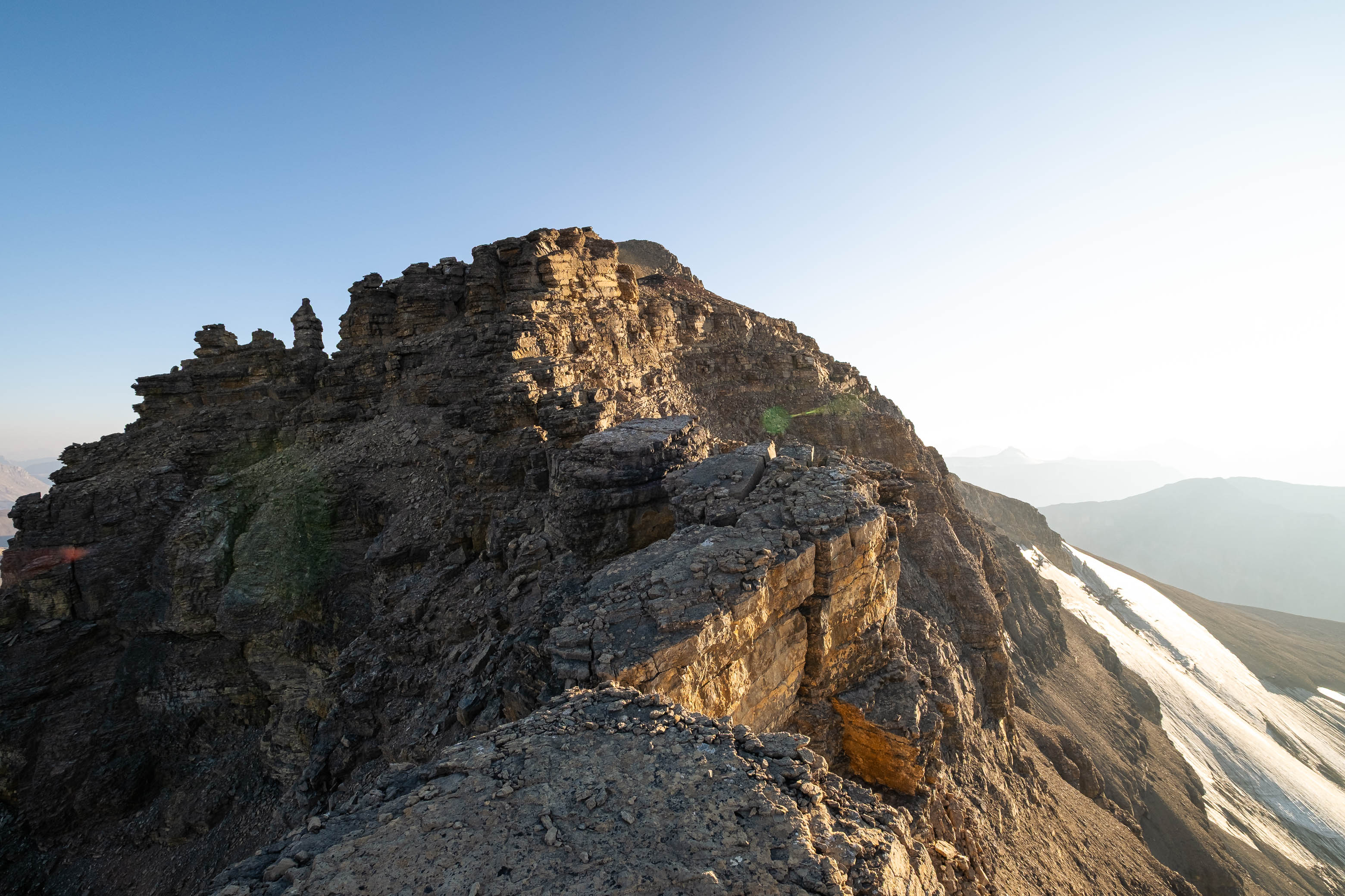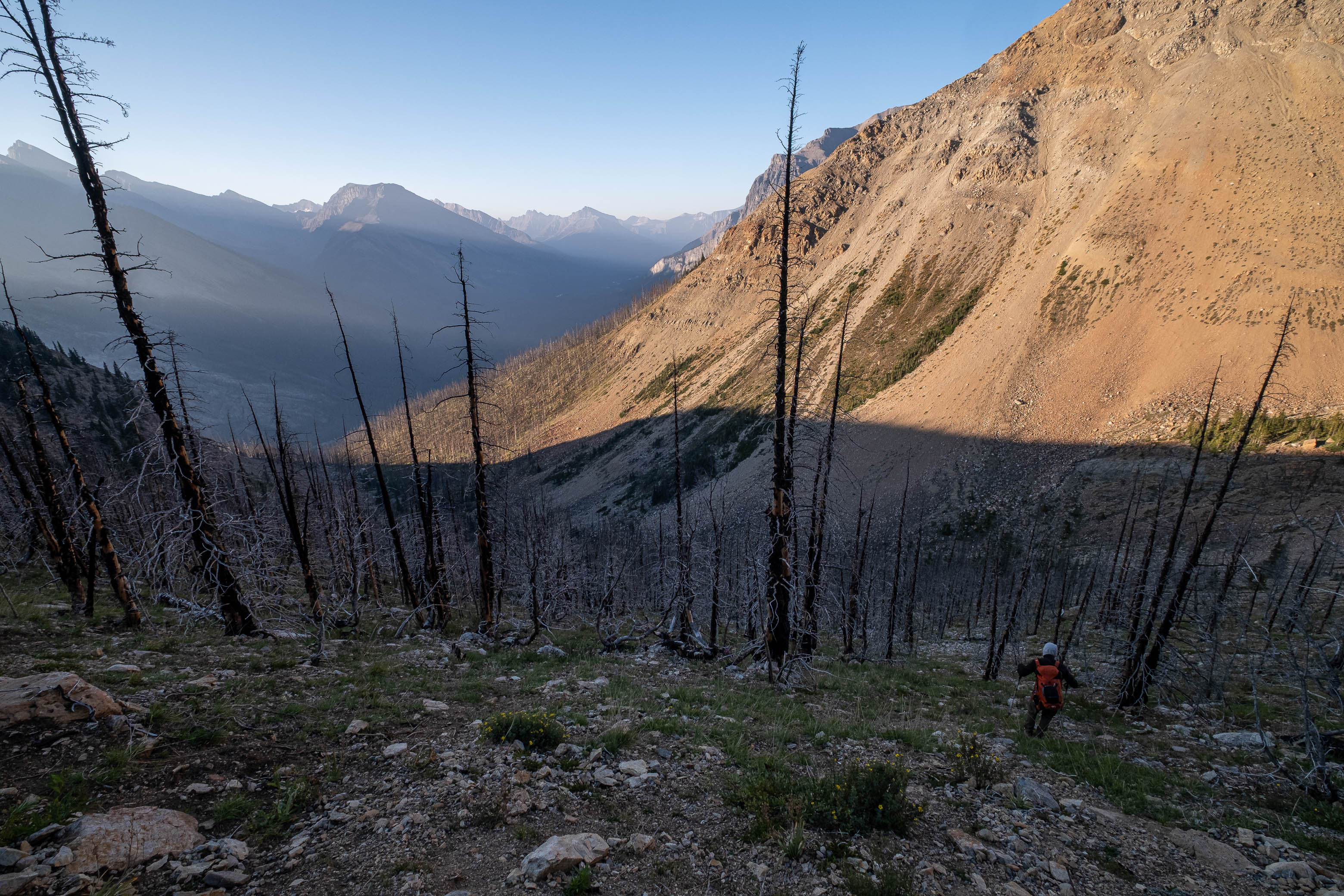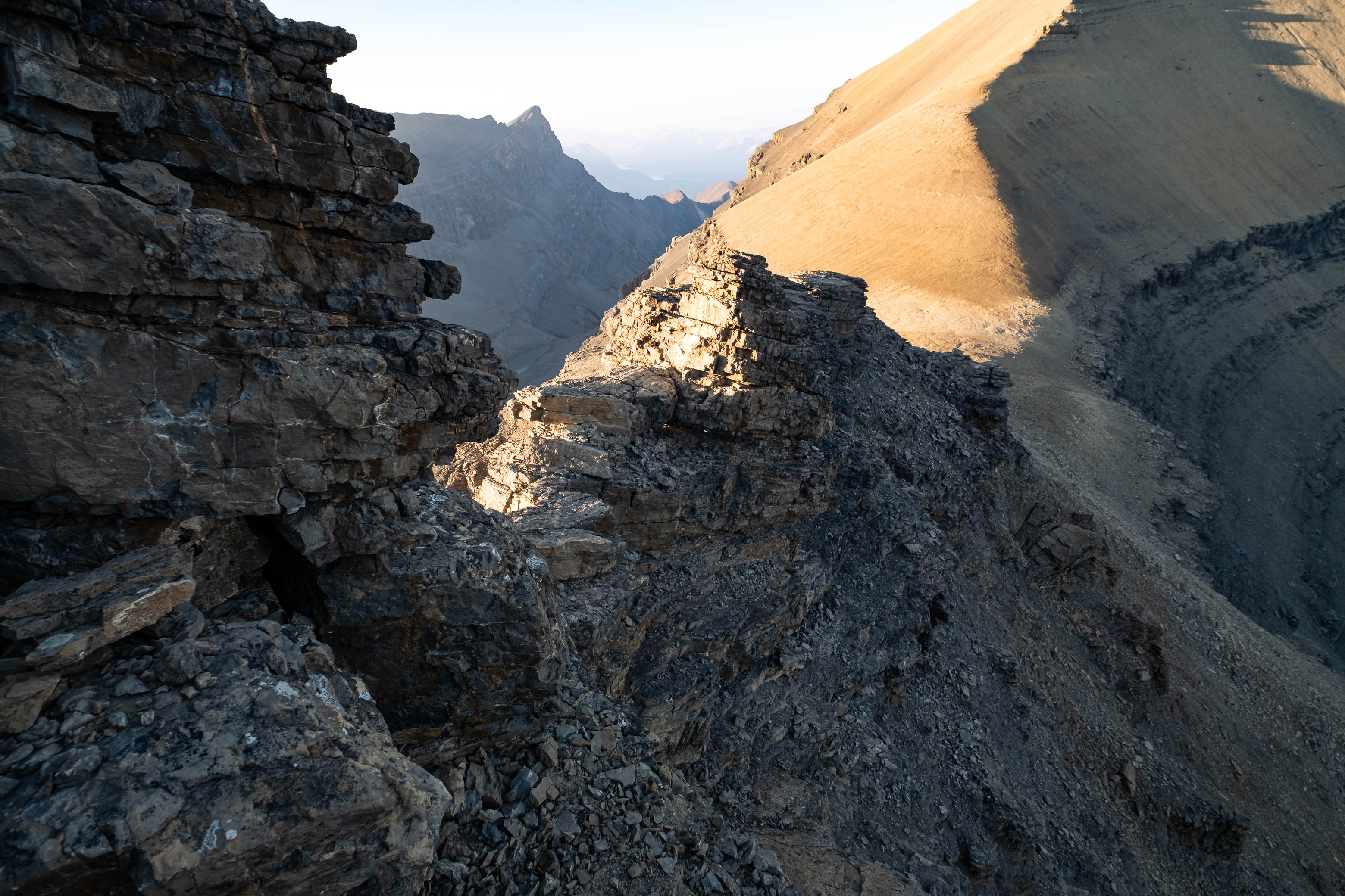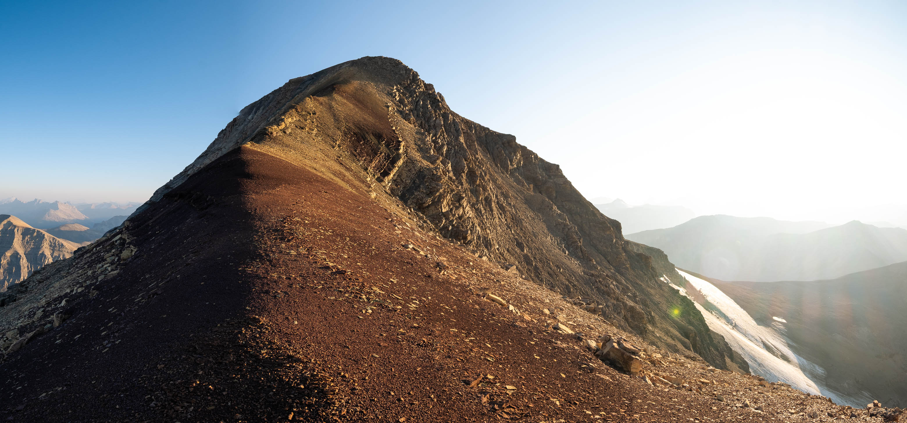We woke to a beautiful, blue bird morning in the hanging valley below our previous days' objective and didn't set off until around 08:00 after lazily packing up camp and loading up with water for what was bound to be another HOT one. The sun was just cresting over Siffleur's lower SE ridge, illuminating the valley in a sea of warm, golden light and as hard as it was to pull ourselves away from this small piece of heaven, we had another big day ahead of us and we were already starting it a few kilometers behind schedule.