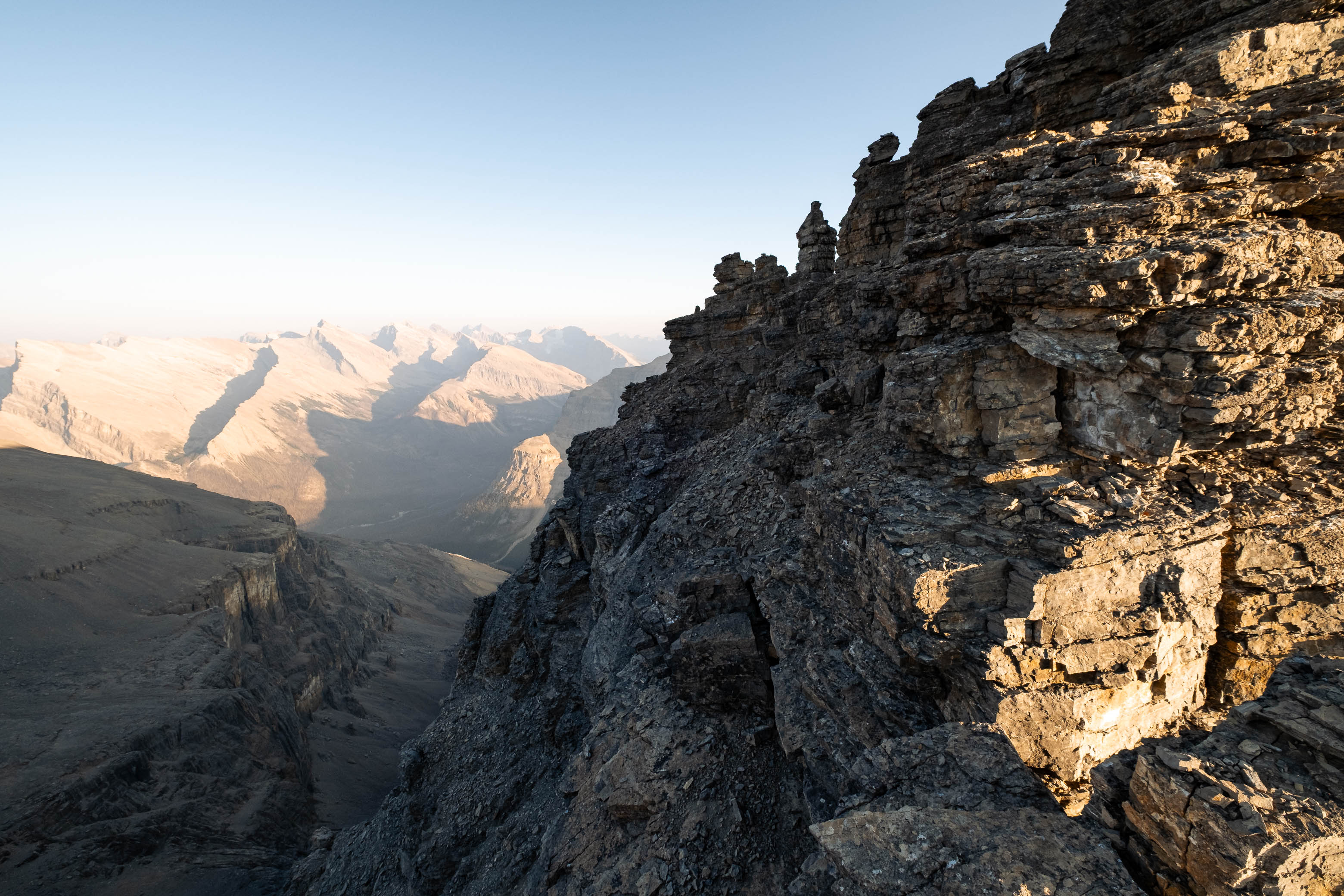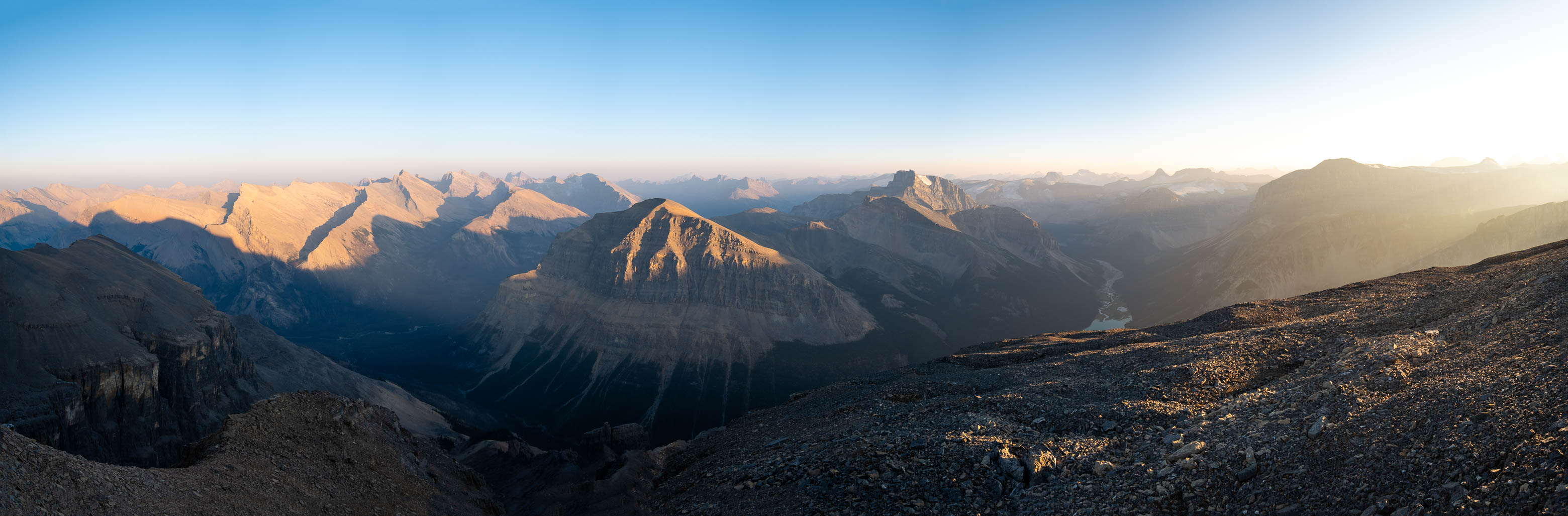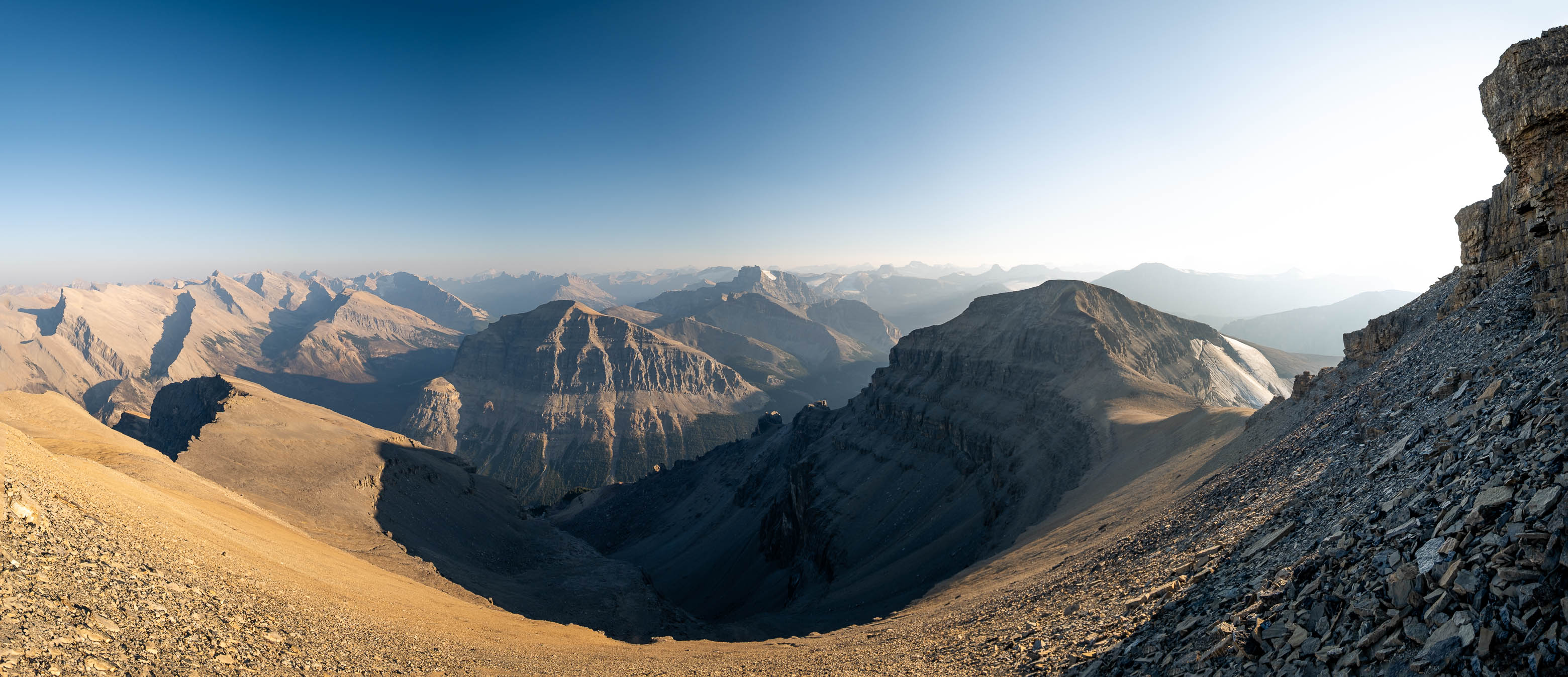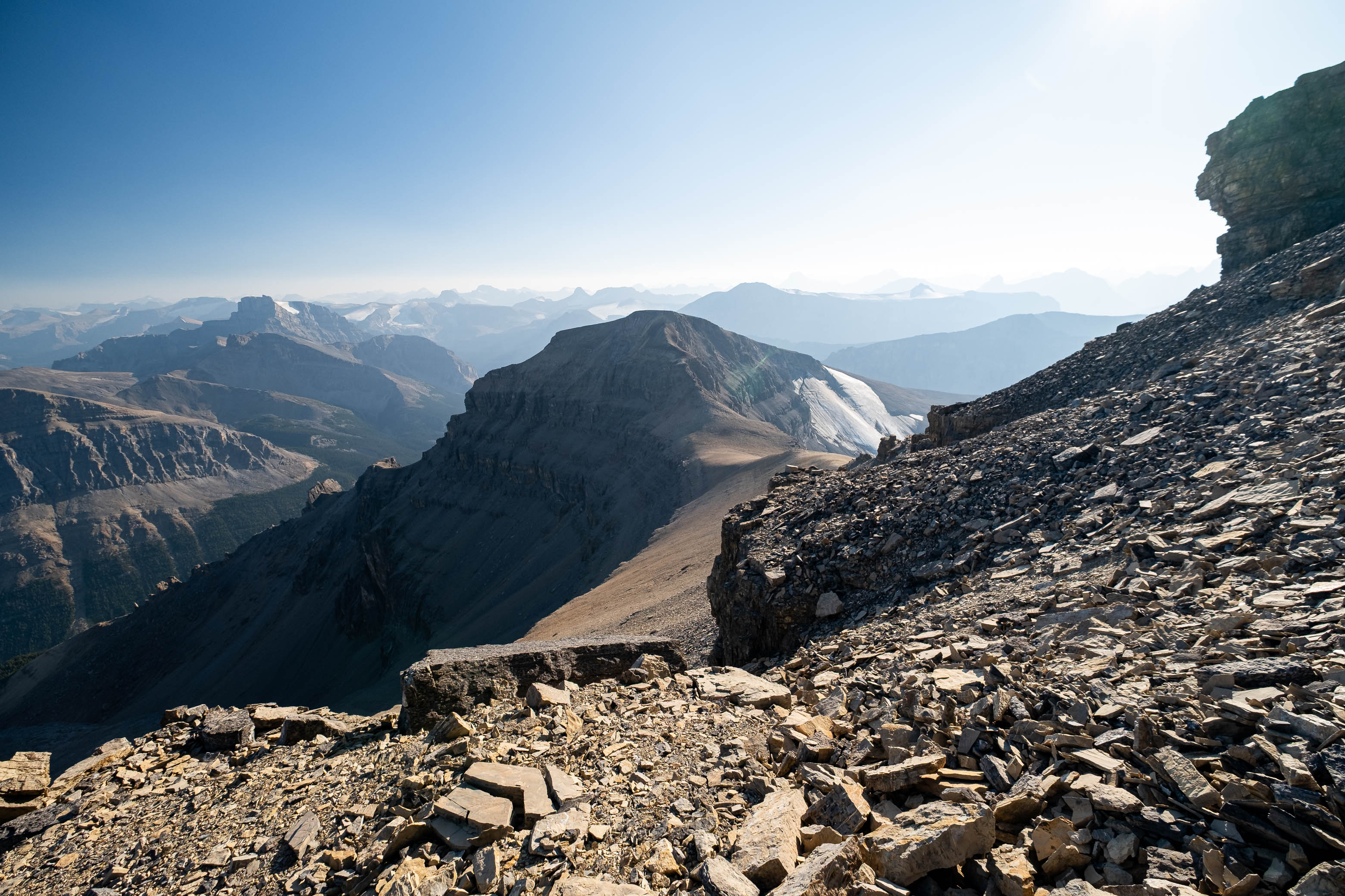 We woke to a beautiful, blue bird morning in the hanging valley below our previous days' objective and didn't set off until around 08:00 after lazily packing up camp and loading up with water for what was bound to be another HOT one. The sun was just cresting over Siffleur's lower SE ridge, illuminating the valley in a sea of warm, golden light and as hard as it was to pull ourselves away from this small piece of heaven, we had another big day ahead of us and we were already starting it a few kilometers behind schedule.