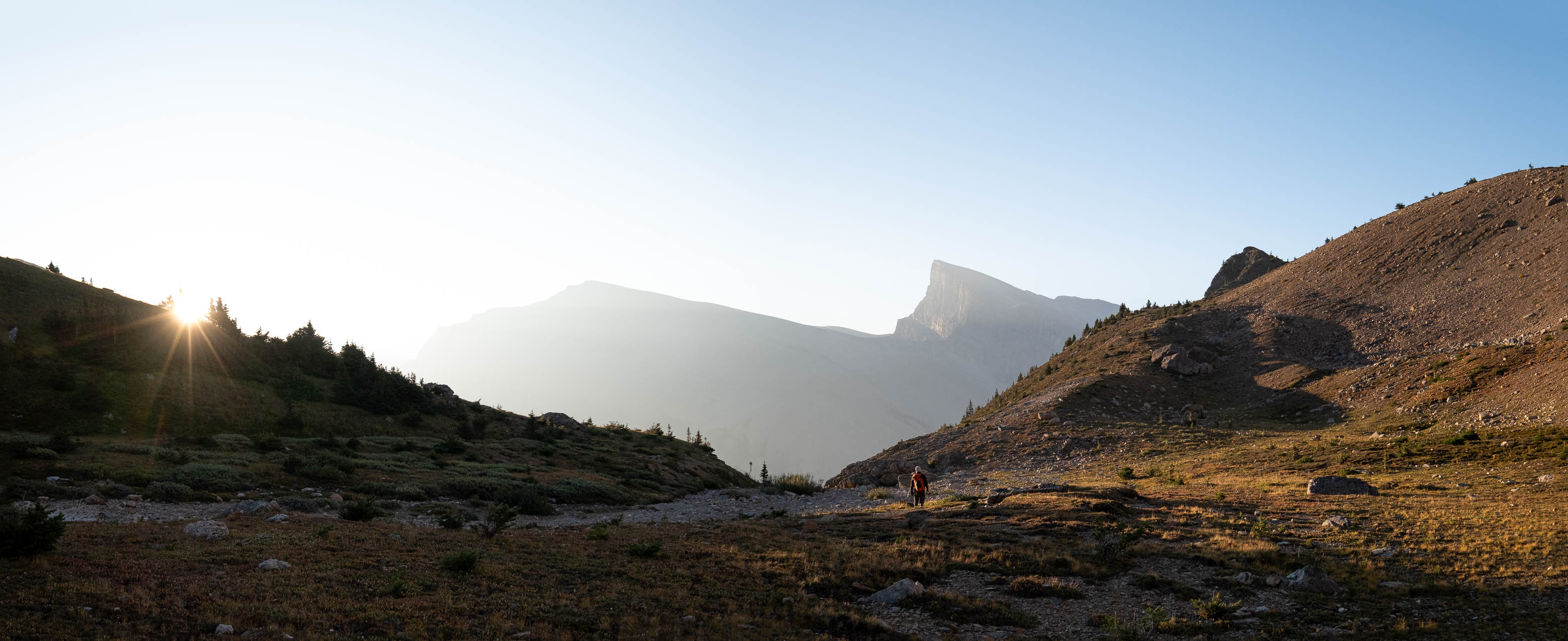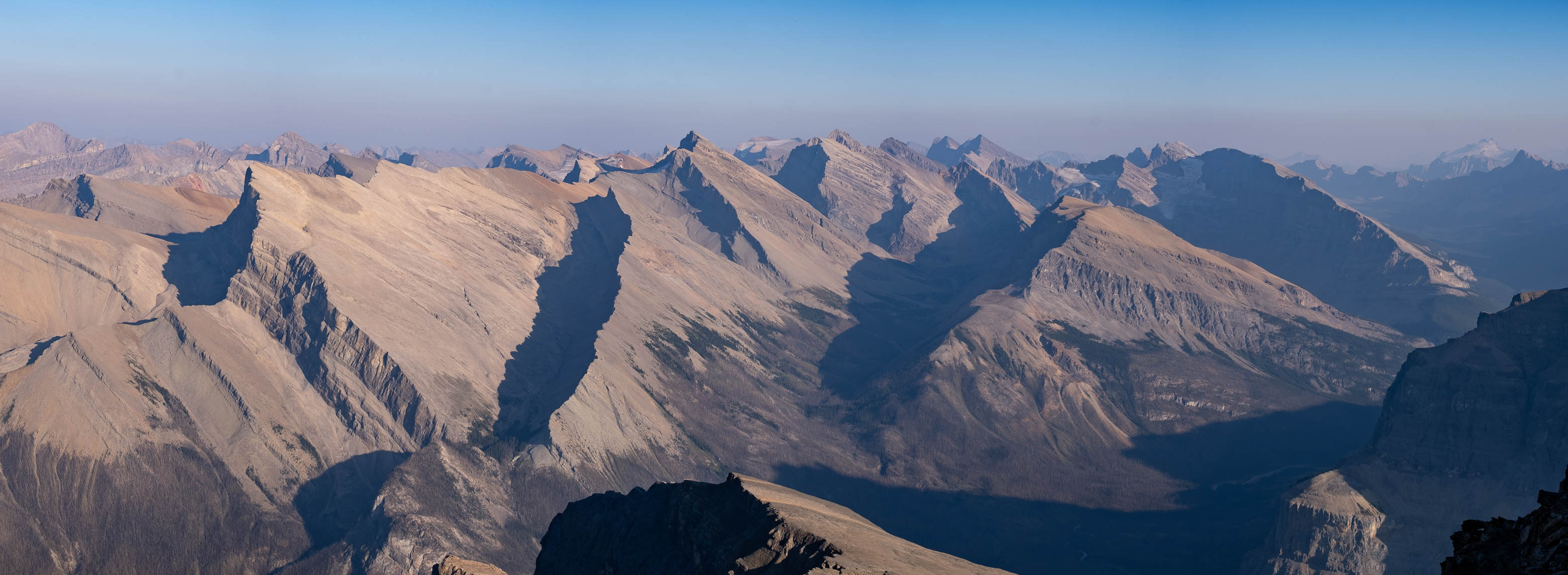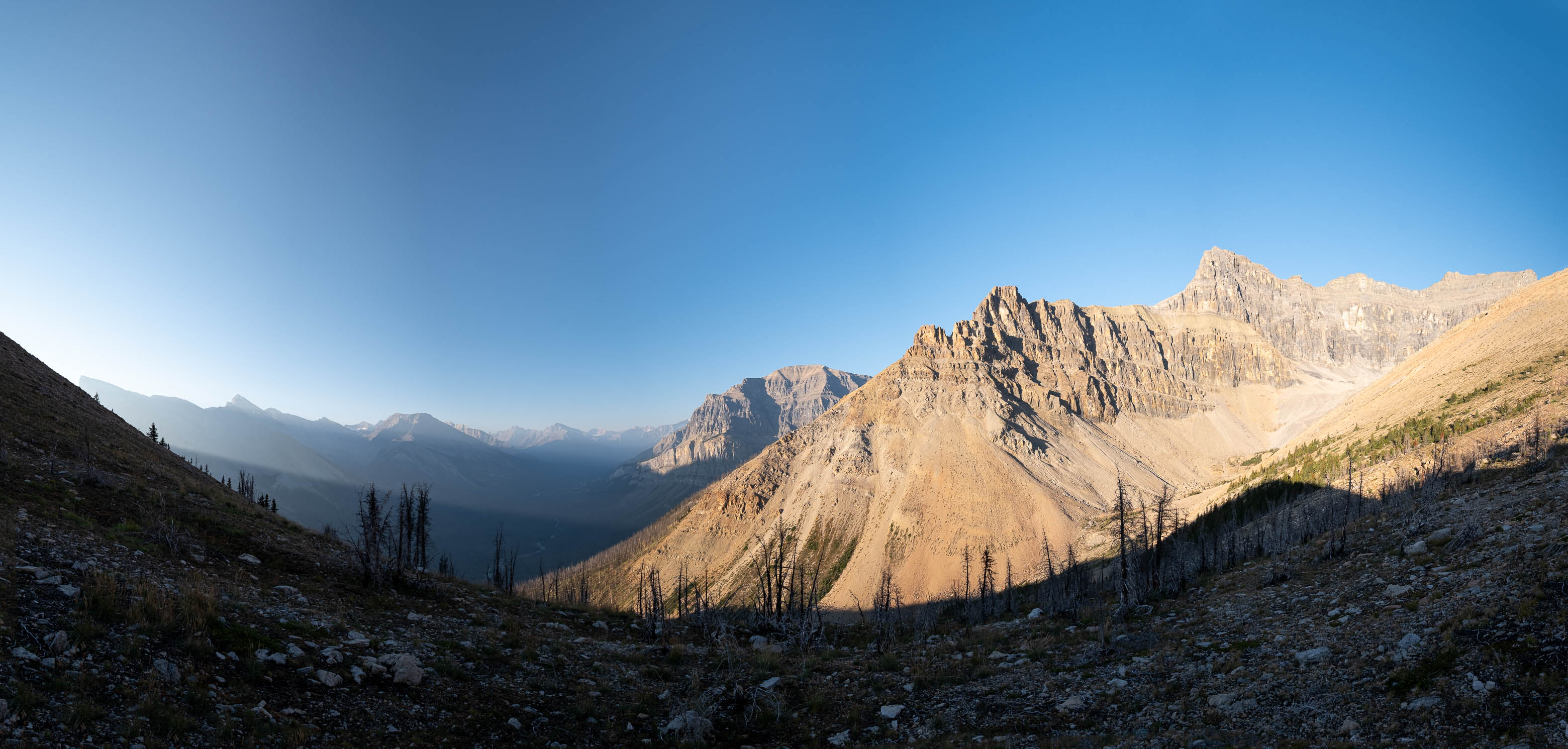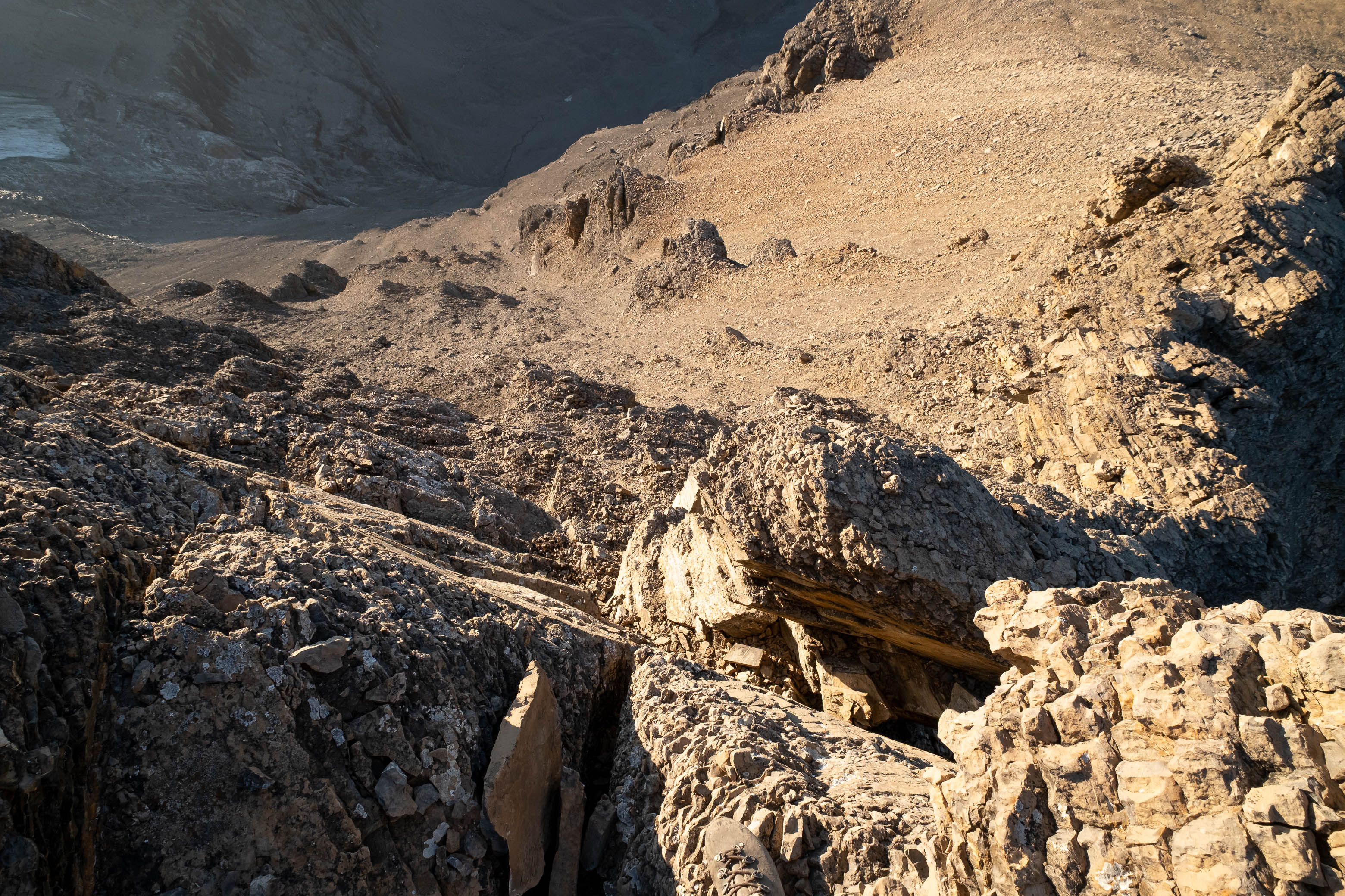 We woke to a beautiful, blue bird morning in the hanging valley below our previous days' objective and didn't set off until around 08:00 after lazily packing up camp and loading up with water for what was bound to be another HOT one. The sun was just cresting over Siffleur's lower SE ridge, illuminating the valley in a sea of warm, golden light and as hard as it was to pull ourselves away from this small piece of heaven, we had another big day ahead of us and we were already starting it a few kilometers behind schedule.