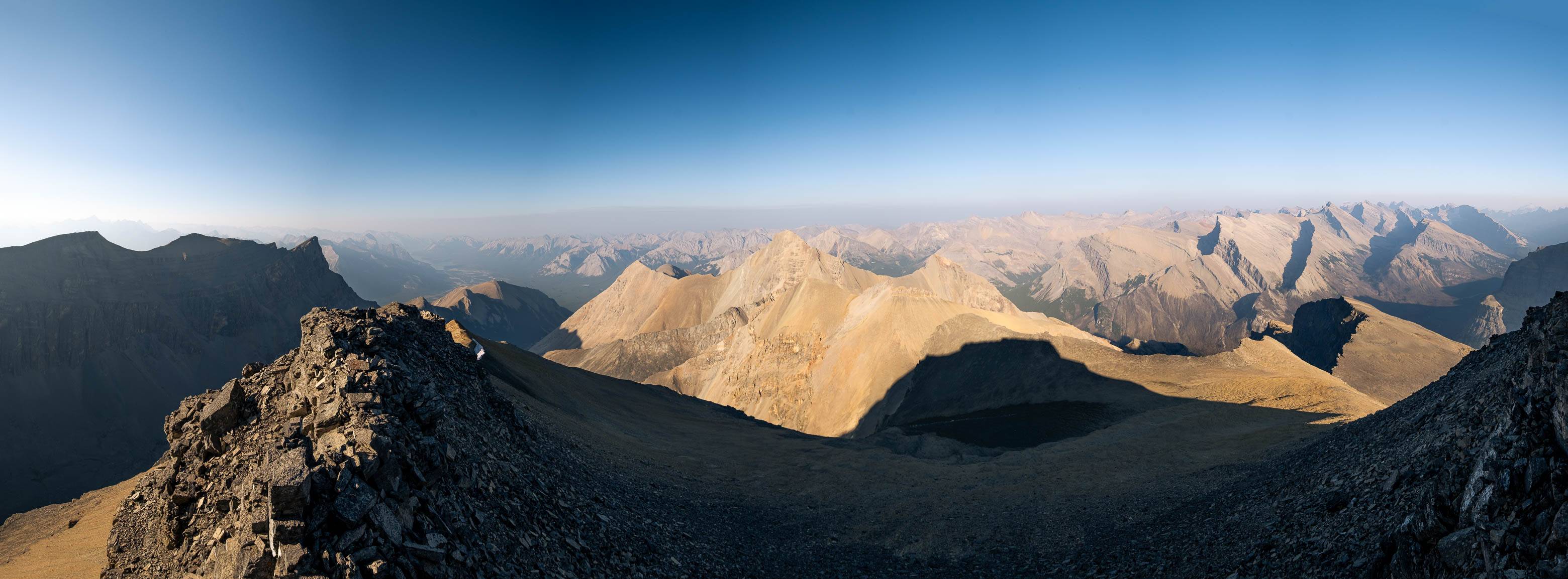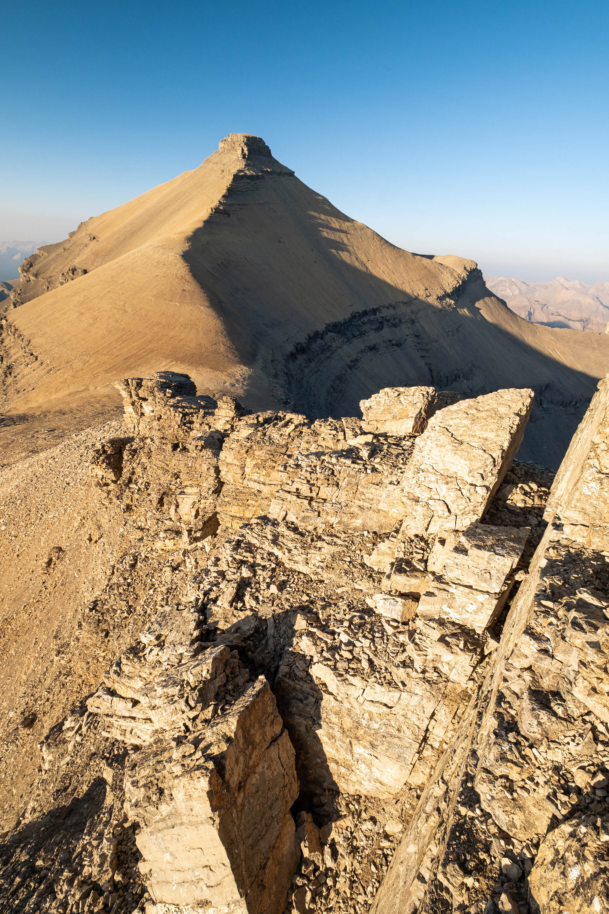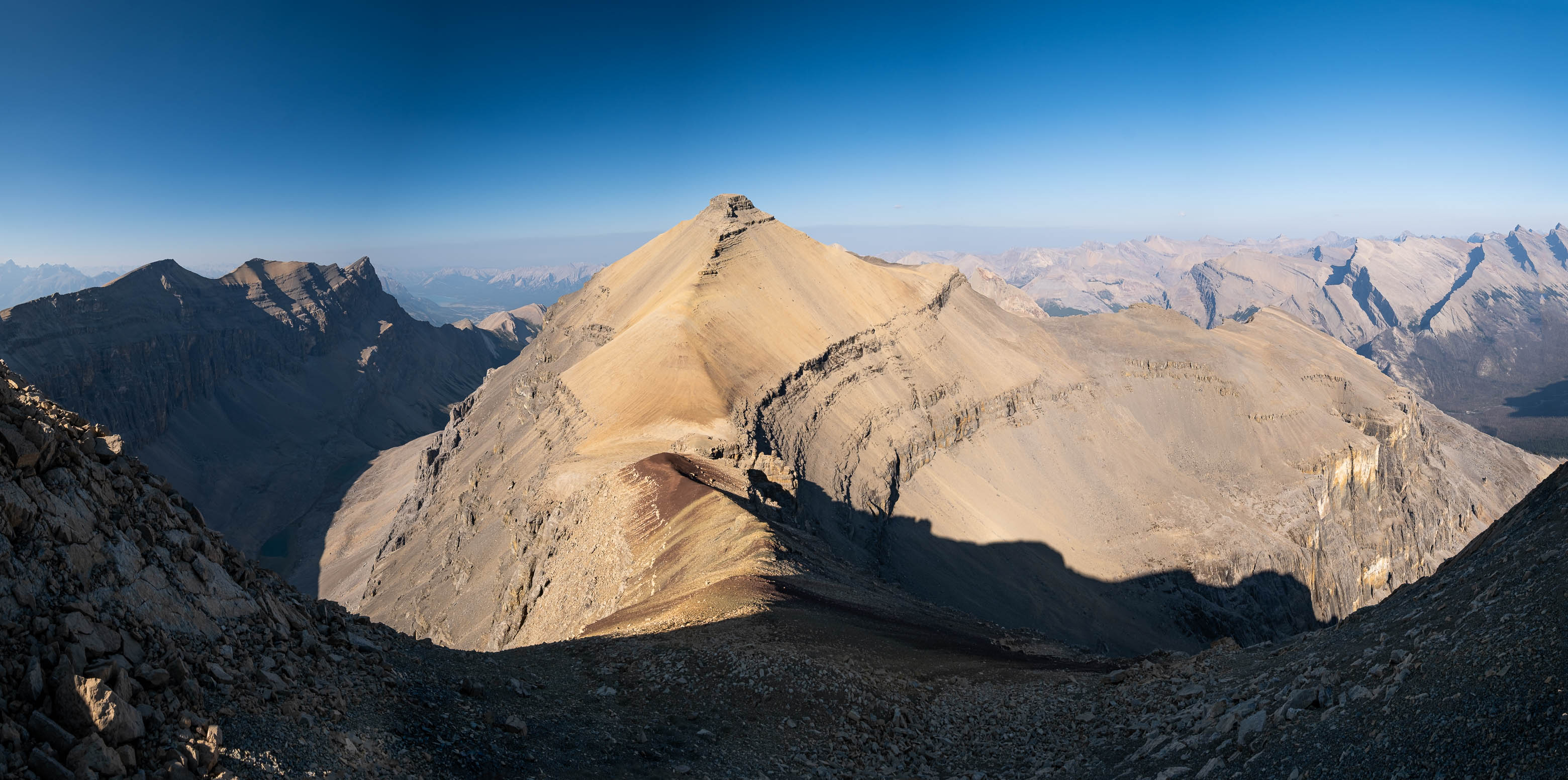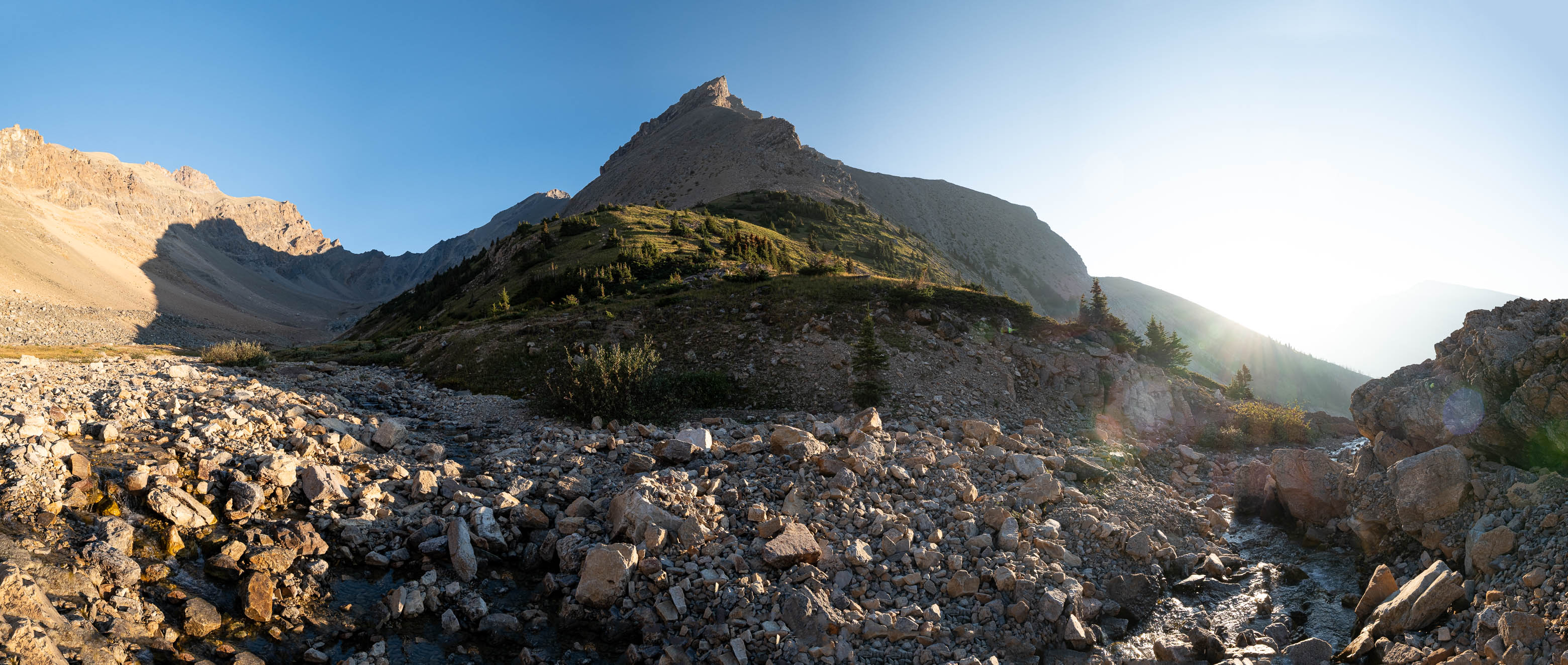We woke to a beautiful, blue bird morning in the hanging valley below our previous days' objective and didn't set off until around 08:00 after lazily packing up camp and loading up with water for what was bound to be another HOT one. The sun was just cresting over Siffleur's lower SE ridge, illuminating the valley in a sea of warm, golden light and as hard as it was to pull ourselves away from this small piece of heaven, we had another big day ahead of us and we were already starting it a few kilometers behind schedule.