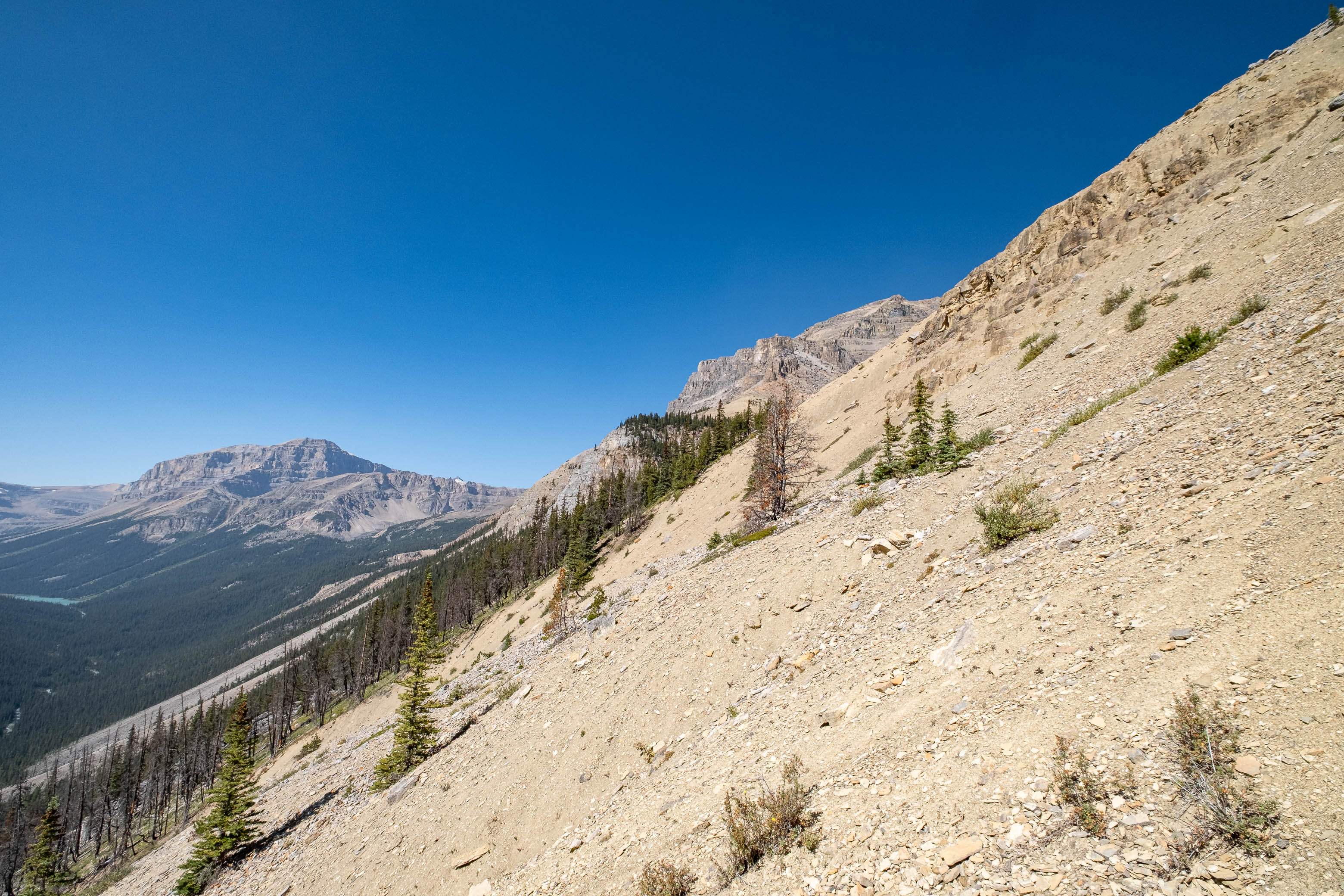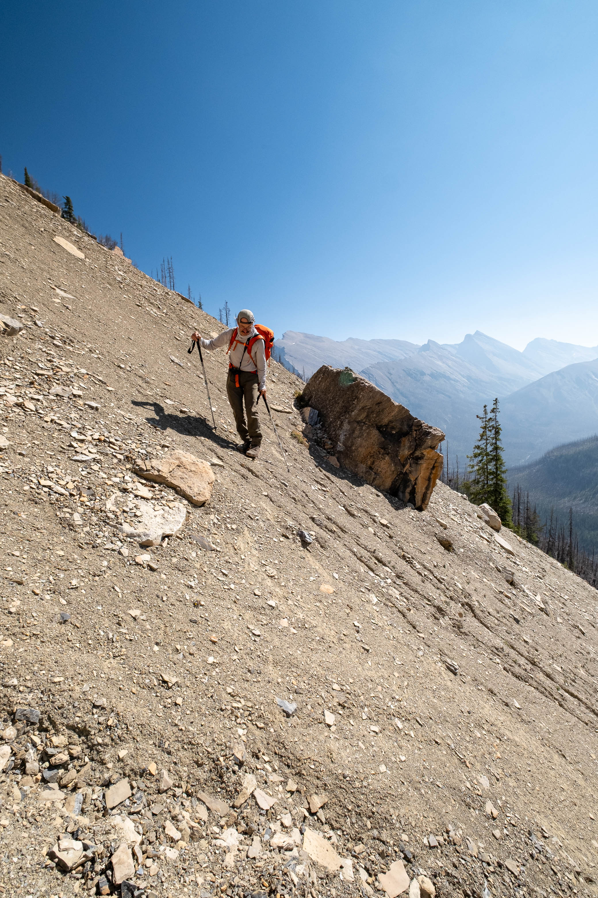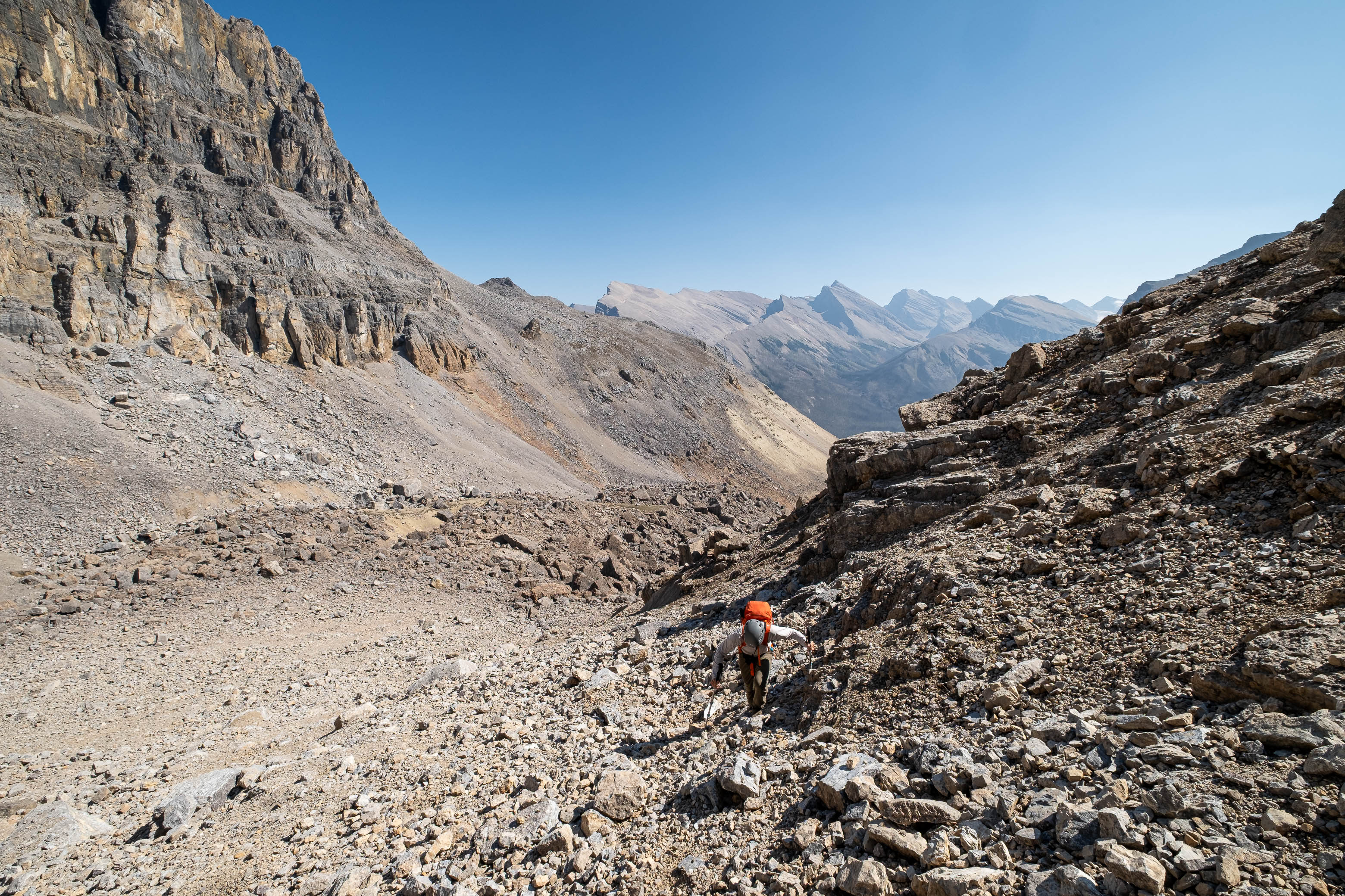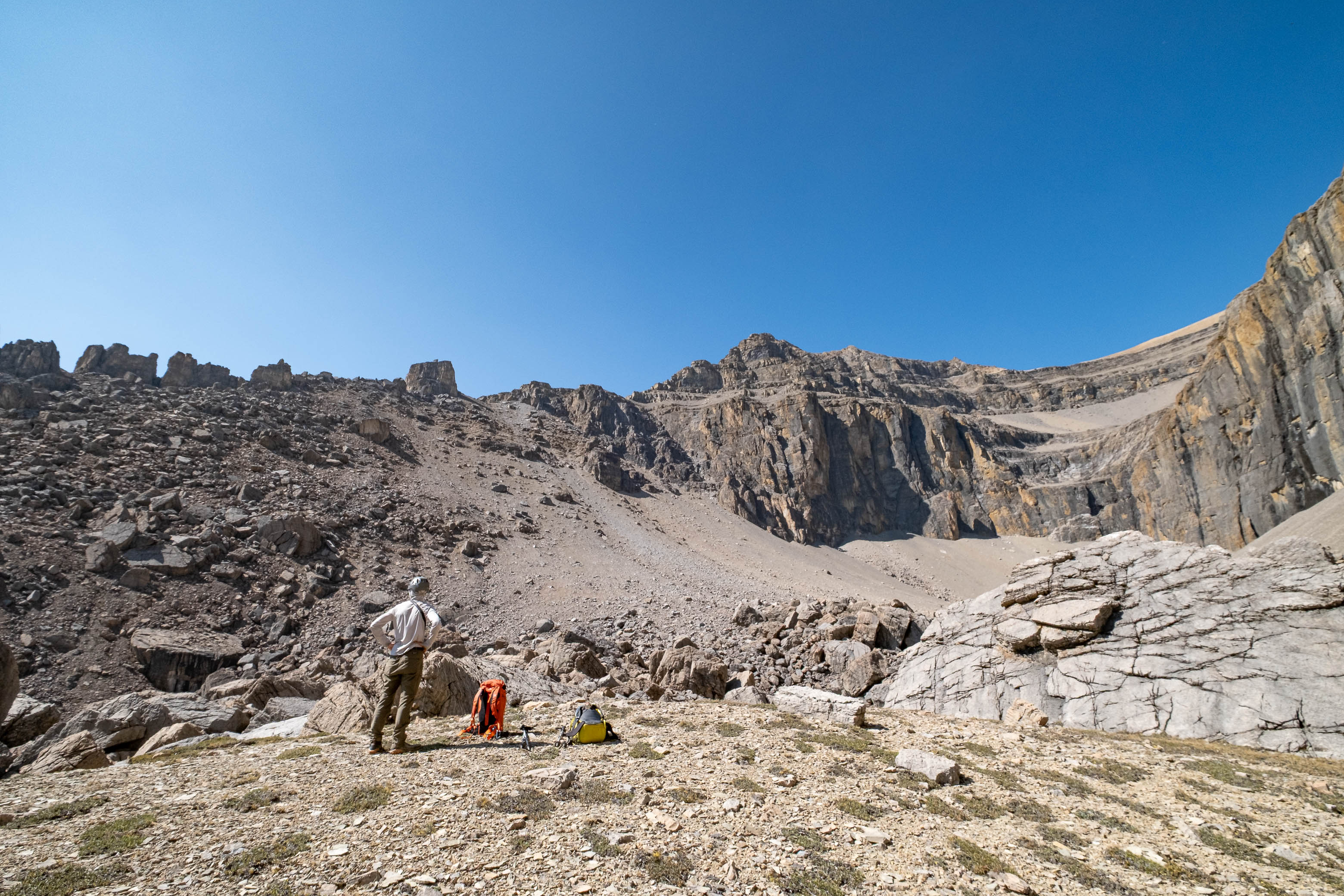 I was both excited and nervous to start up my exploratory route, but first we had a serious problem to address, and that problem was water. We'd been hiking in direct sun for hours since our last water source down at Porcupine Creek and we still had one vertical kilometer of south-facing slopes to go! I was counting on finding a small outlet stream at the mouth of the hanging valley, but unlike Siffleur, this valley was 100% bone dry. I convinced myself that I could ration what little water I had left, but my dad kept things real and made it clear that this would be the end of the road for him if we didn't find some fluids.