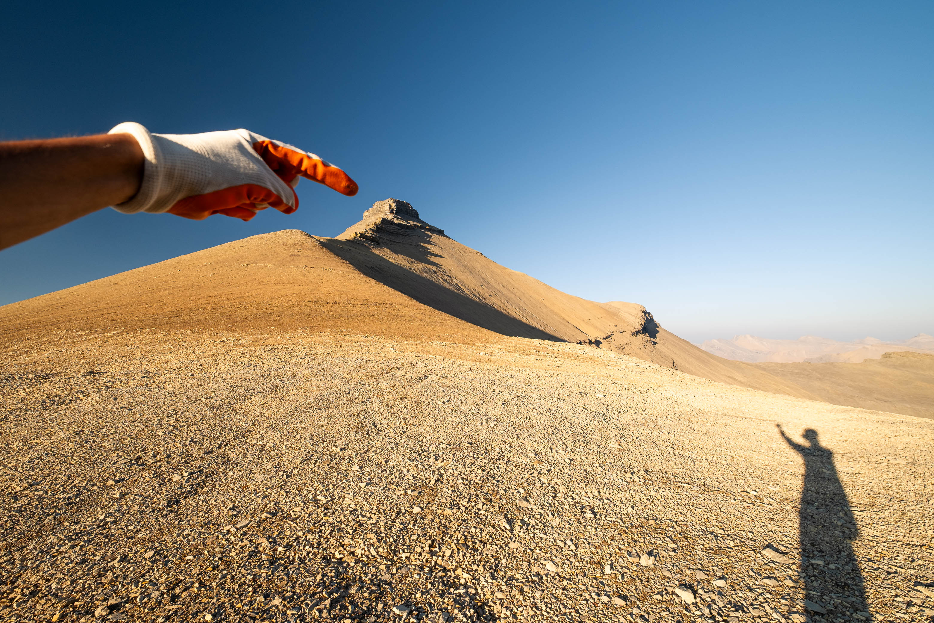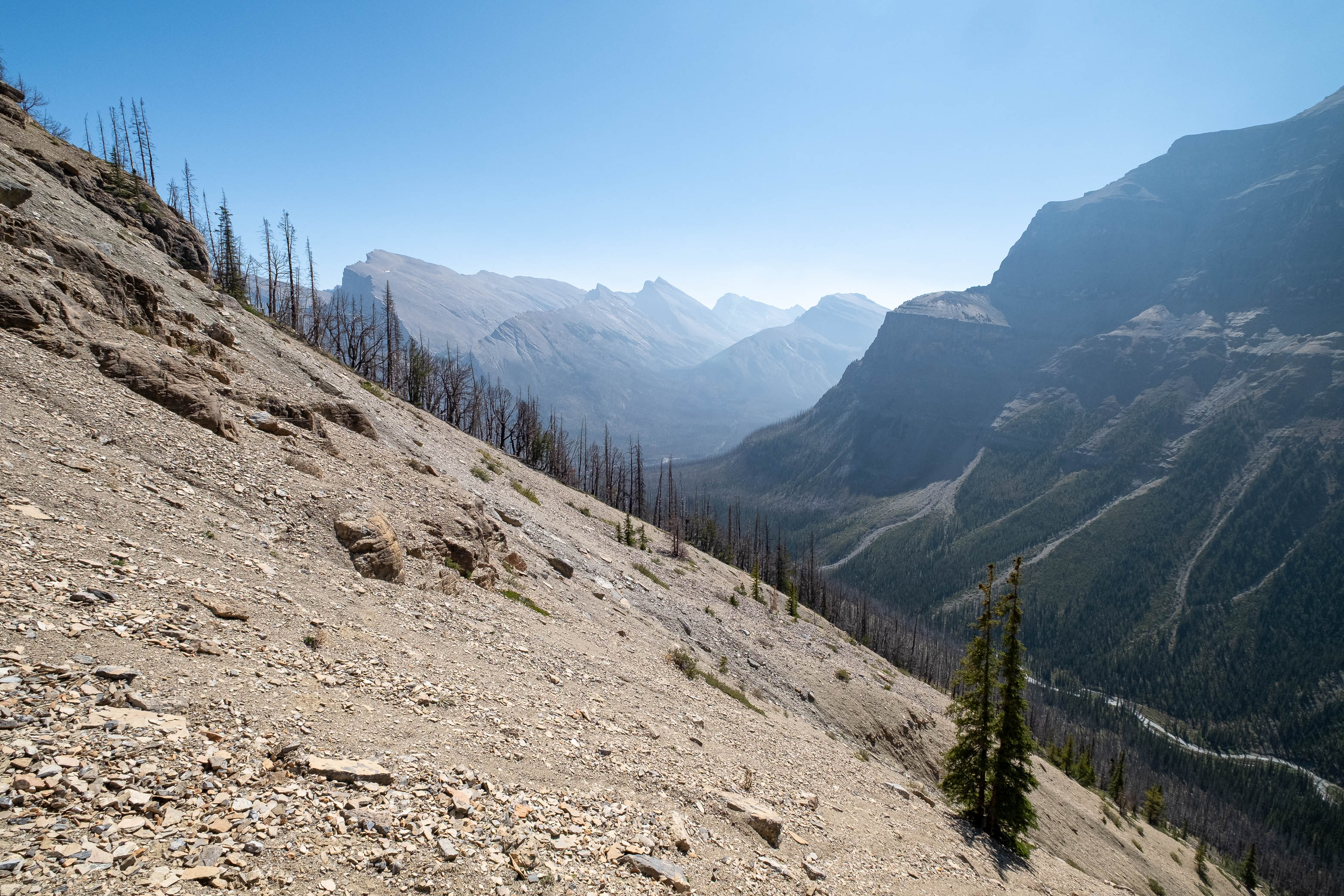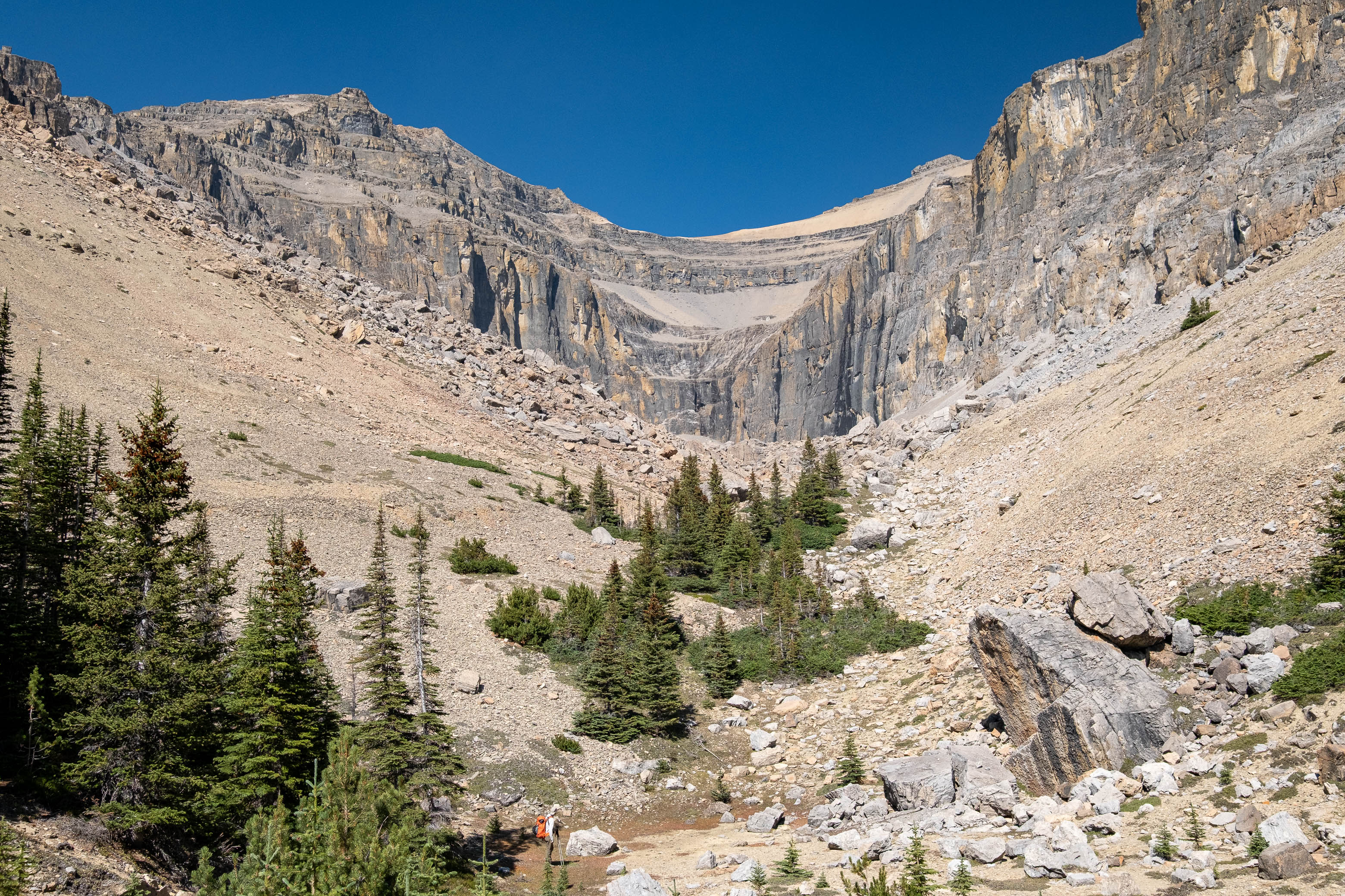 I was both excited and nervous to start up my exploratory route, but first we had a serious problem to address, and that problem was water. We'd been hiking in direct sun for hours since our last water source down at Porcupine Creek and we still had one vertical kilometer of south-facing slopes to go! I was counting on finding a small outlet stream at the mouth of the hanging valley, but unlike Siffleur, this valley was 100% bone dry. I convinced myself that I could ration what little water I had left, but my dad kept things real and made it clear that this would be the end of the road for him if we didn't find some fluids.